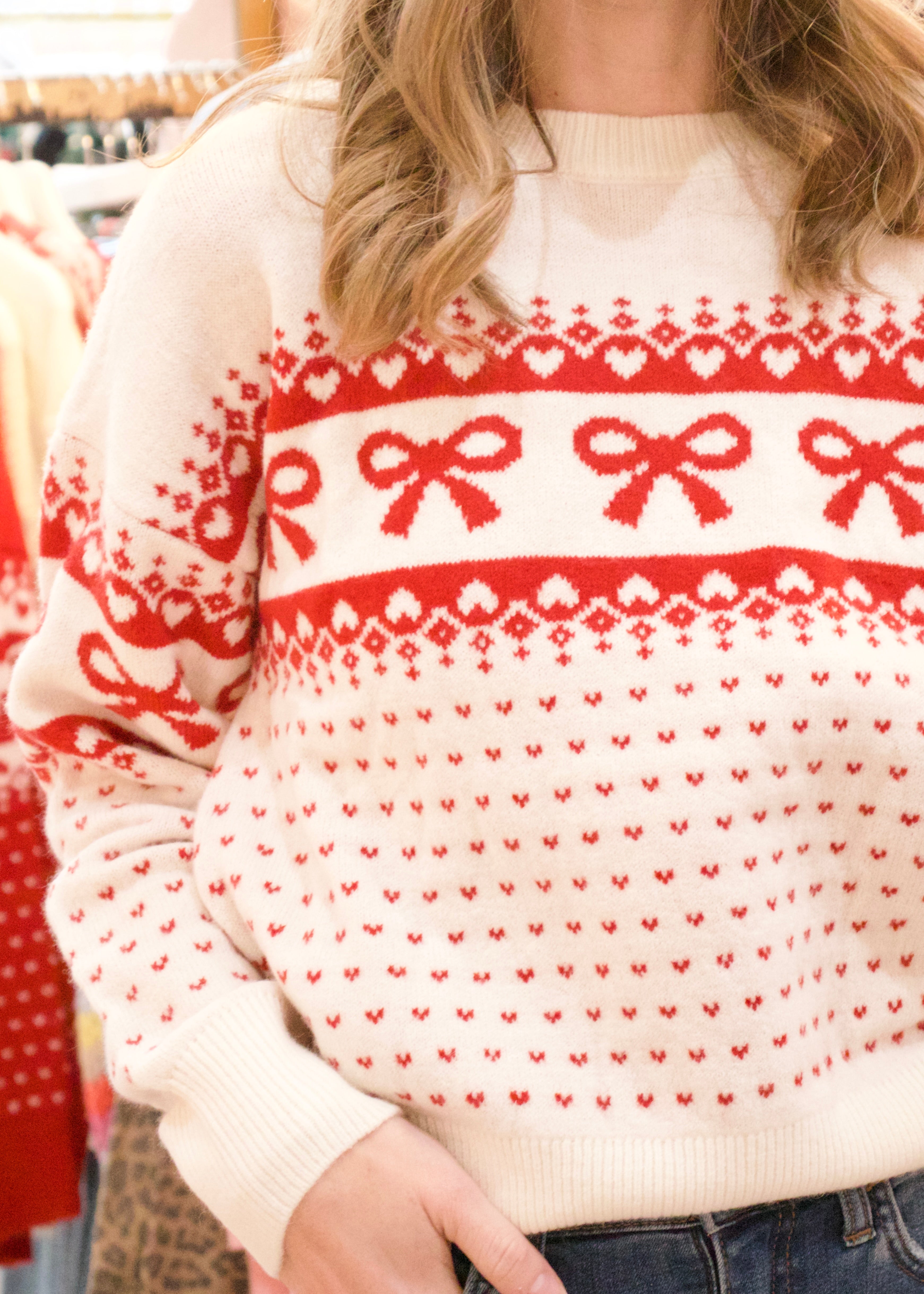 Add some love to your wardrobe with our Bow And Heart Sweater in a creamy hue. Featuring a charming bow and heart print in bold red, this cozy knit is soft on the skin for a comfortable wear. Perfect for spreading warmth and joy this season (literally and figuratively)!