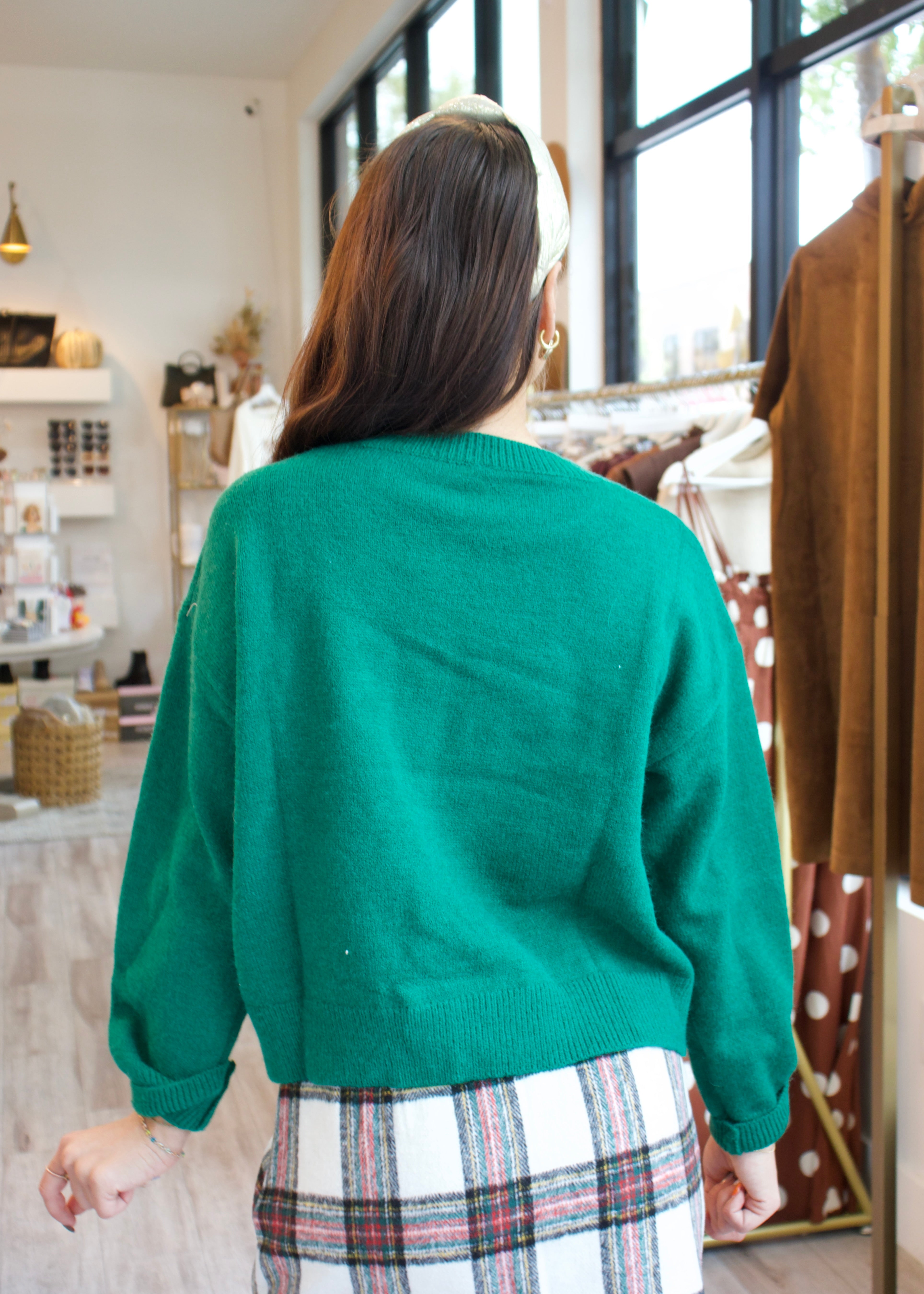 Spread holiday cheer in this delightfully cozy green sweater, adorned with charming white MERRY patches that bring a whimsical touch to your festive wardrobe. Perfect for casual gatherings, family celebrations, or simply adding warmth and personality to your seasonal style. The soft, fluffy texture makes it an instant favorite for layering through winter months. Whether you're decorating, caroling, or enjoying hot cocoa by the fire, this cheerful sweater captures the spirit of the season while keeping you snug and stylish.