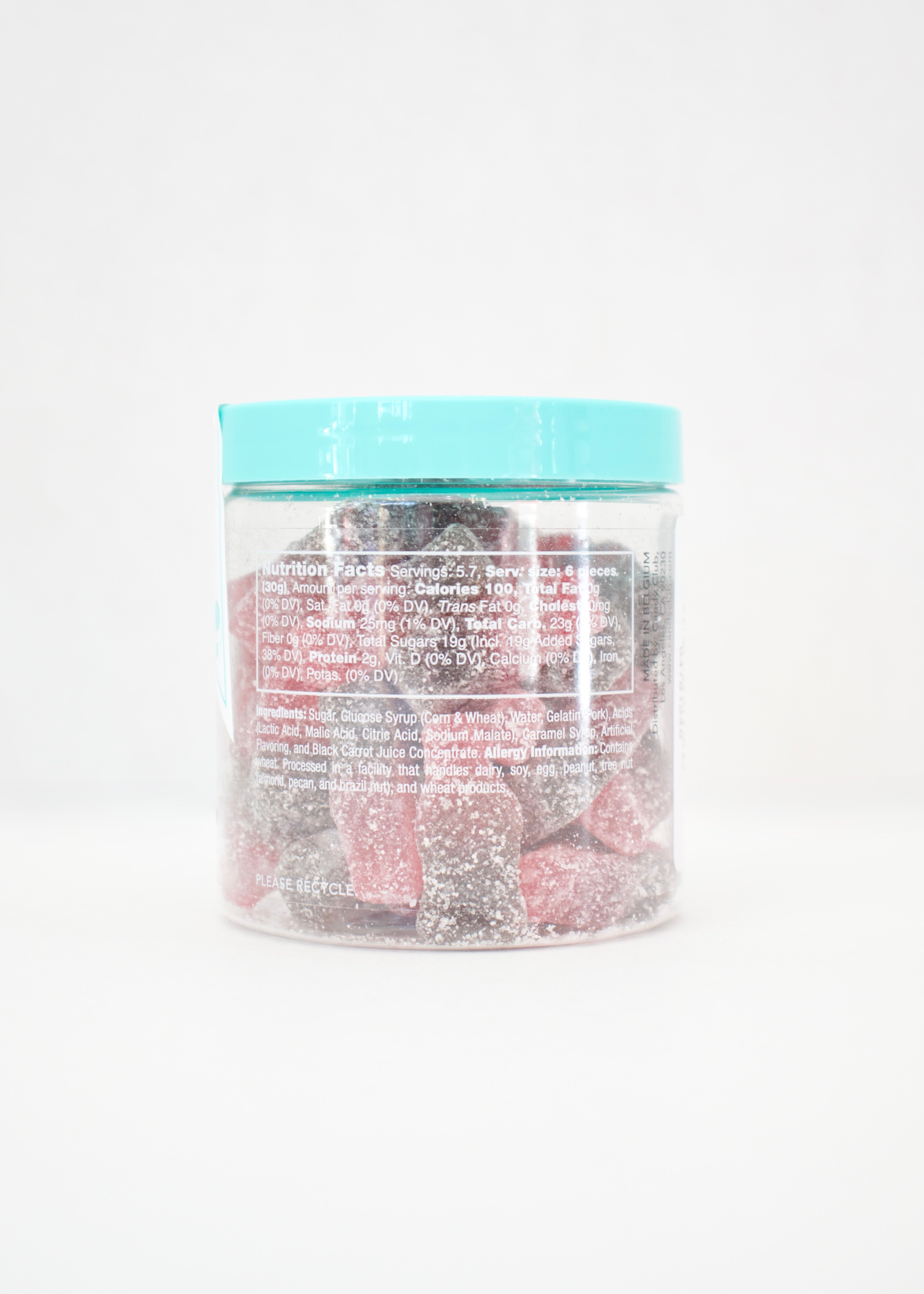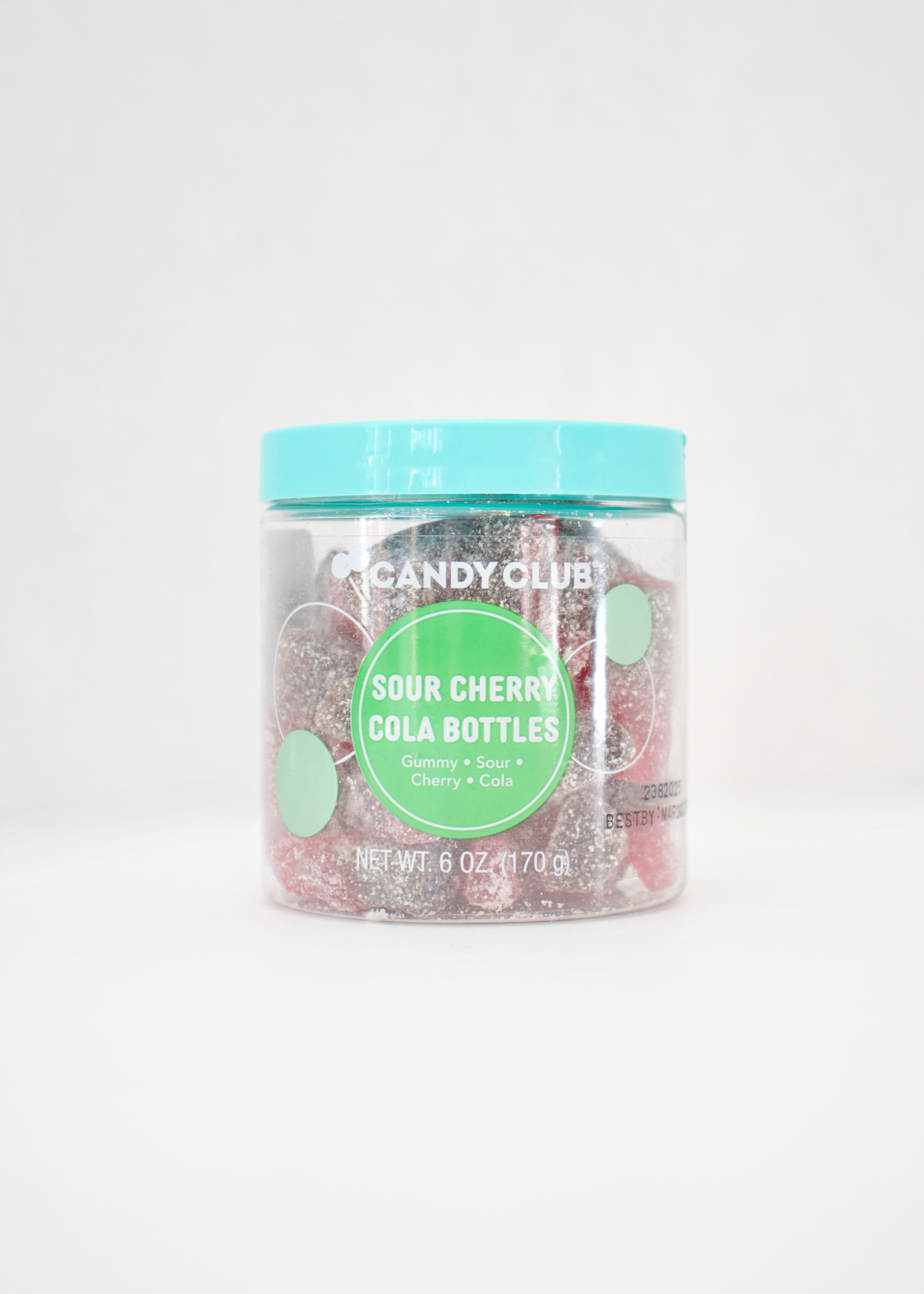 "Pop" open a jar of gummy bottles! Soda pop shaped gummy bottles that are covered in "fizzy" sour sugar and bursting with classic cherry cola flavor.