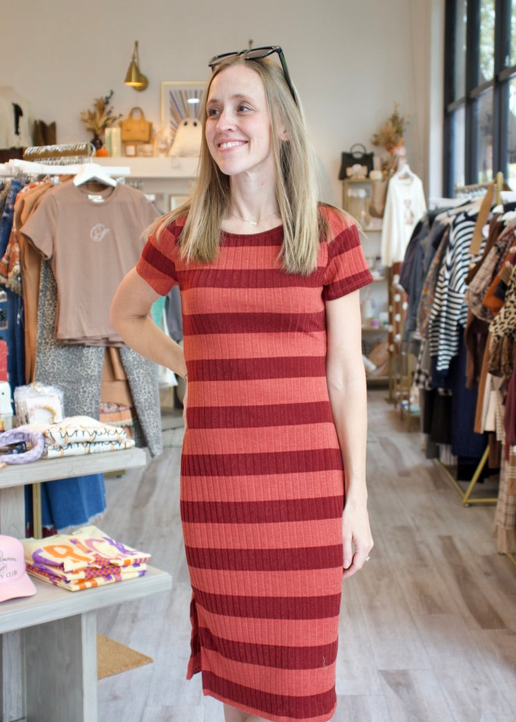 Elevate your wardrobe with this striking midi dress that combines timeless elegance with modern edge. The rust-toned fabric drapes beautifully to midi length, while a daring cut-out back detail adds an unexpected touch of sophistication. Subtle stripe detailing throughout creates visual interest and versatility—dress it up for evening events or down for weekend outings. Perfect for anyone seeking a statement piece that balances classic silhouette with contemporary flair.