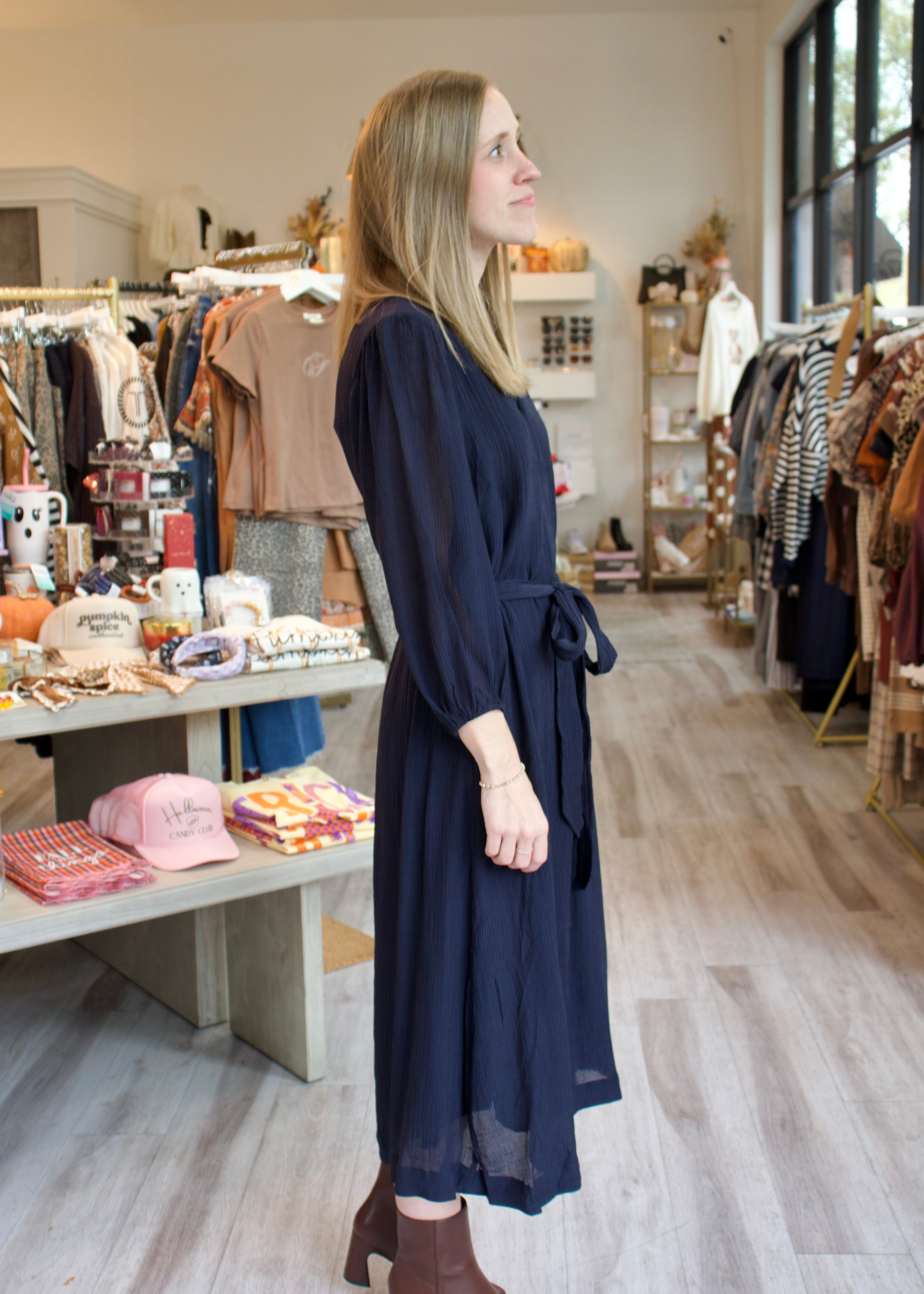 Elevate your everyday wardrobe with this sophisticated button-down tie midi dress in classic navy. The structured silhouette flatters your figure while the tie detail adds a polished, put-together touch perfect for the office or weekend outings. Functional buttons down the front offer easy styling versatility—wear it buttoned for a crisp, professional look or leave it partially undone for a relaxed vibe. The midi length provides timeless elegance and comfortable coverage. A wardrobe essential that transitions seamlessly from day to night, this dress proves that timeless style never goes out of fashion.