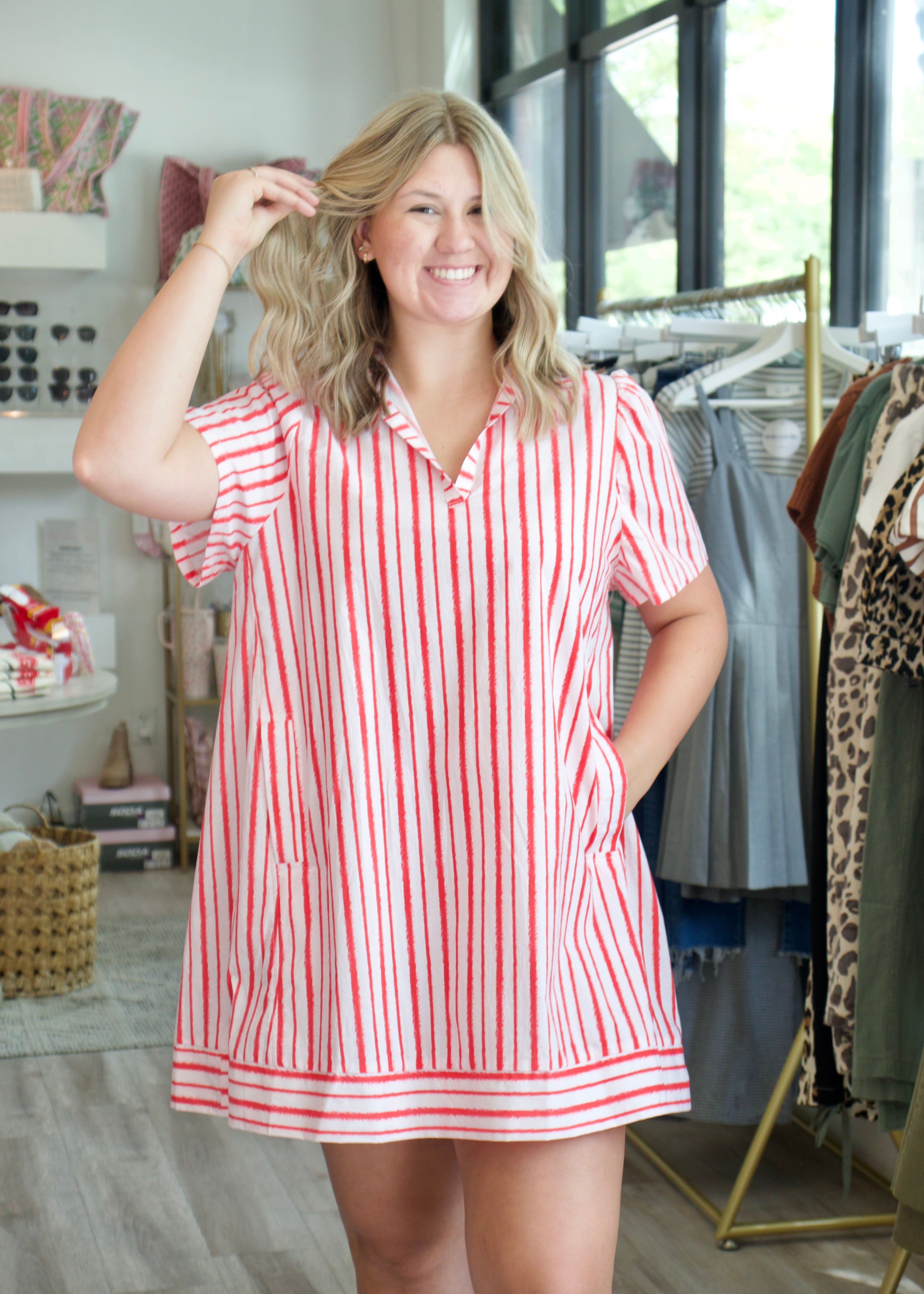 Embrace effortless style with the Coastal Striped Shirt Dress in vibrant red. Featuring classic stripe details, this dress offers a flattering collar and convenient pockets for essentials on the go. Perfect for a casual day out or a relaxed beach vibe, it combines comfort and chic in one versatile piece.