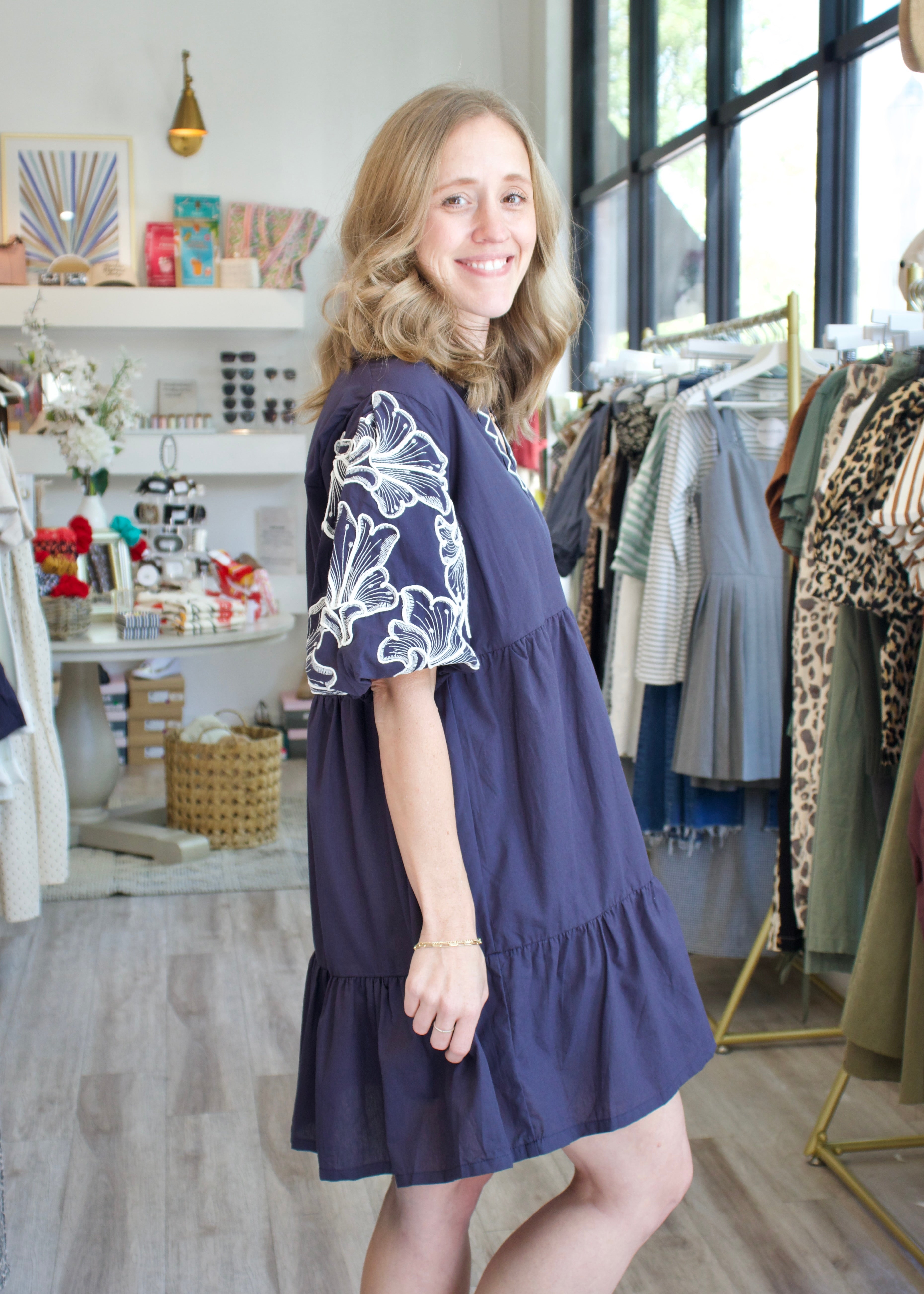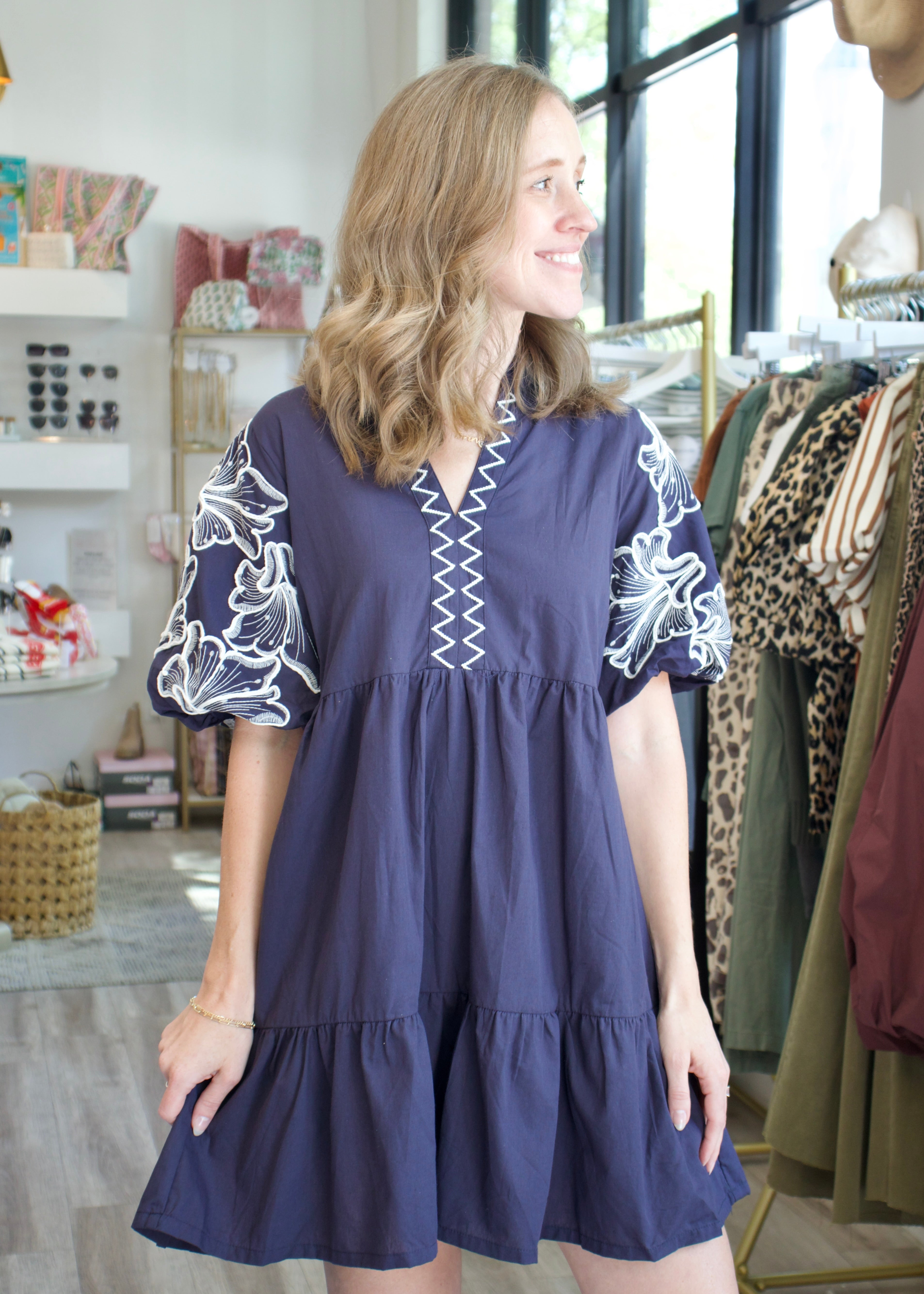 Elevate your wardrobe with the Emb Puff Tiered Mini Dress in Navy. Featuring delicate embroidery detail and stylish puff sleeves, this dress combines elegant craftsmanship with playful volume. Its tiered mini silhouette offers a flattering, breezy fit perfect for warm days or special occasions, making it a versatile and eye-catching addition to your collection.