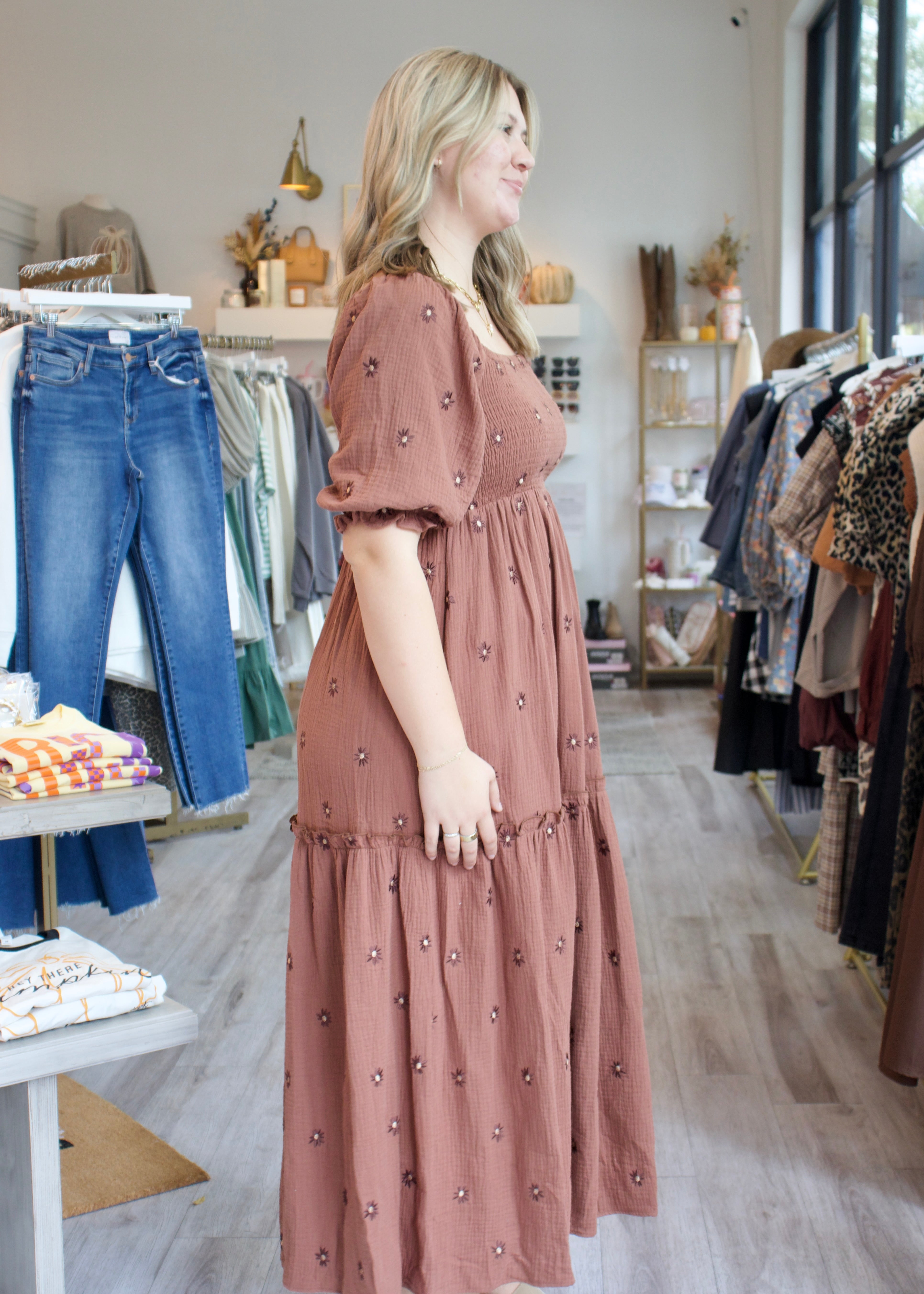Embrace effortless elegance with this Floral Embroidered Tier Maxi Dress in rich chocolate. Featuring delicate floral embroidery, puff sleeves, and a flattering smocked bodice, this dress combines comfort with eye-catching details. Its tiered silhouette flows gracefully, making it perfect for special occasions or casual outings where you want to stand out.