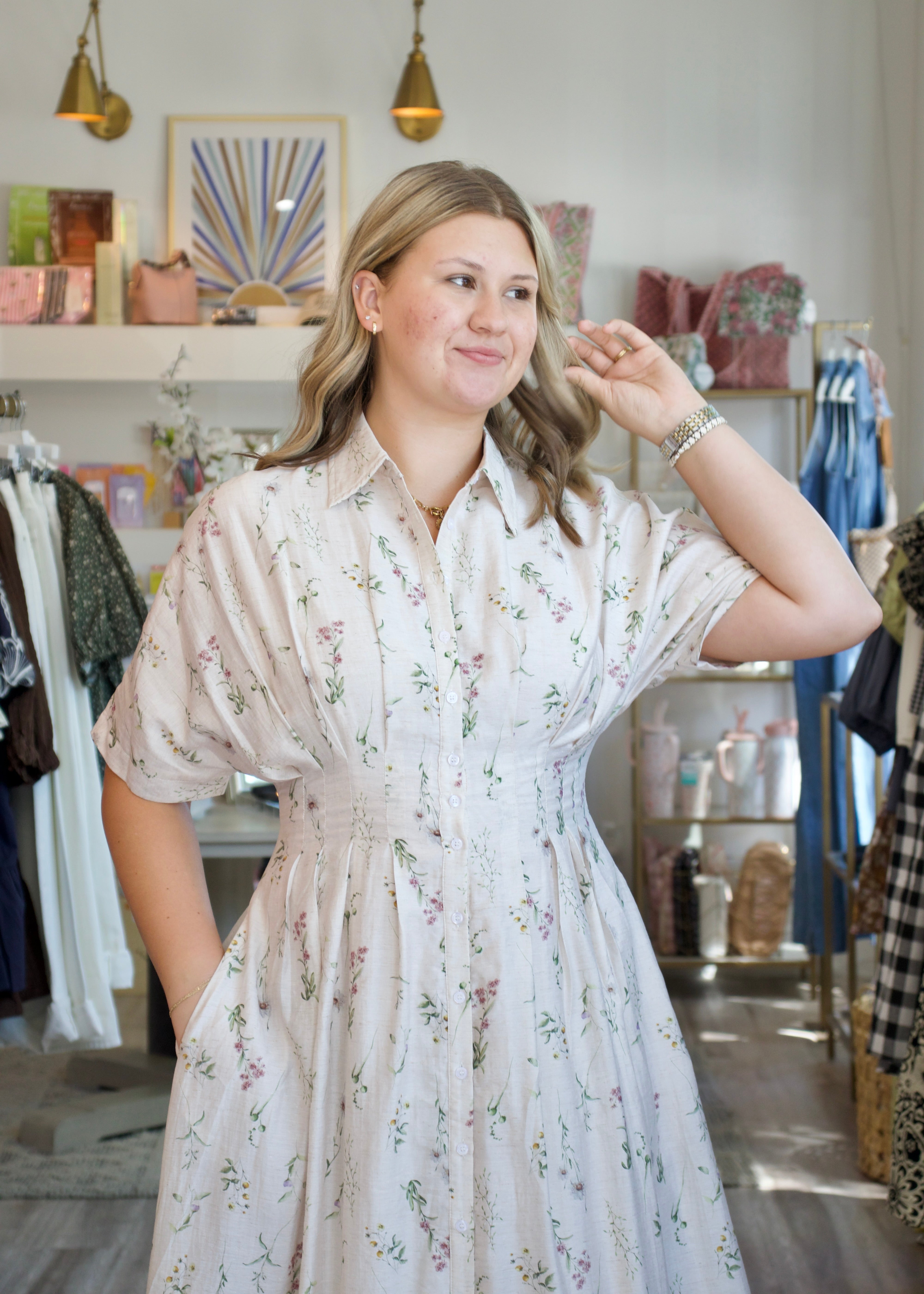 This Floral Pleated Midi Dress features elegant button details and a classic collar for a refined look. Its flattering waist design enhances your silhouette, while the delicate floral pattern brings a touch of timeless charm. Perfect for both casual and dressy occasions, this dress combines comfort with effortless style.