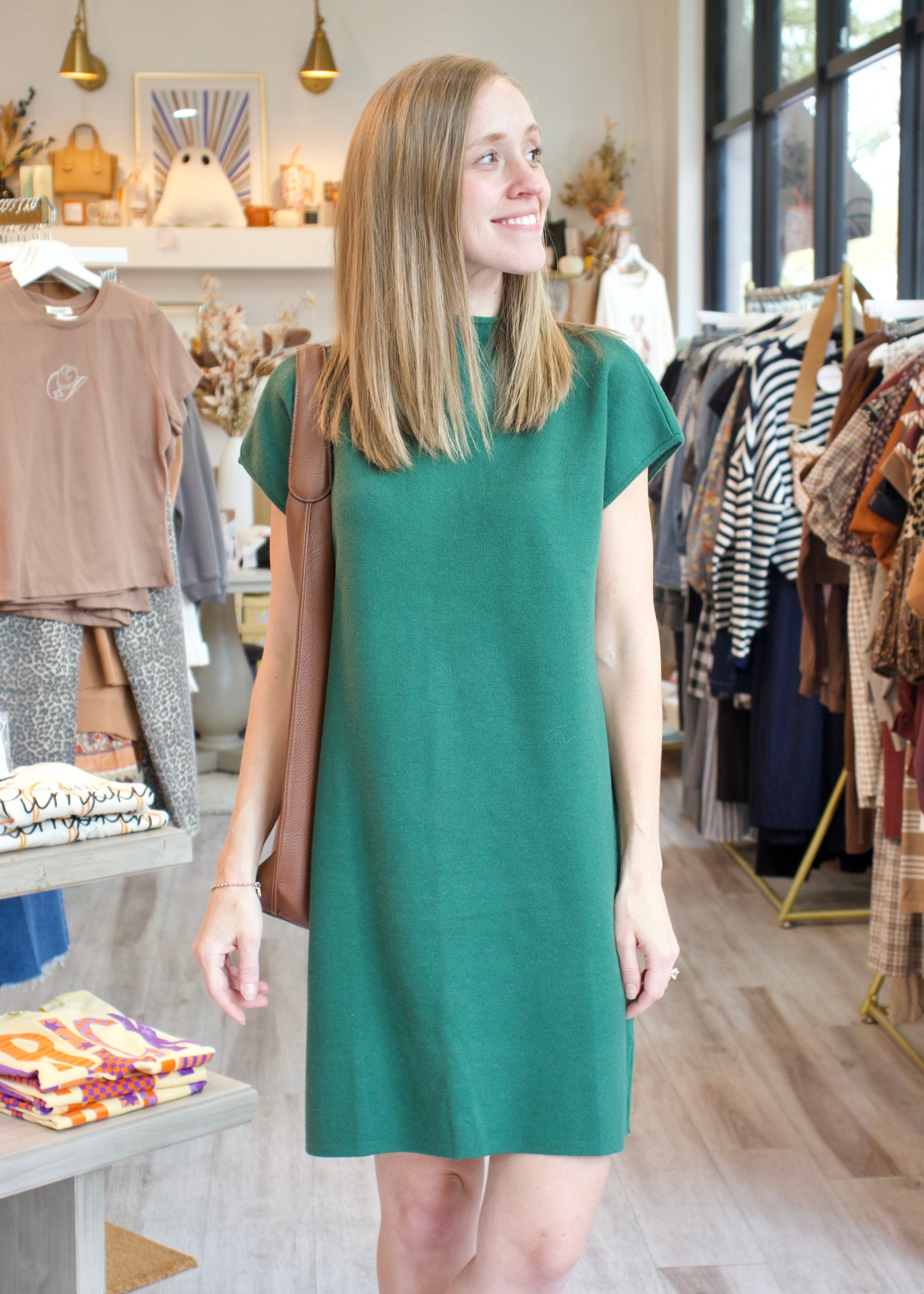 Effortlessly chic and ready for anything, this mock neck mini dress in rich hunter green is your new go-to. The cozy pullover style keeps things casual while the sleek silhouette keeps you looking polished. Perfect for layering or wearing solo—comfort meets style in one adorable package.