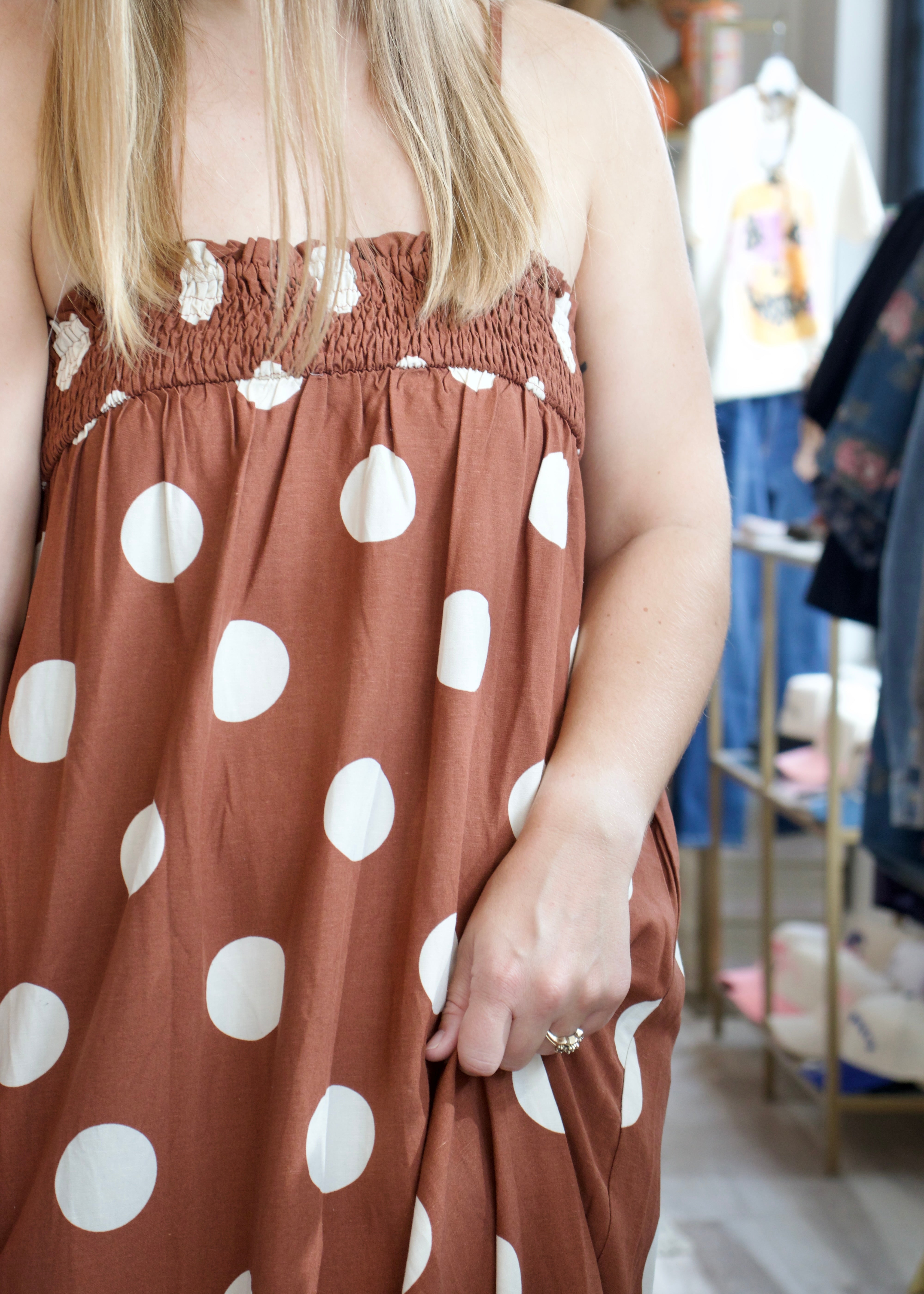 Elevate your wardrobe with the Sandy Dot Maxi Dress in warm brown. Its timeless dot pattern and flowing maxi length create effortless elegance, perfect for everything from casual outings to special occasions. Designed to flatter your silhouette, this dress combines comfort with chic style, making it a versatile must-have for any season. Experience graceful movement and standout style wherever you go.