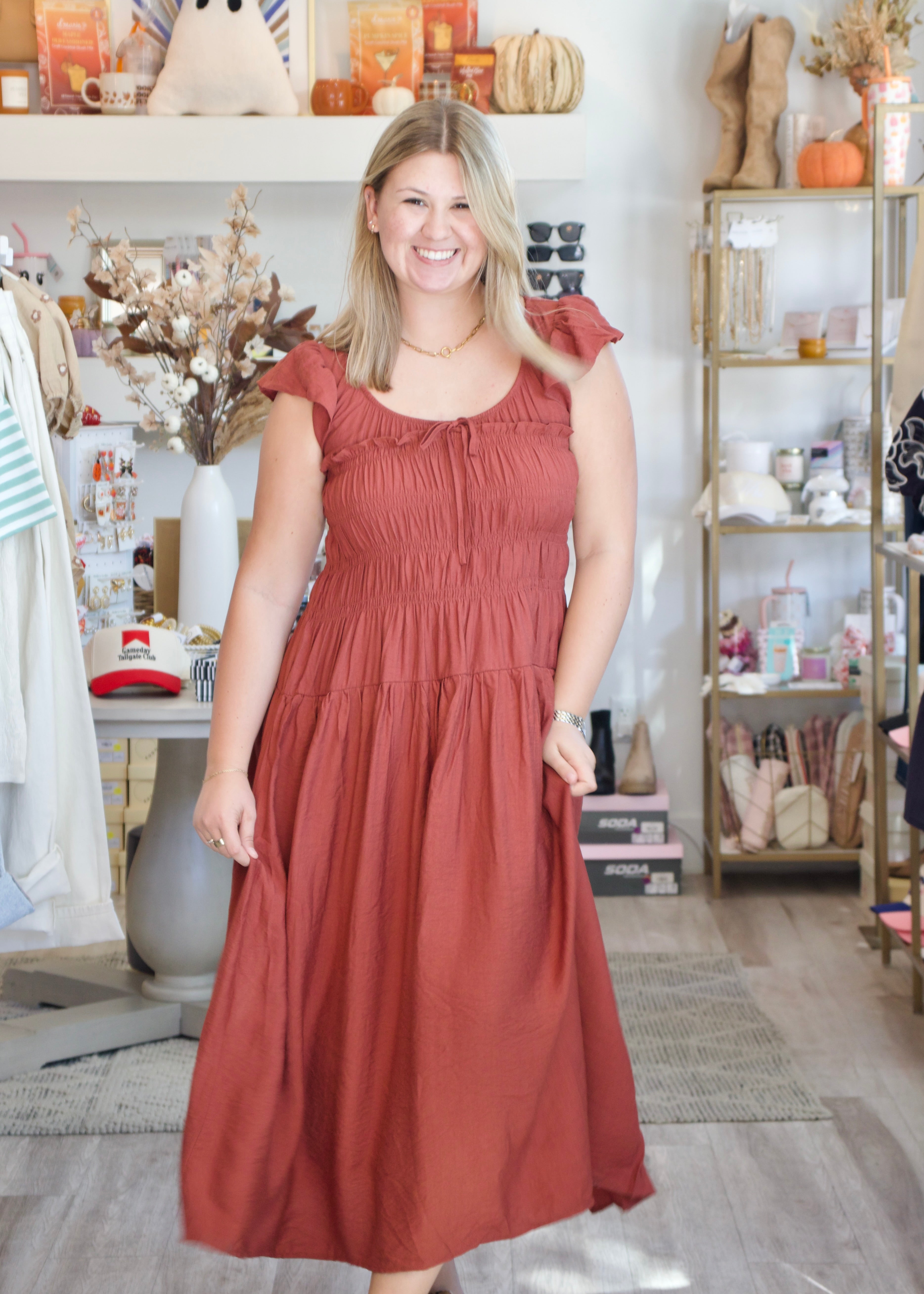 The Shirred Ruffle Midi Dress in Sienna features a flattering front tie detail and delicate ruffles that add a touch of feminine charm. Its midi length offers versatile elegance, perfect for both casual outings and special occasions. Crafted to complement your silhouette, this dress combines comfort with style effortlessly. Make a statement with this effortlessly chic piece that enhances your look with every wear.