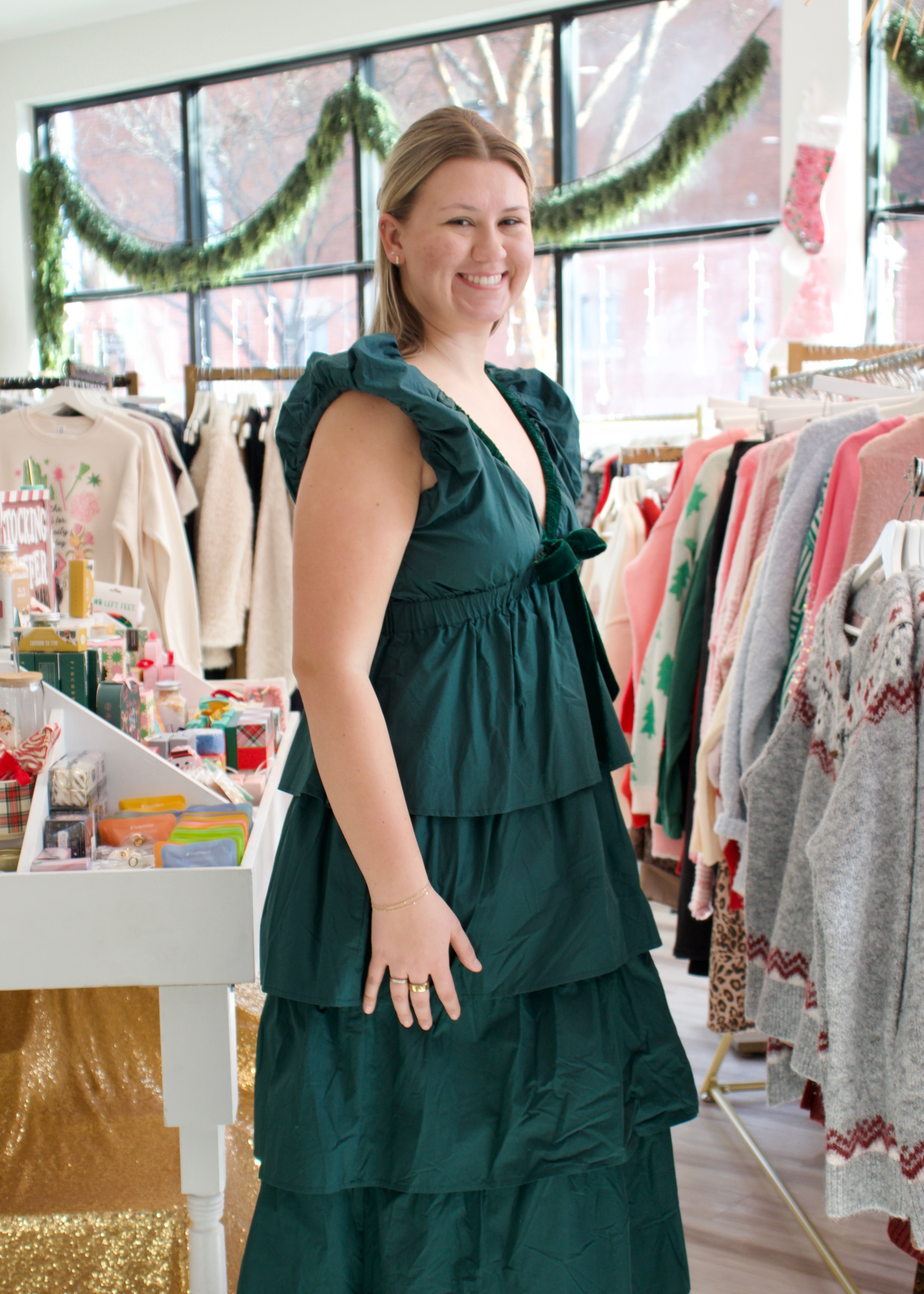 Twirl into elegance with this enchanting hunter green tiered midi dress that brings sophistication and playful charm together. Luxurious velvet bow detail adds a touch of luxury and festive flair, while cascading ruffled tiers create movement and visual interest. The rich green hue captures the essence of holiday elegance without sacrificing fun, making it perfect for seasonal celebrations, special dinners, or any occasion calling for polished style. This dress proves that you can look absolutely stunning while keeping things light-hearted and joyful throughout the season.