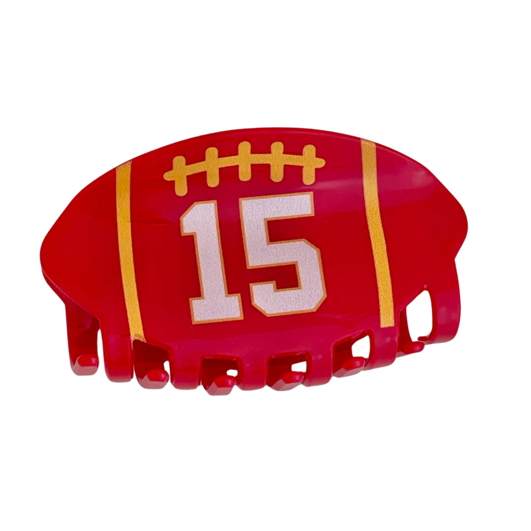 Show your team spirit with this vibrant red football claw clip featuring the iconic #15 KC design. Perfect for securing your hair comfortably while cheering on your favorite team, it combines style and practicality. Lightweight and easy to use, this clip keeps your hair in place during game day excitement or everyday wear. Add a bold touch to your look and celebrate your passion for football with this must-have accessory.