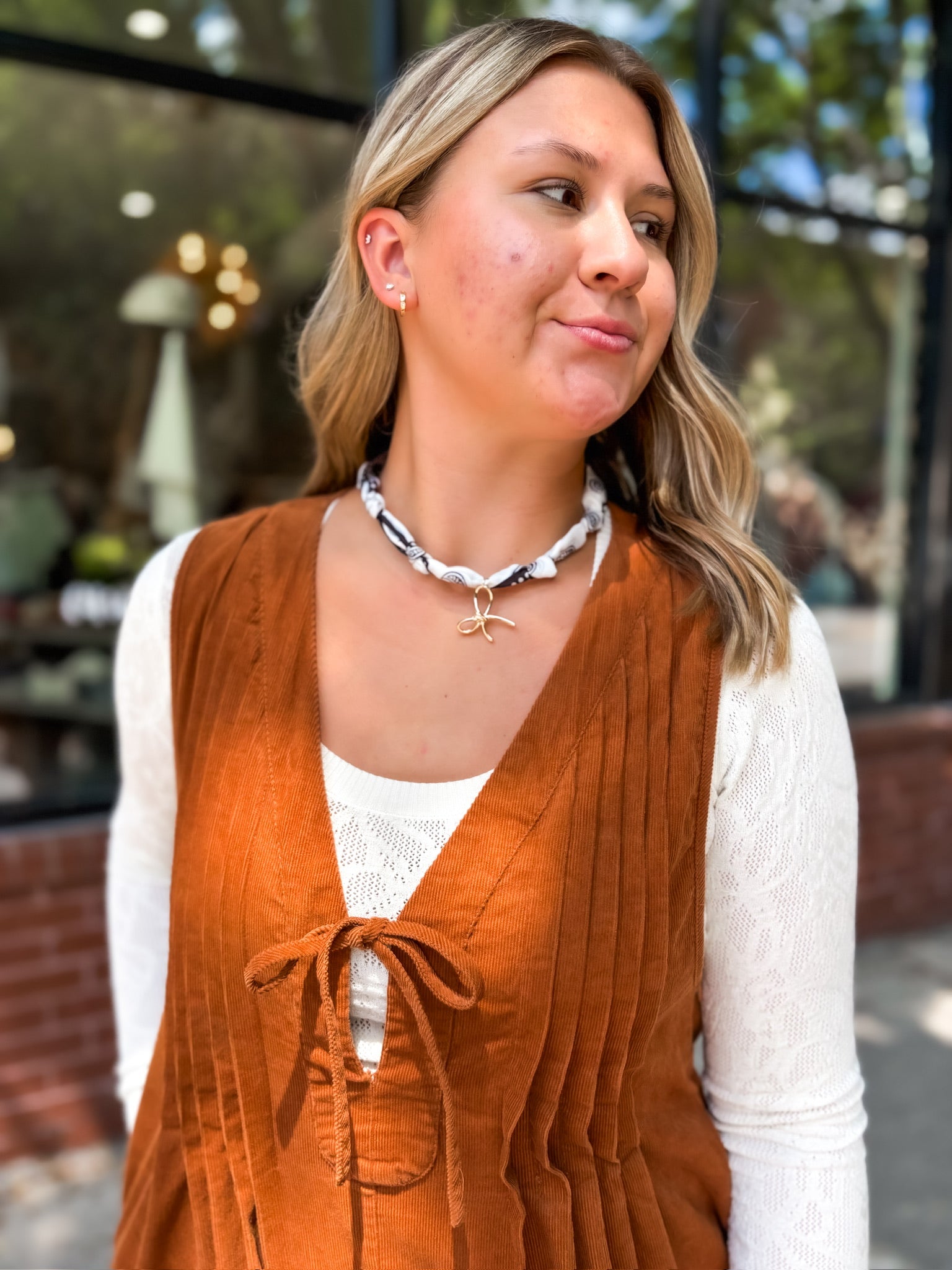 Elevate your style with our Scarf Charm Necklace! This versatile piece features a chic bow charm and trendy black and white polka dot design. Stay fashion-forward and effortlessly accessorize any outfit with this must-have accessory.