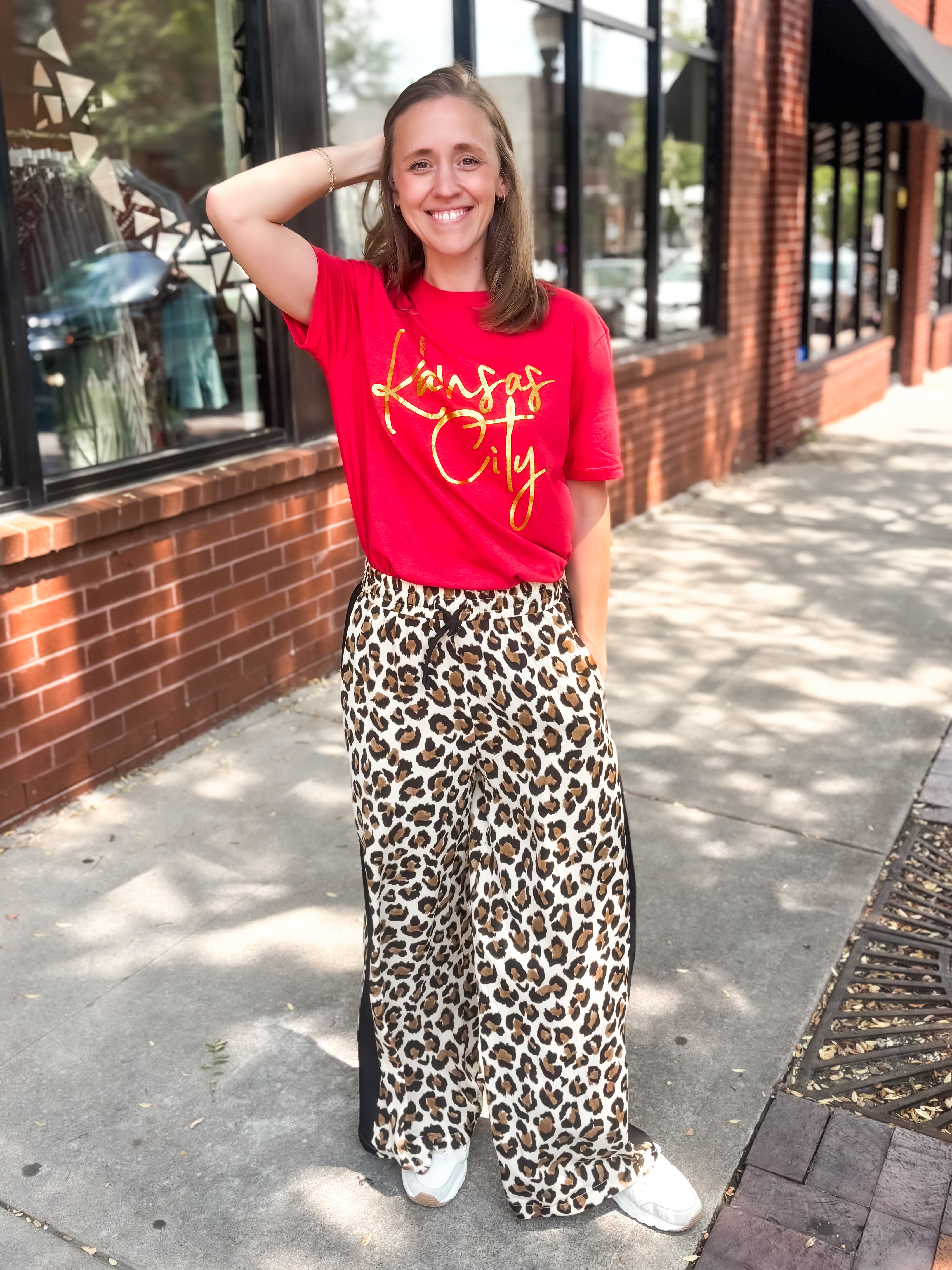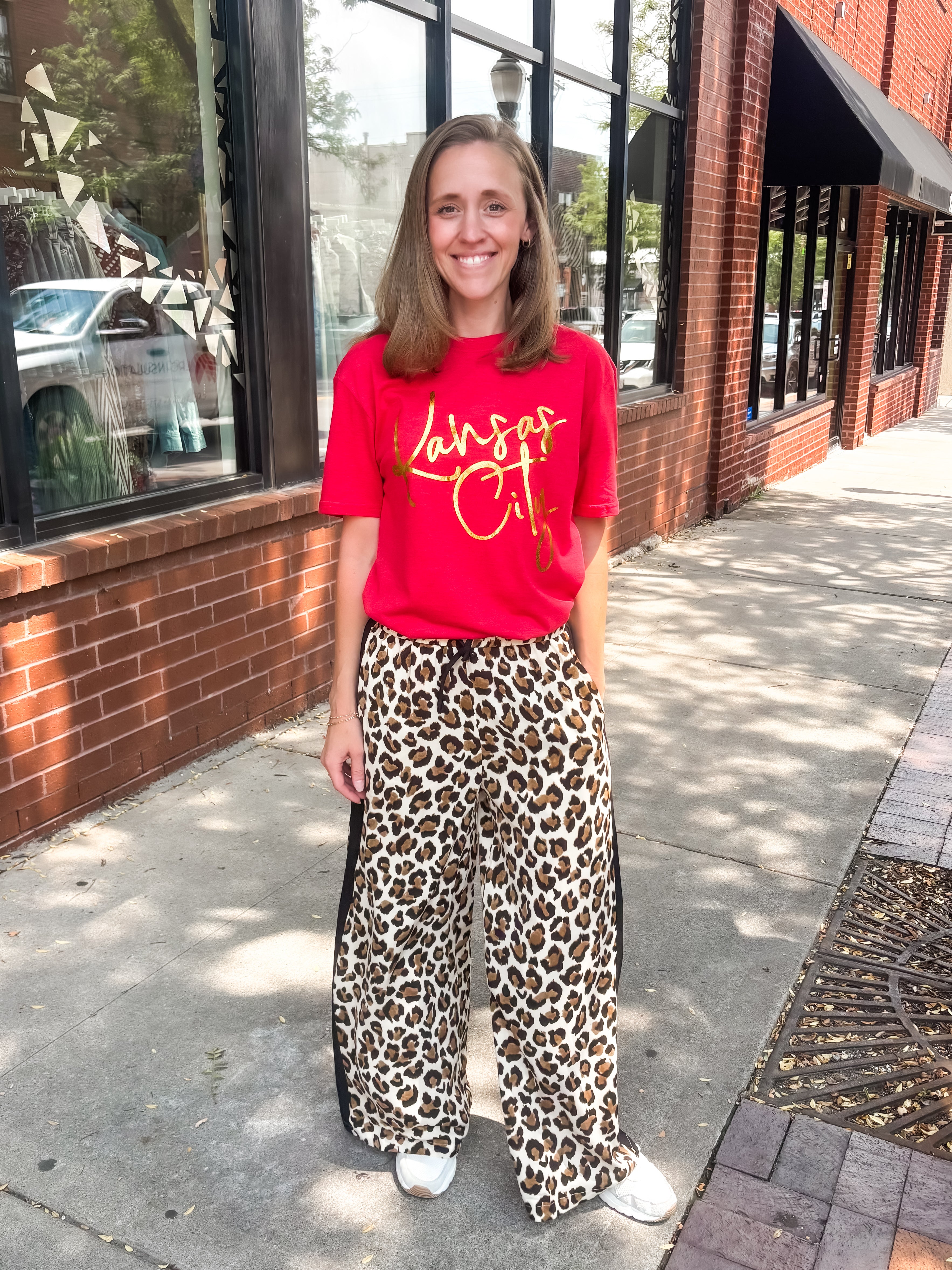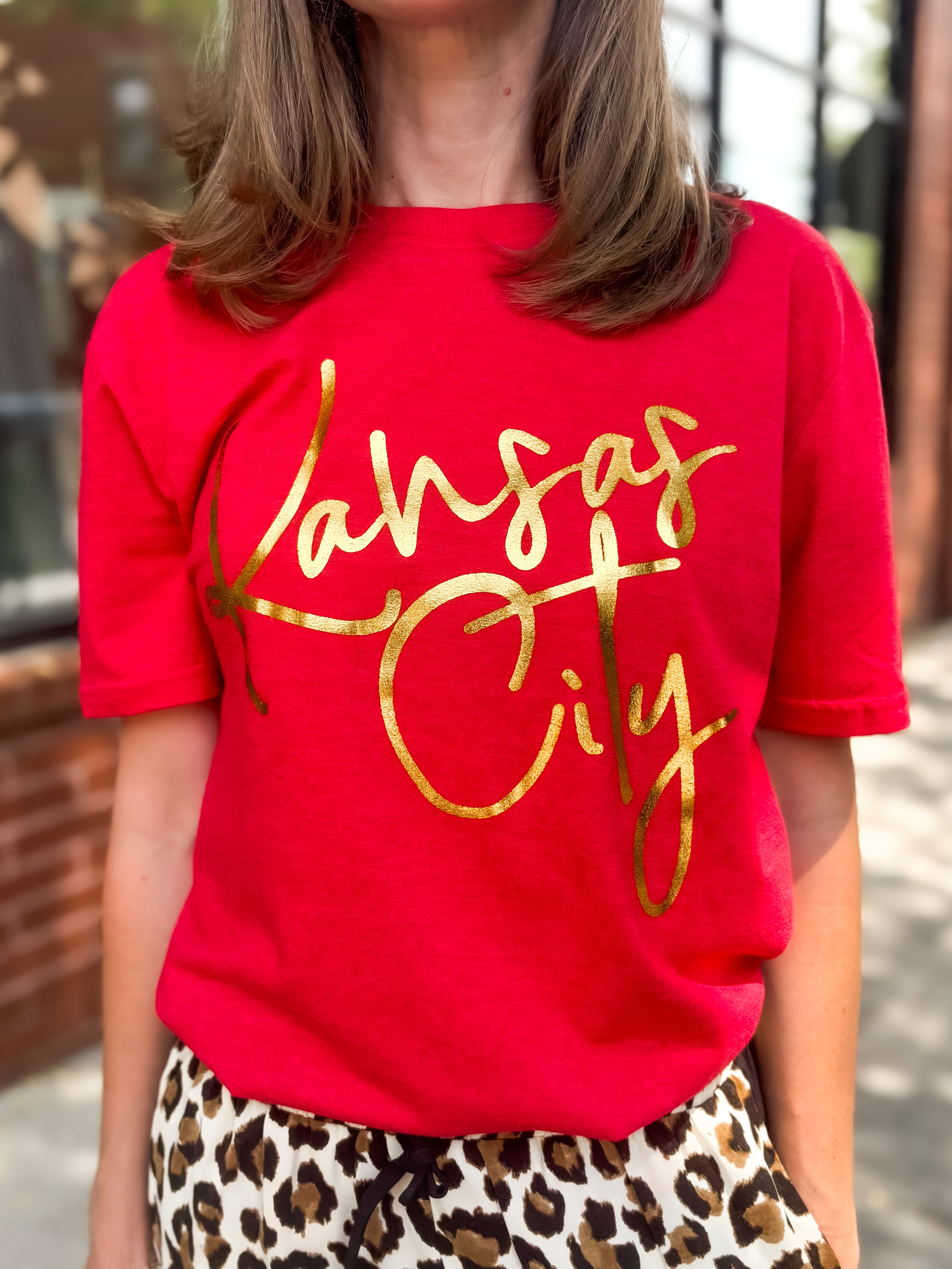 Show your Kansas City pride in style with this Metallic Script Tee. Featuring bold gold metallic lettering on a vibrant red base, this tee is perfect for game day or everyday wear. Its eye-catching design celebrates KC spirit while offering comfortable, casual fit. Elevate your fan gear and stand out in the crowd with this must-have Kansas City script t-shirt.