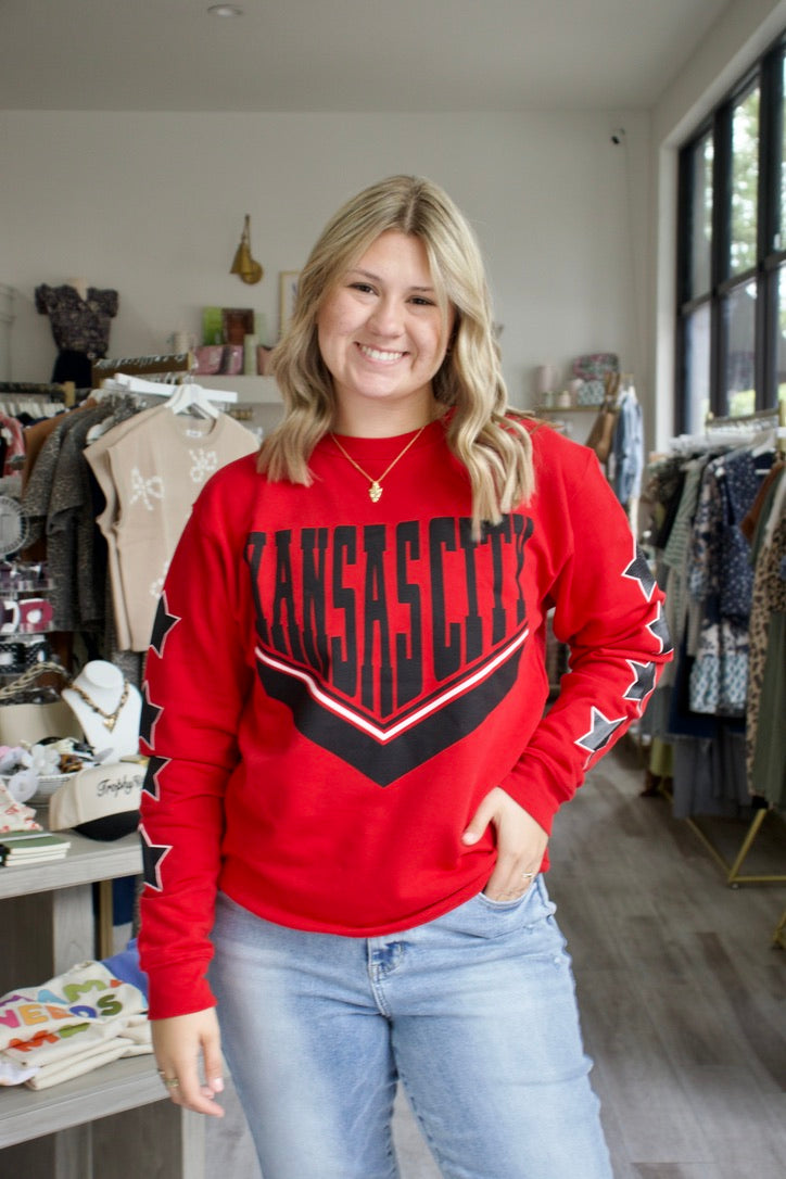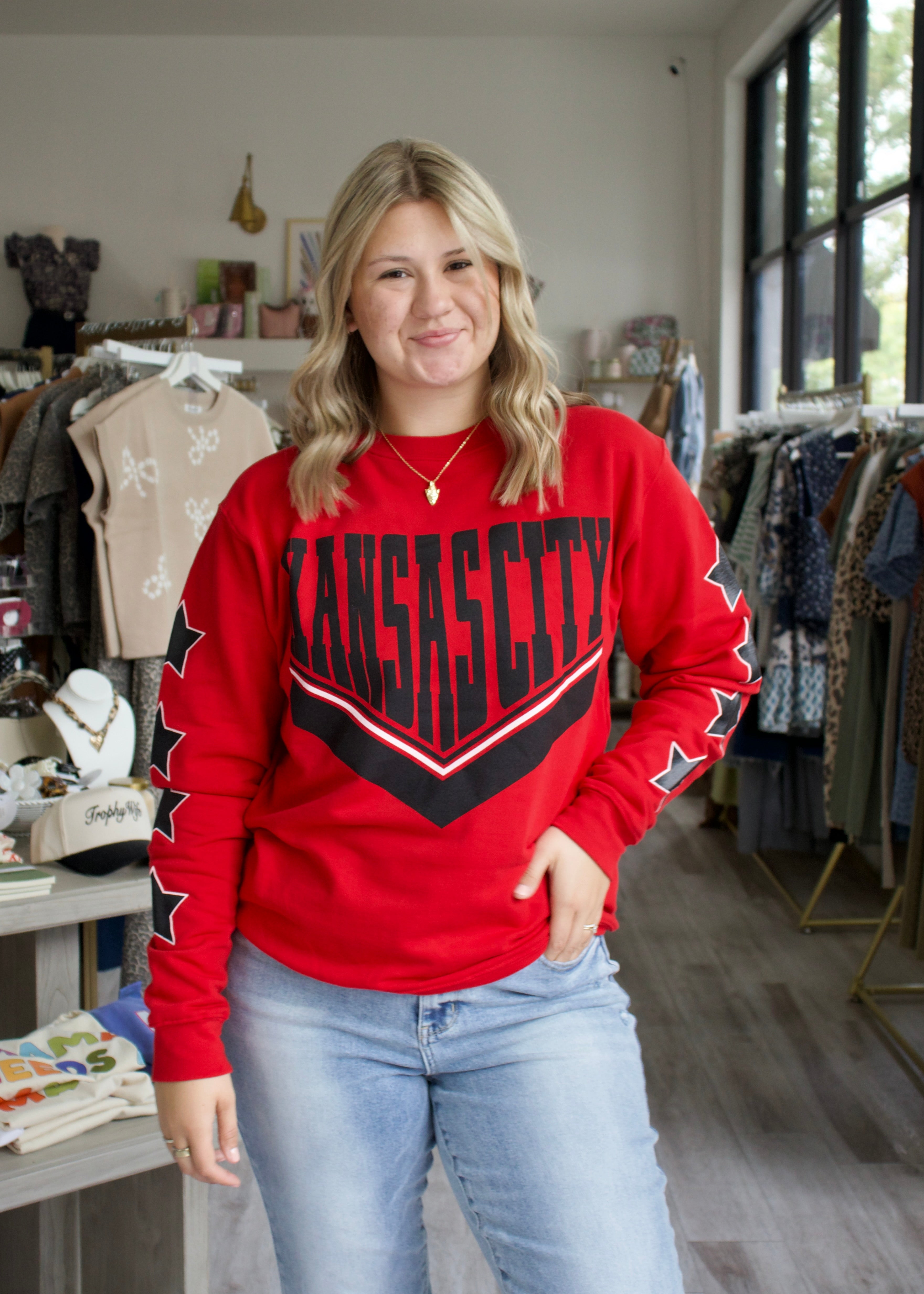 Embrace a classic vibe with the Vintage Star Sleeve Sweatshirt in bold red. Featuring a vintage Kansas City print on the front and star detail on the sleeve, this cozy sweatshirt delivers both comfort and local pride. Perfect for casual days when you want to stand out with subtle city-inspired style.