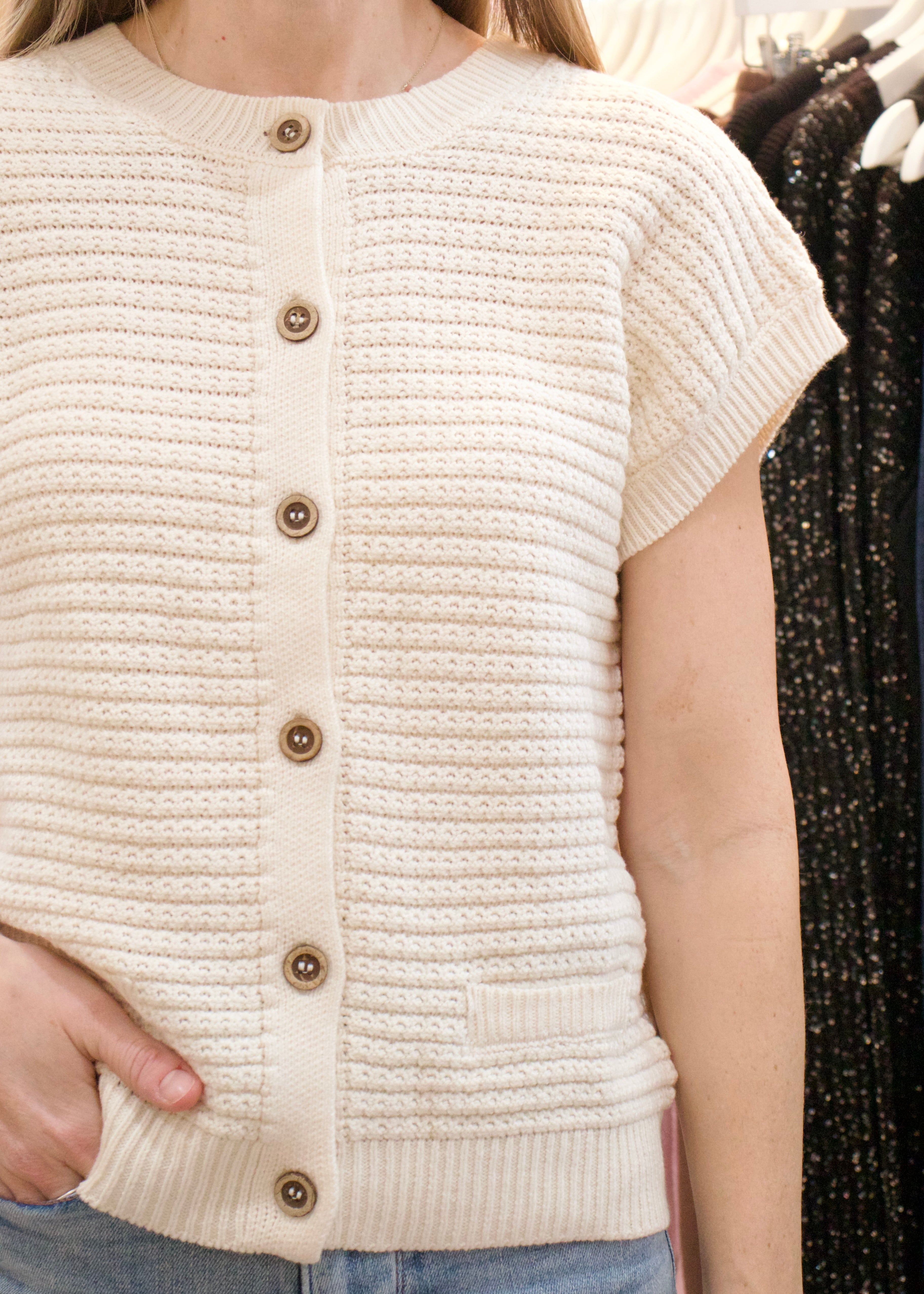 Throw on this cream short sleeve cardigan for instant polish with zero fuss. The button closure makes layering a breeze, while the cozy knit detail adds texture and charm to any outfit. Perfect for those "just right" temperature days when you want coverage without the bulk. Style it over a tee, dress, or tank—this versatile piece is your new go-to layer.