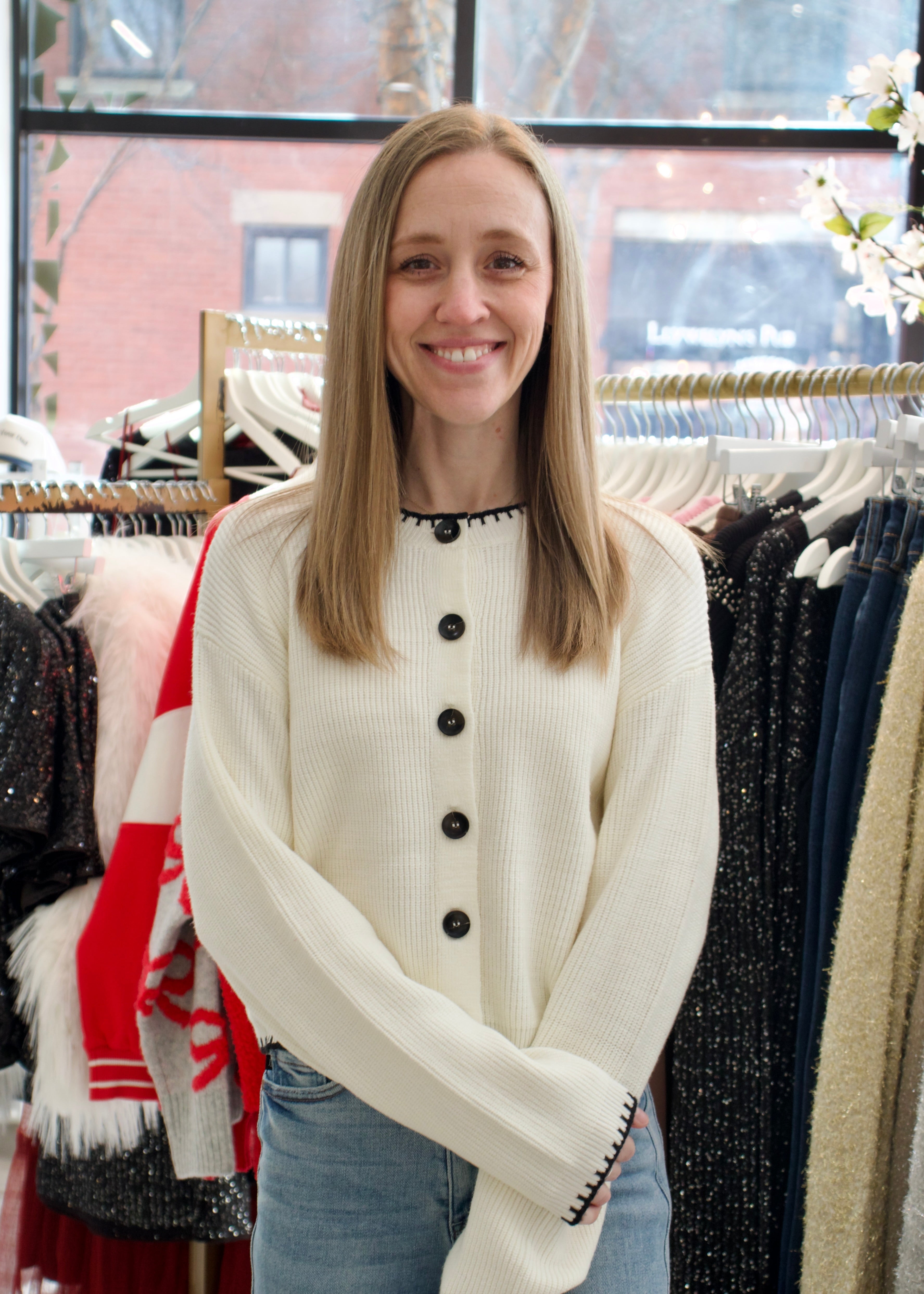 Cream-colored cardigan with playful contrast stitching along the trim that adds a fun, handcrafted touch. Perfect for layering over your favorite tees or dresses. Cozy knit fabric keeps you comfortable while the detailed stitch work makes it anything but basic.