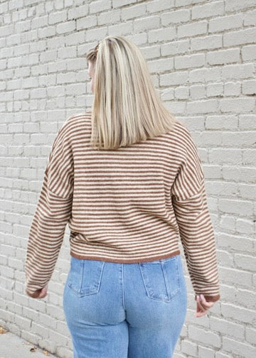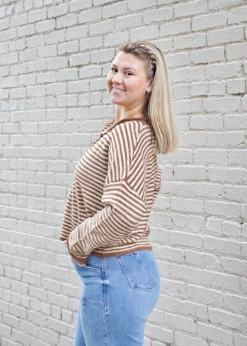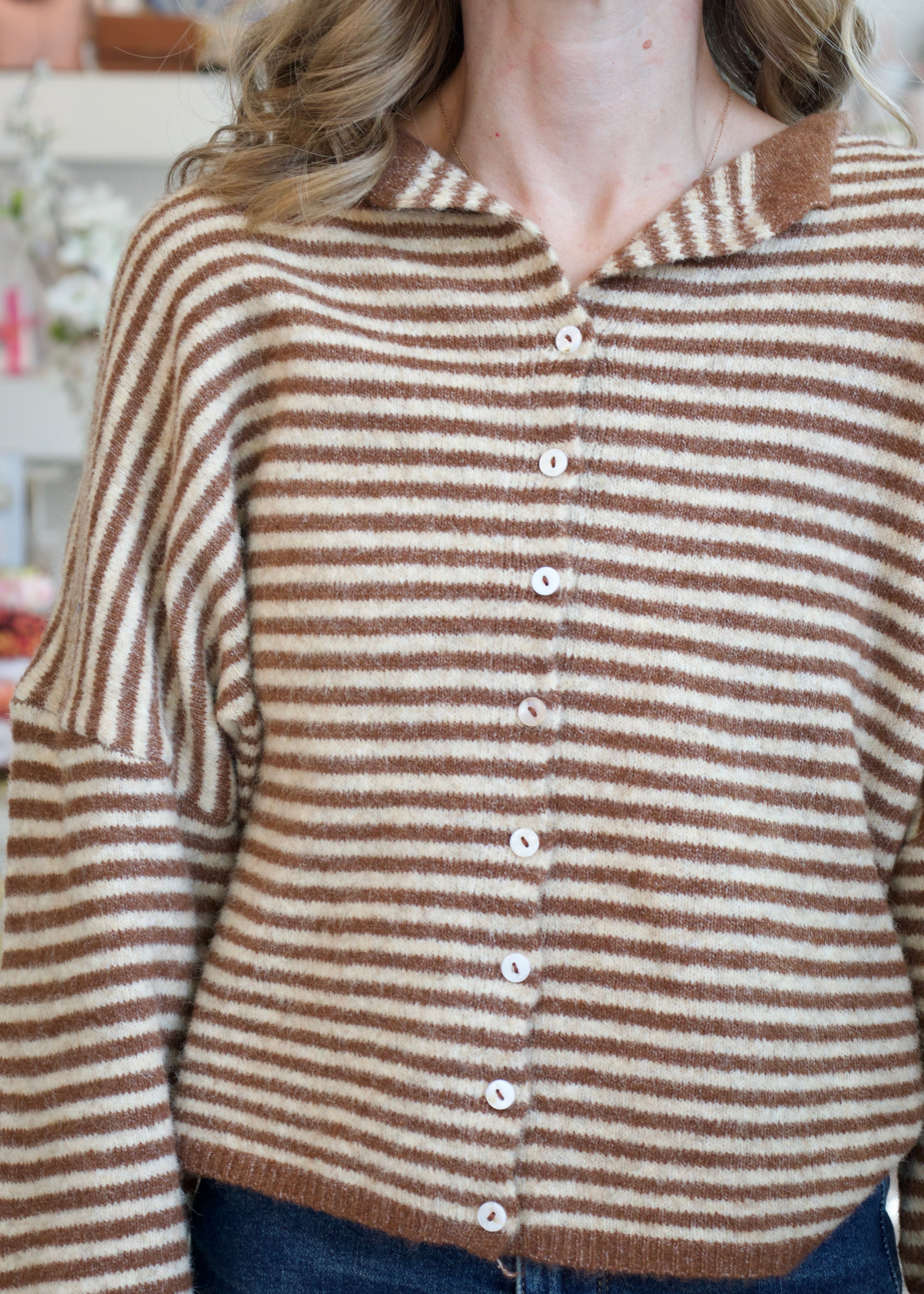 Elevate your wardrobe with our Mini Striped Piper Cardigan in warm brown. Featuring a classic front button design and subtle mini stripe details, this cardigan combines timeless style with cozy comfort. Perfect for layering, it adds a refined touch to any outfit while keeping you comfortably stylish throughout your day.