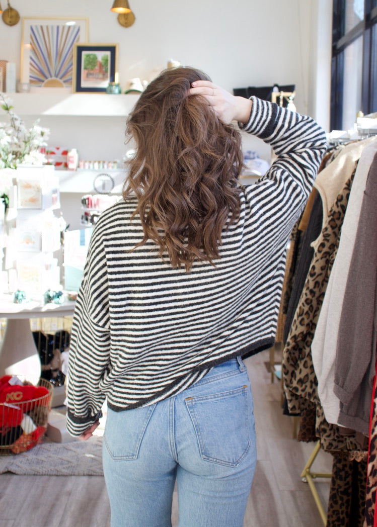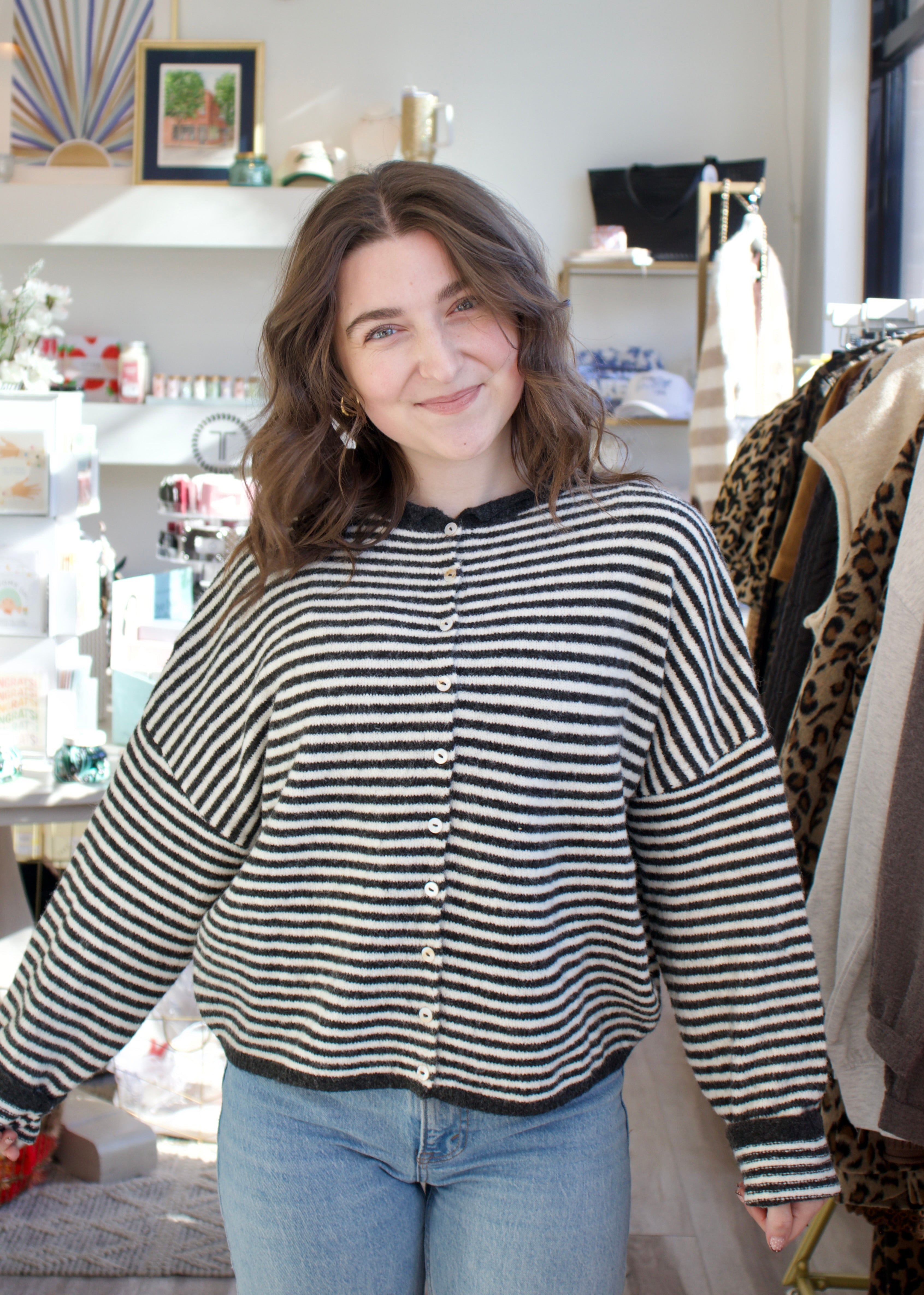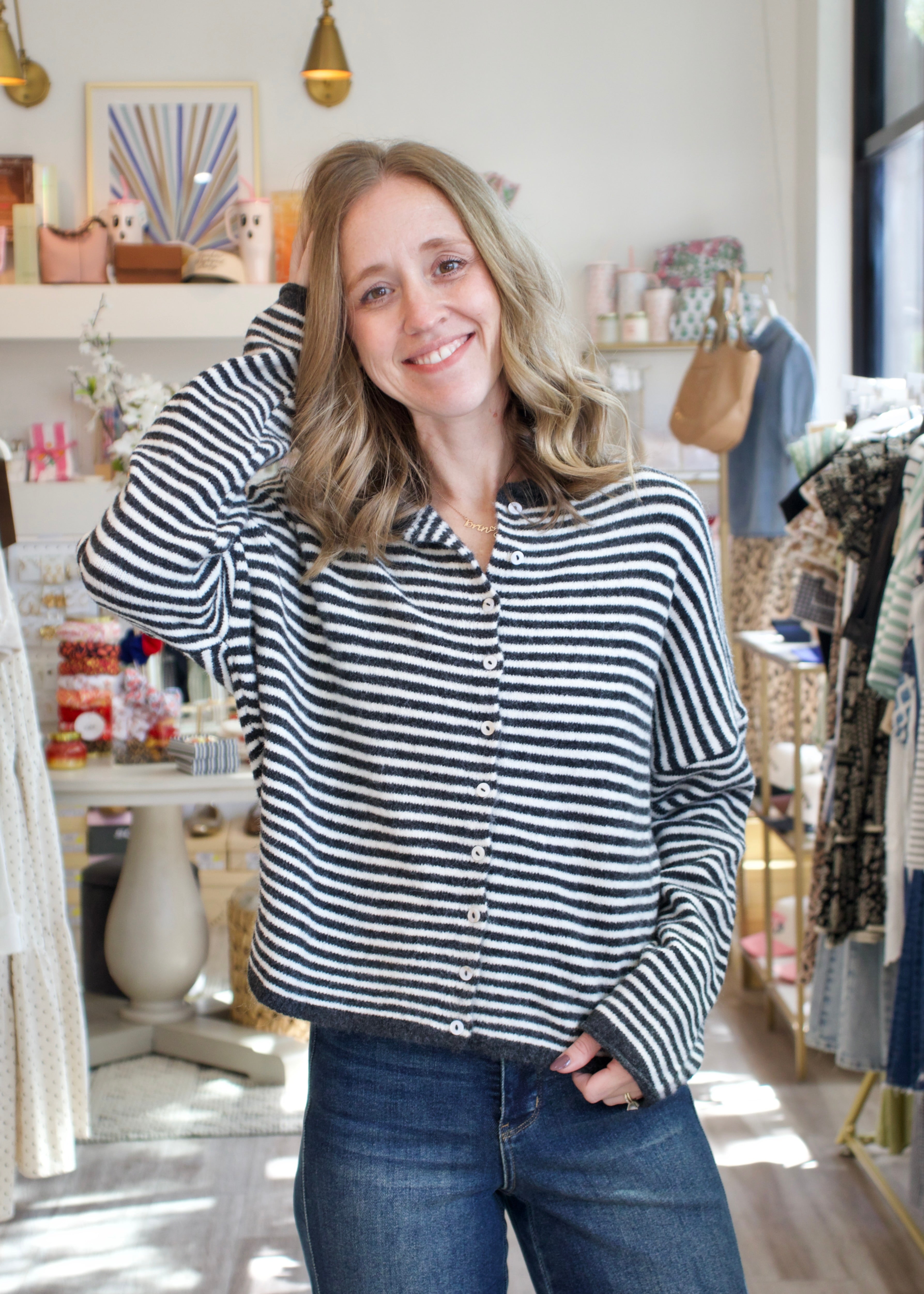 Elevate your wardrobe with our Mini Striped Piper Cardigan in charcoal. Featuring a classic front button design and subtle mini stripe details, this cardigan combines timeless style with cozy comfort. Perfect for layering, it adds a refined touch to any outfit while keeping you comfortably stylish throughout your day.