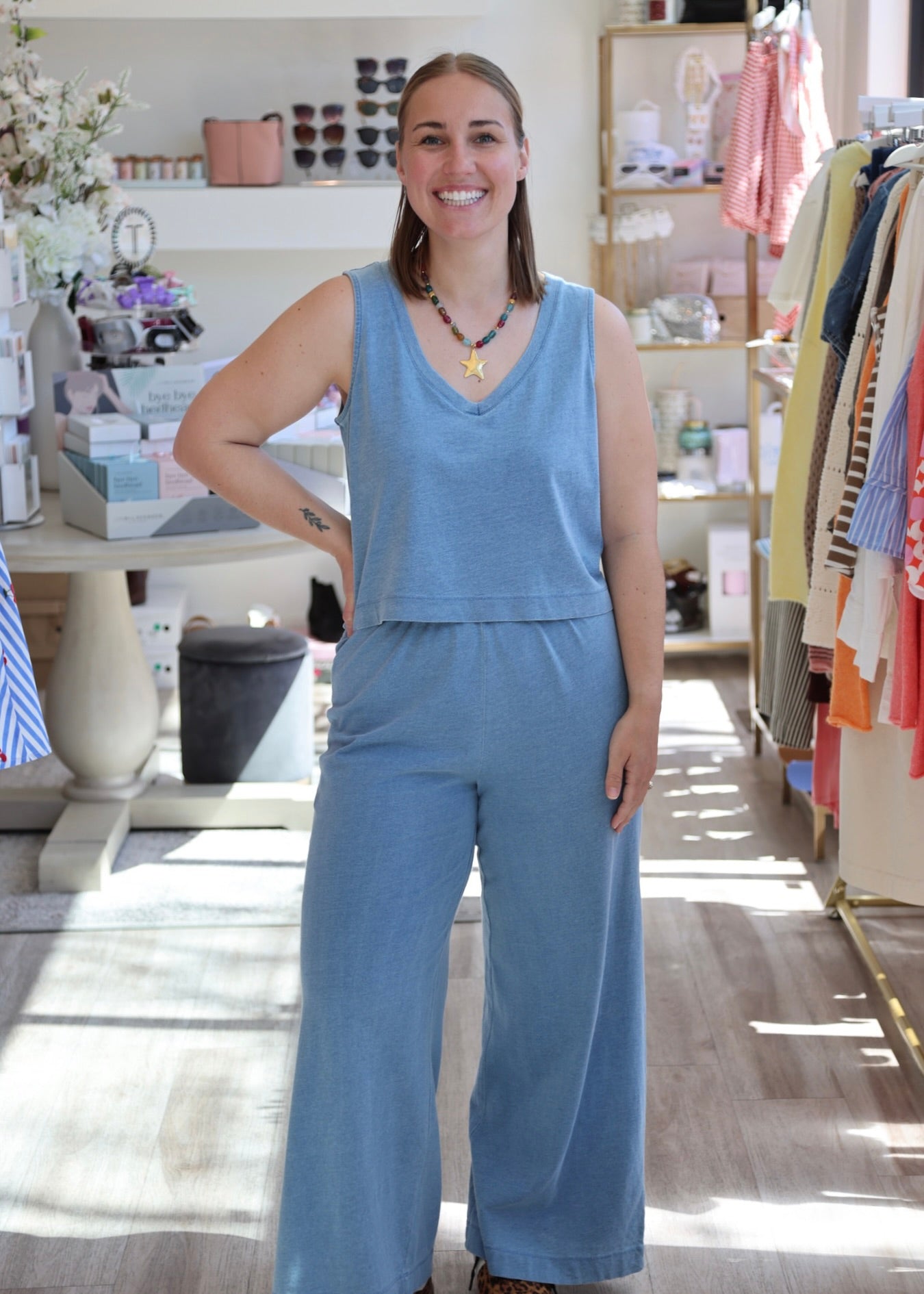 Experience effortless style and comfort with the ZSupply Scout Jersey Denim Pant in Santorini Indigo. Featuring a wide-leg silhouette and an elastic waistband, these pants offer a relaxed fit that moves with you. Perfect for pairing as a matching set, they blend casual ease with a modern edge, making them ideal for everyday wear or laid-back outings. Embrace versatile fashion that keeps you comfortable and looking polished all day long. Pair with our Sloane Top for a matching set