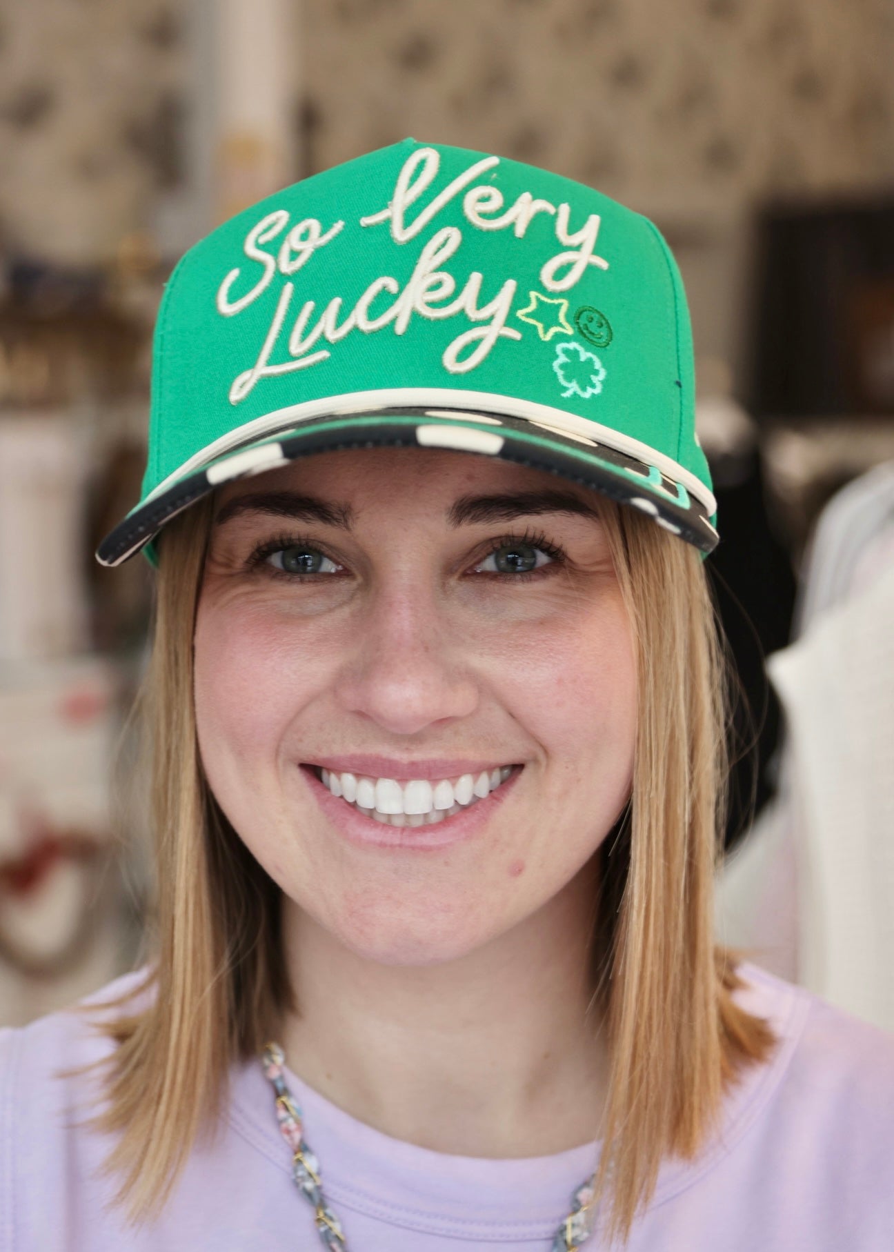 Bring good vibes and retro style with this So Very Lucky Trucker Hat. Adorned with cheerful polka dots, this playful trucker hat is your ticket to effortless cool. Perfect for sunny days and lucky adventures ahead!