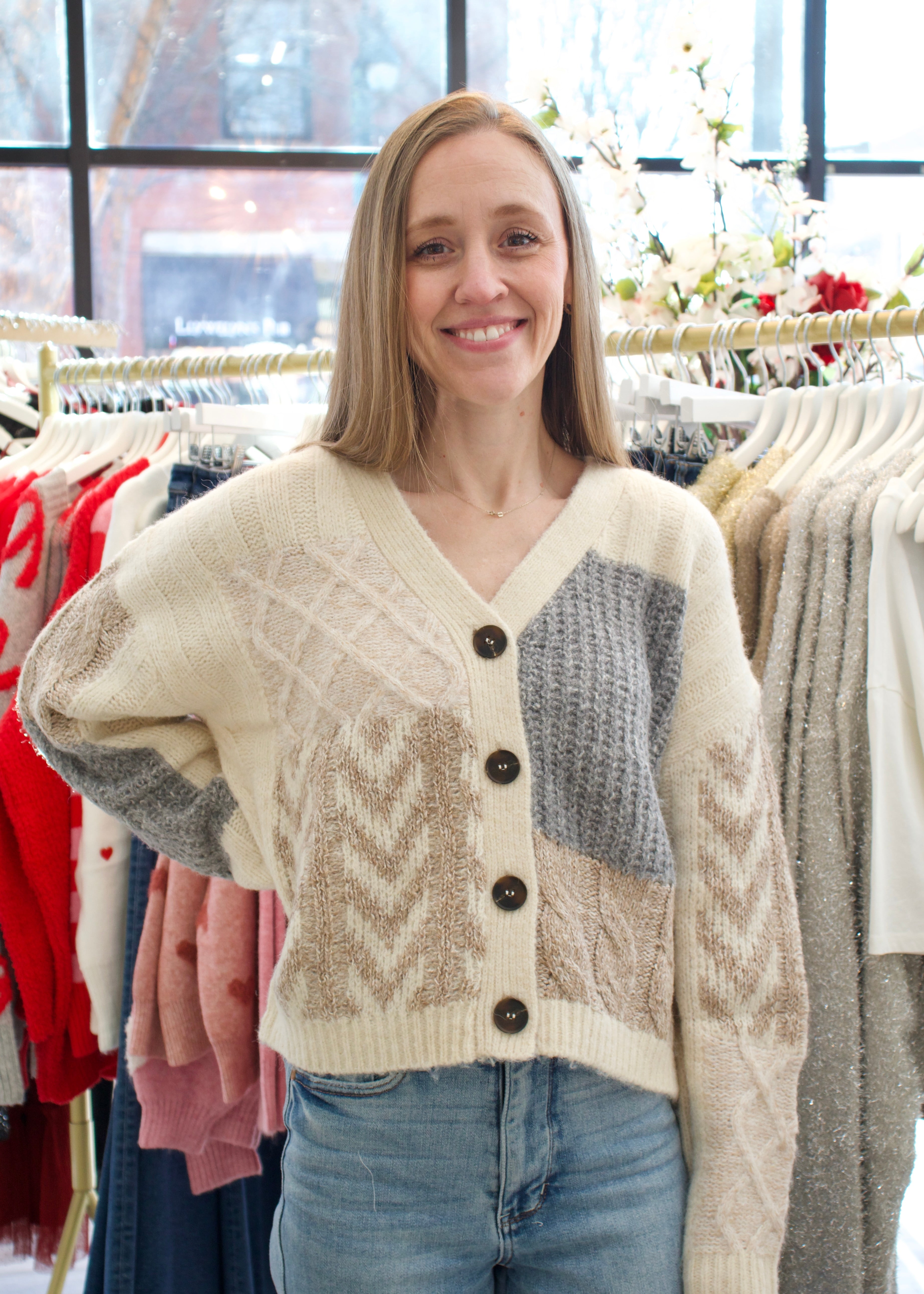 Layer up with personality in this charming V-neck cardigan! Featuring a fun patchwork design that mixes textures and tones, it's the perfect piece to throw on when you need a little extra warmth and a whole lot of style. Smooth button closure makes it easy to adjust your vibe throughout the day. Cozy meets quirky!