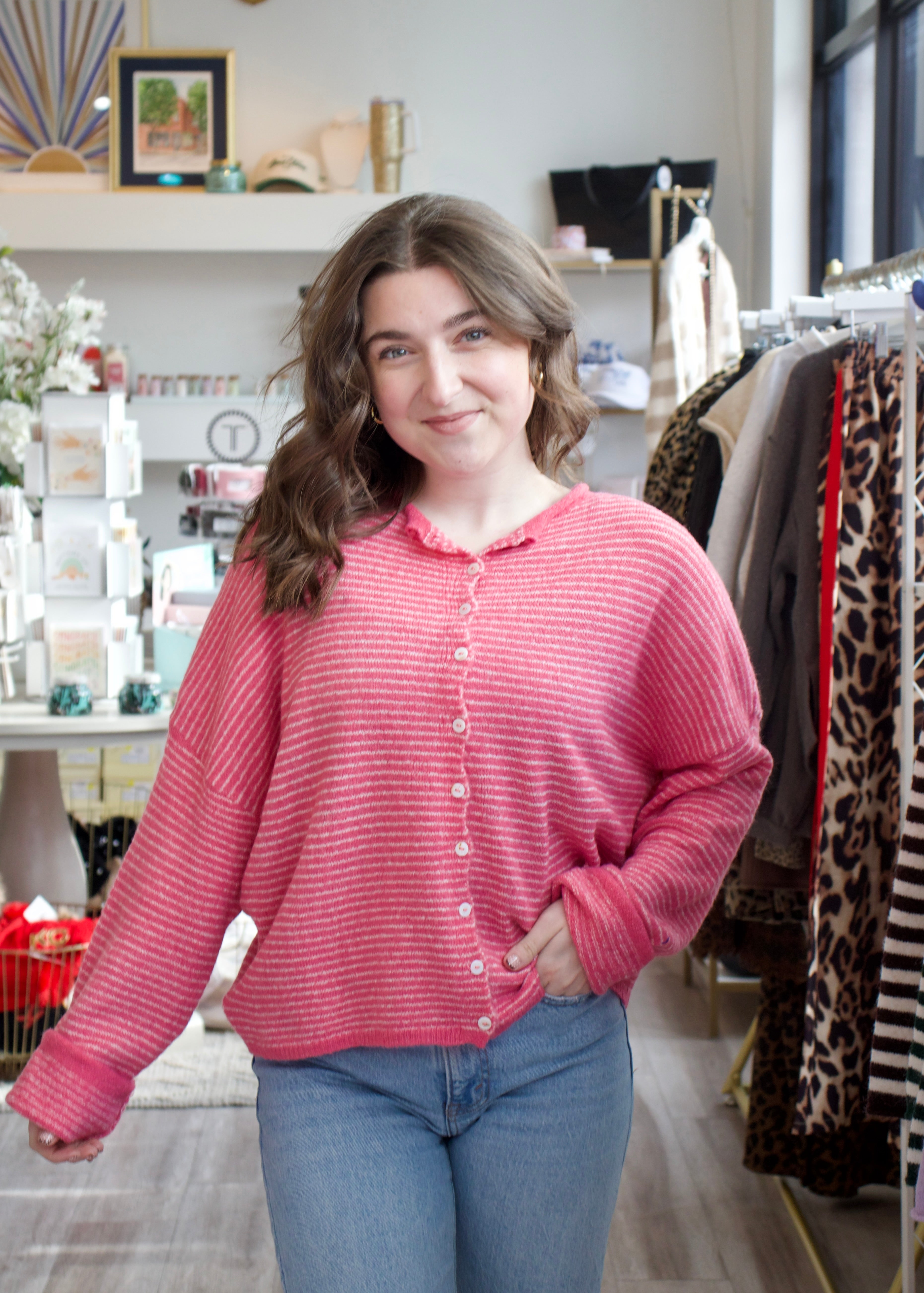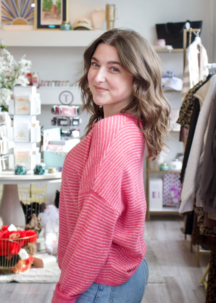 Slip into effortless style with the Pin Stripe Piper Cardigan in bubblegum! This oversized beauty features classic pin stripes that add visual interest while the relaxed fit keeps you cozy all day long. Perfect for layering over your favorite tee or dress, it's the go-to piece for casual Fridays and weekend hangouts. Soft, comfortable, and undeniably chic—your new wardrobe staple awaits!