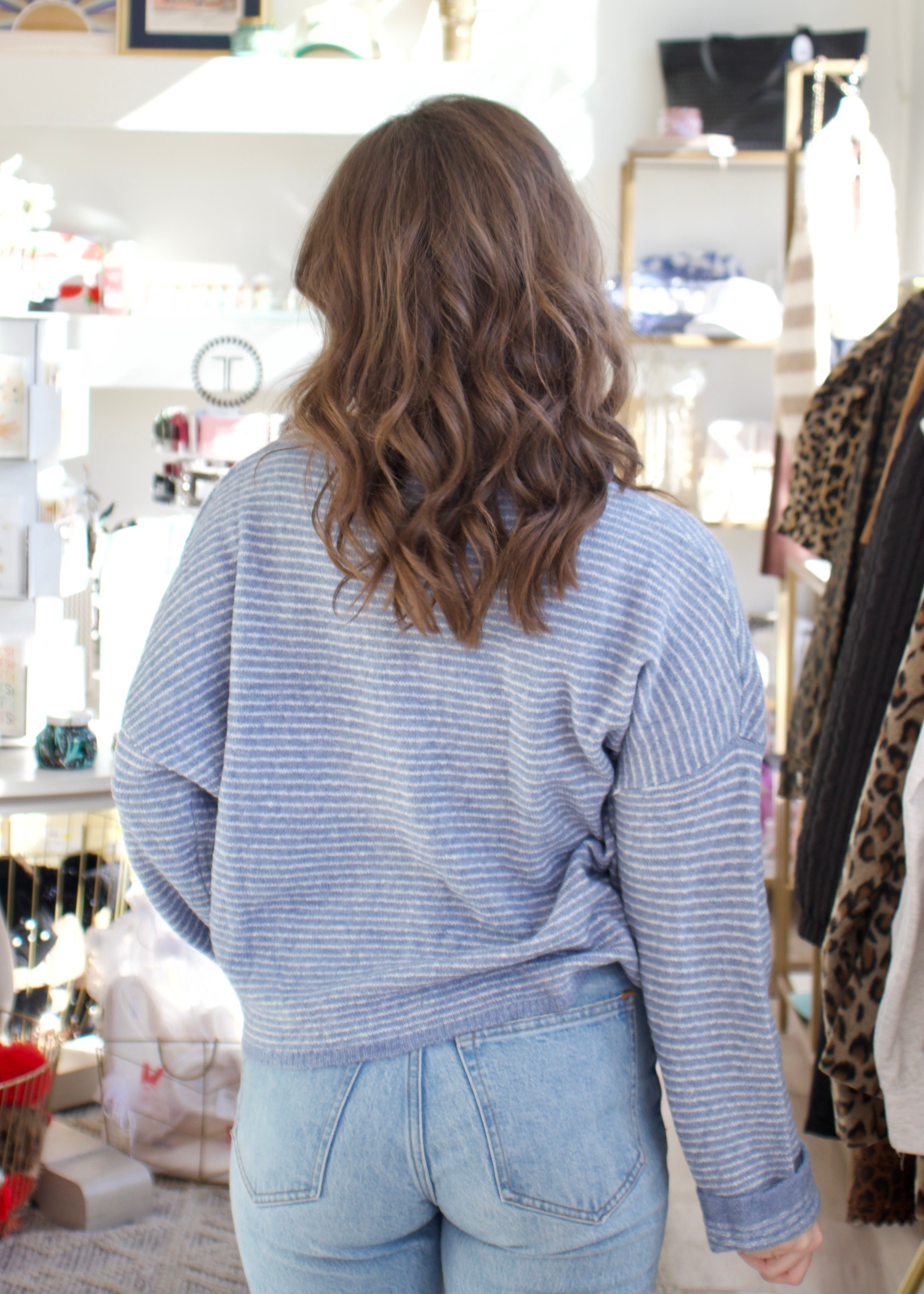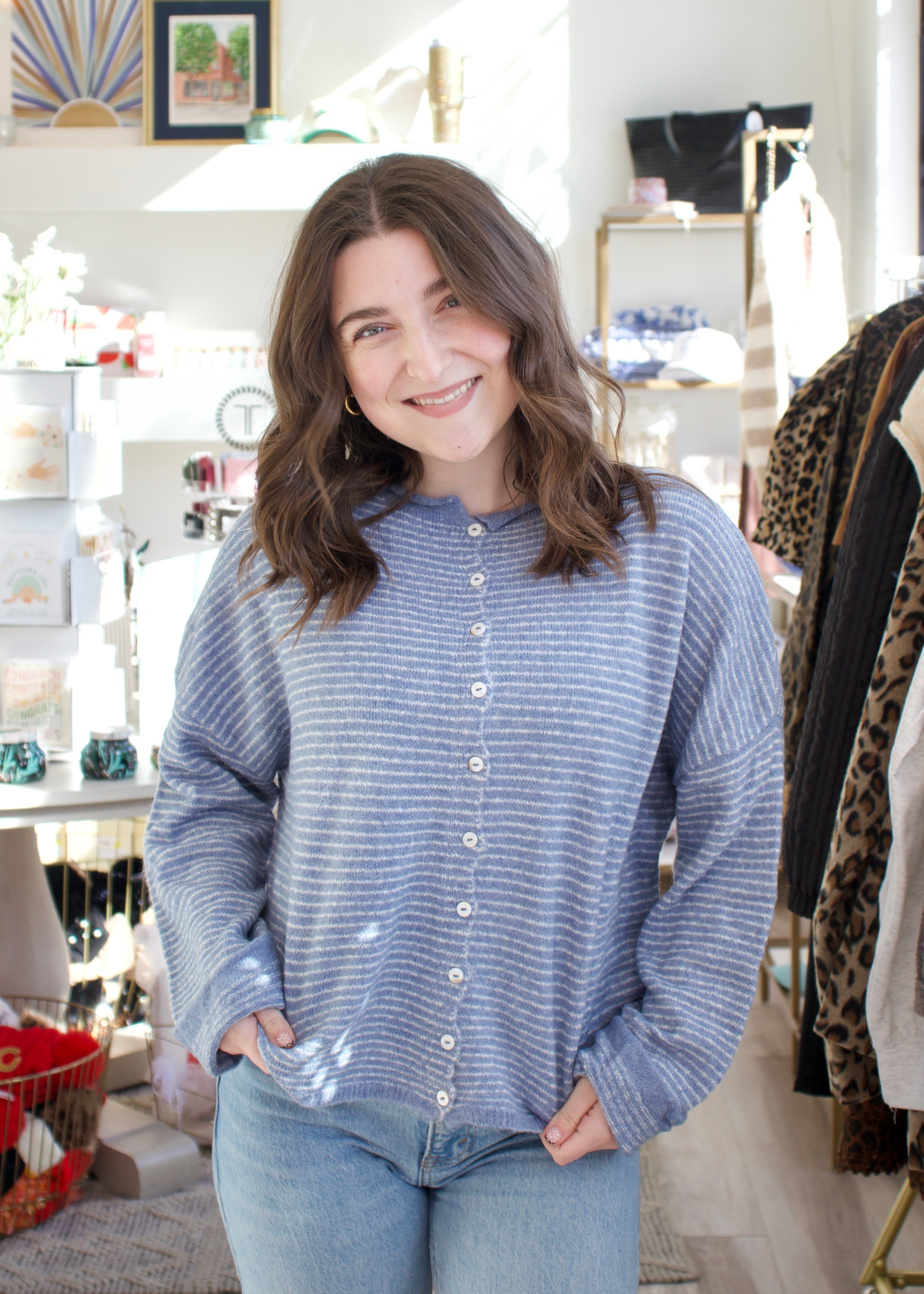 Slip into effortless style with the Pin Stripe Piper Cardigan in dusty blue! This oversized beauty features classic pin stripes that add visual interest while the relaxed fit keeps you cozy all day long. Perfect for layering over your favorite tee or dress, it's the go-to piece for casual Fridays and weekend hangouts. Soft, comfortable, and undeniably chic—your new wardrobe staple awaits!