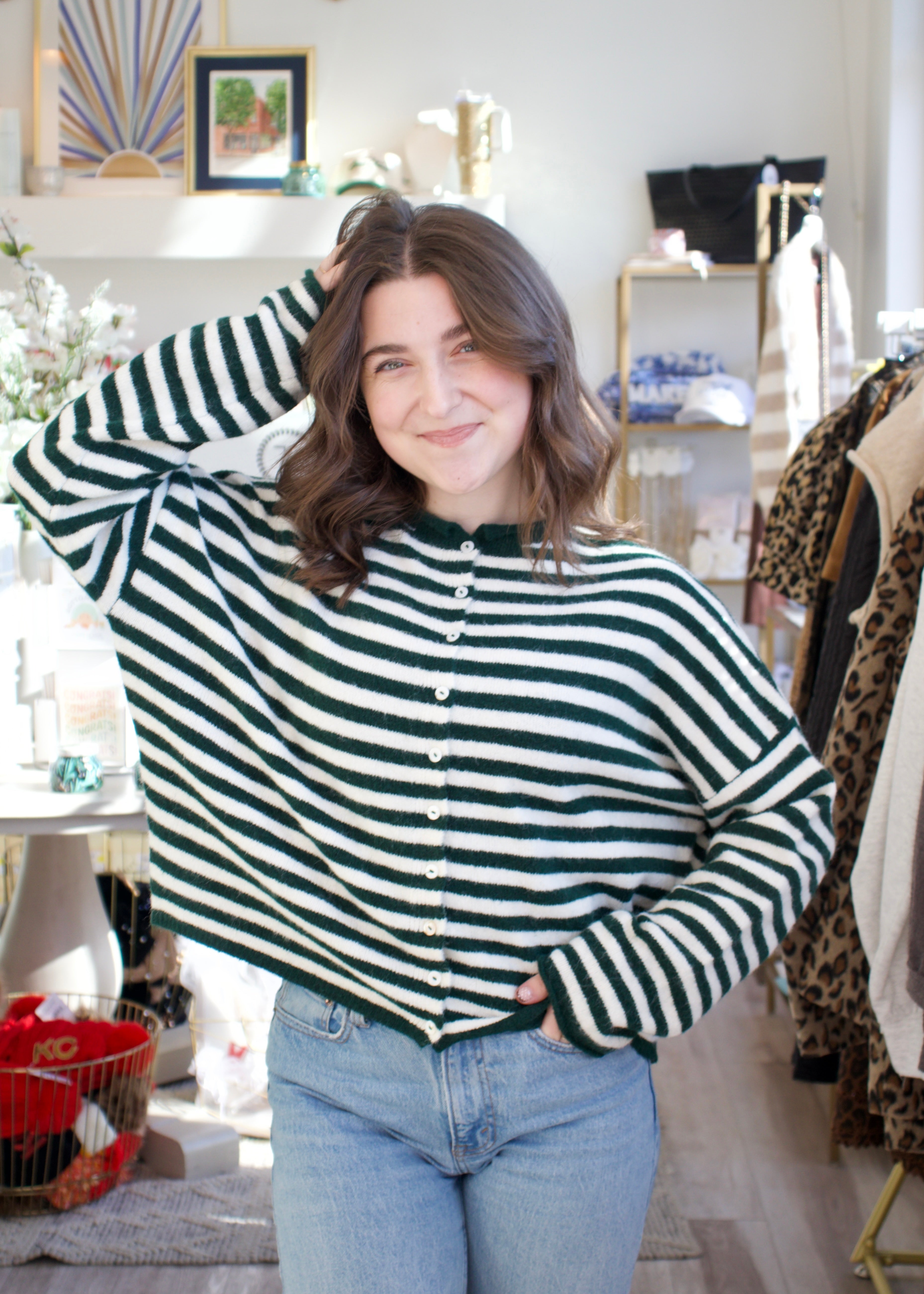 Meet your new favorite layer! The Striped Piper Cardigan in forest features fun stripes and an oversized silhouette that's perfect for throwing on over anything. Cozy, cute, and ready to brighten your day.