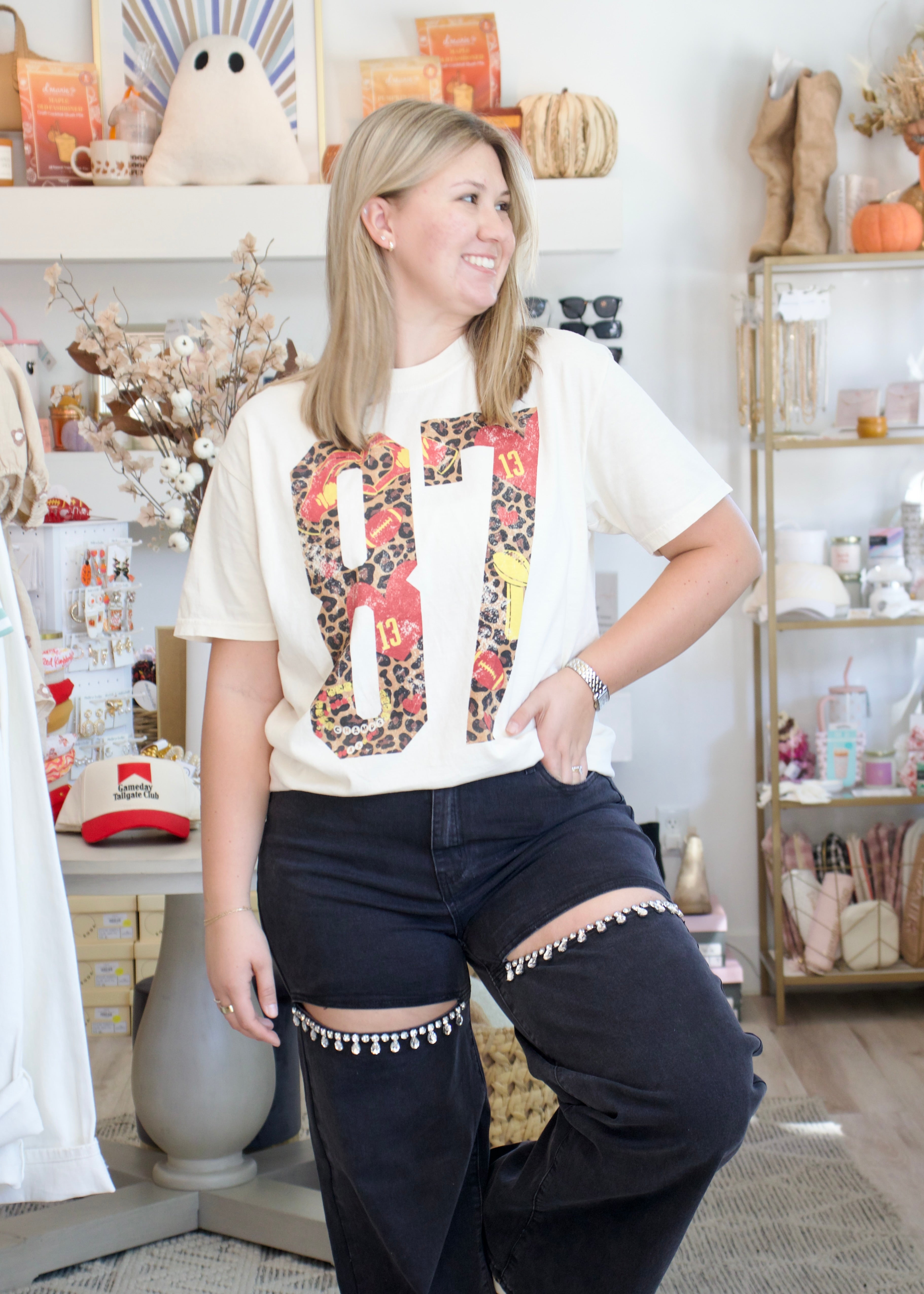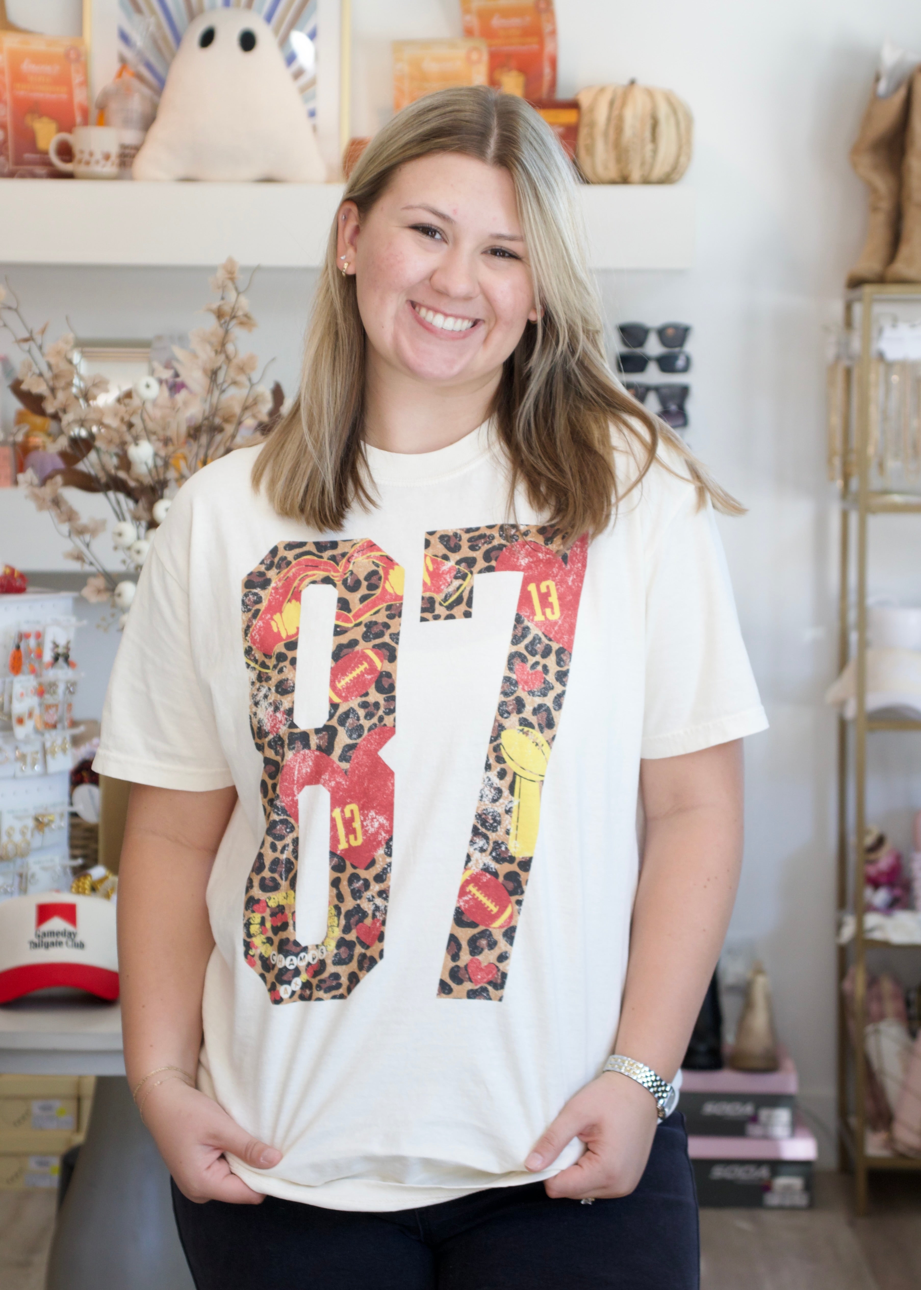 Score style points with our 87 Leopard Football Tee! With a nod to Taylor Swift, this graphic tee showcases Kelce's 87. Gear up and channel your inner Swiftie on and off the field! Go team!