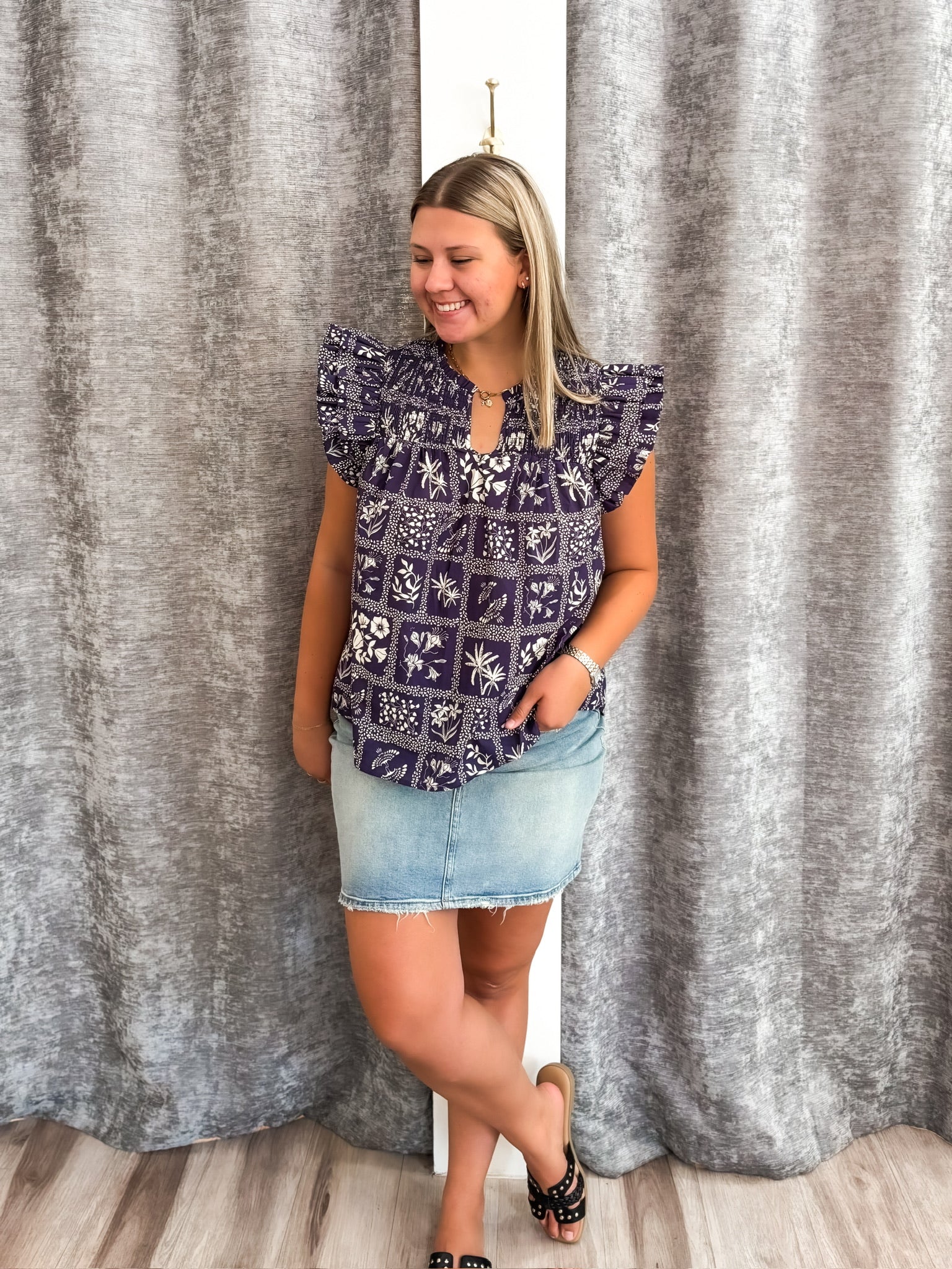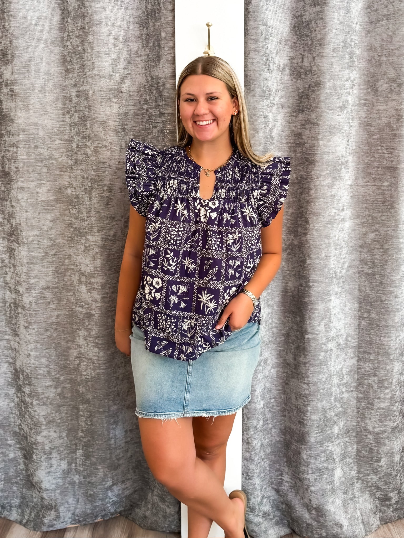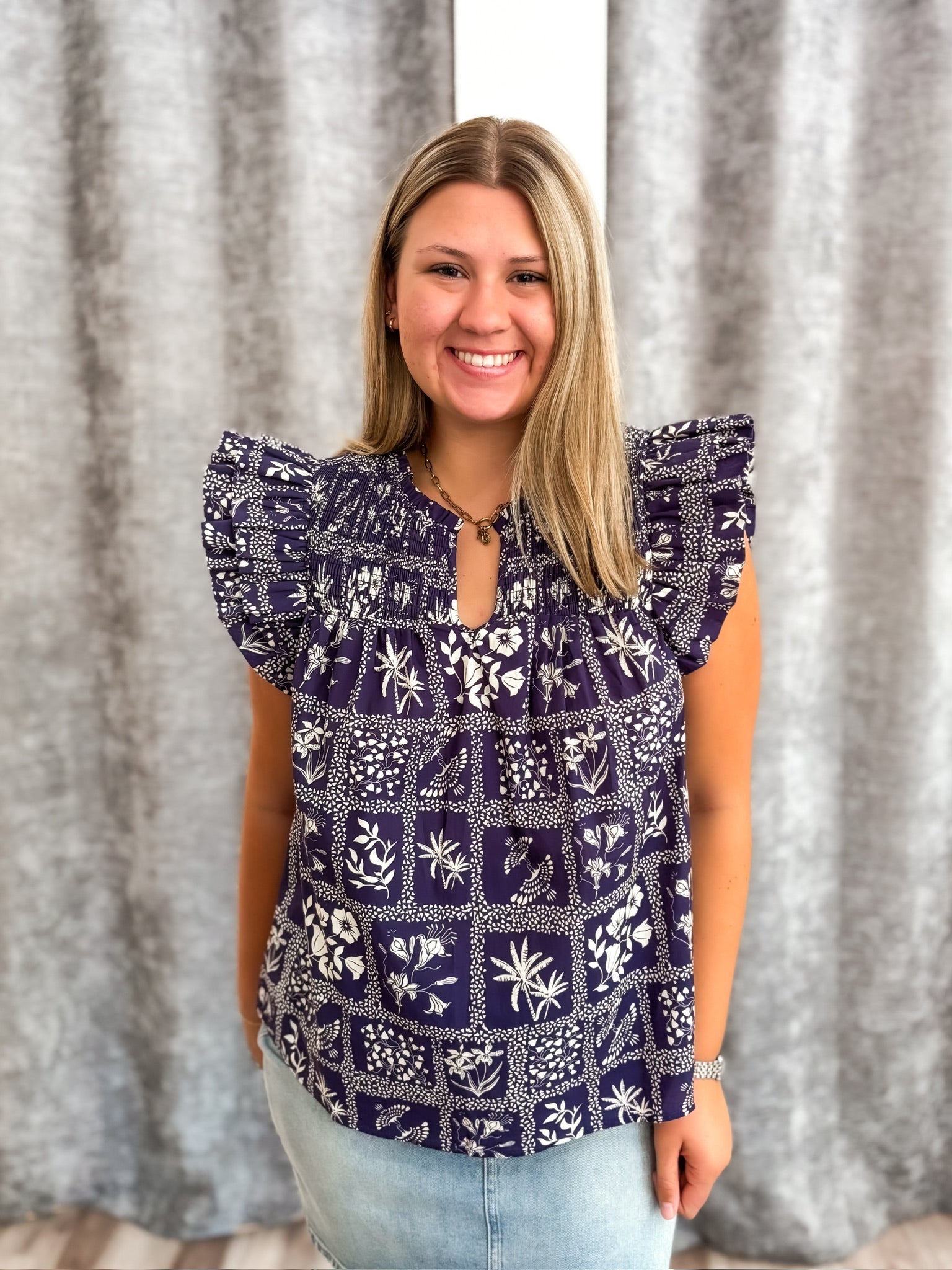 Elevate your fall wardrobe with this navy blouse featuring delicate flutter sleeves and an abstract design that adds artistic flair. The smocked bodice offers a comfortable, flattering fit, making it perfect for layering during seasonal transitions. Its lightweight fabric and elegant ruffles create a feminine silhouette that effortlessly blends style and comfort.