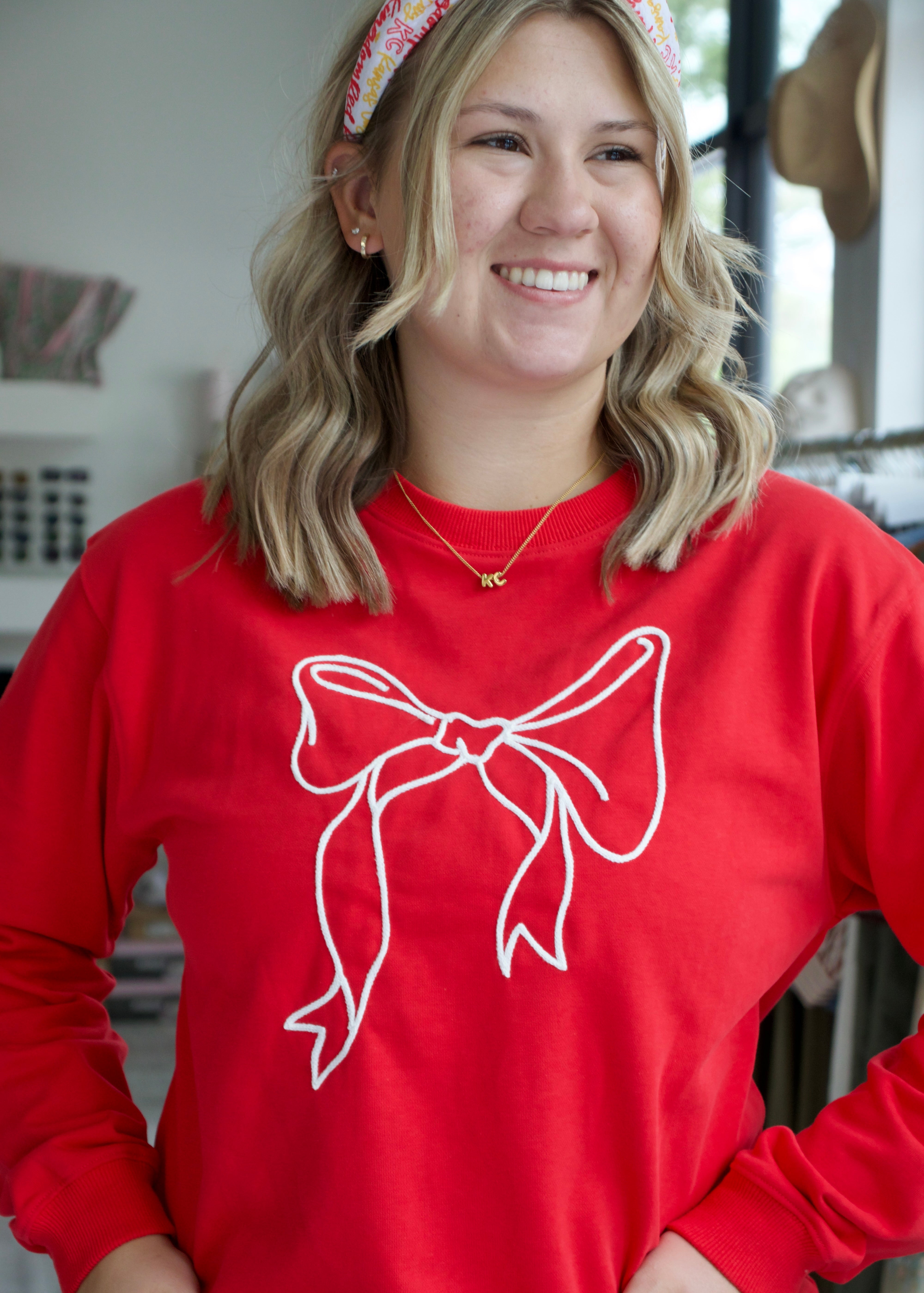 This red terry pullover features a charming bow detail that adds a touch of elegance to casual comfort. Crafted for a cozy fit, it’s perfect for layering or wearing on its own, making it a versatile addition to your wardrobe that combines style with everyday ease.