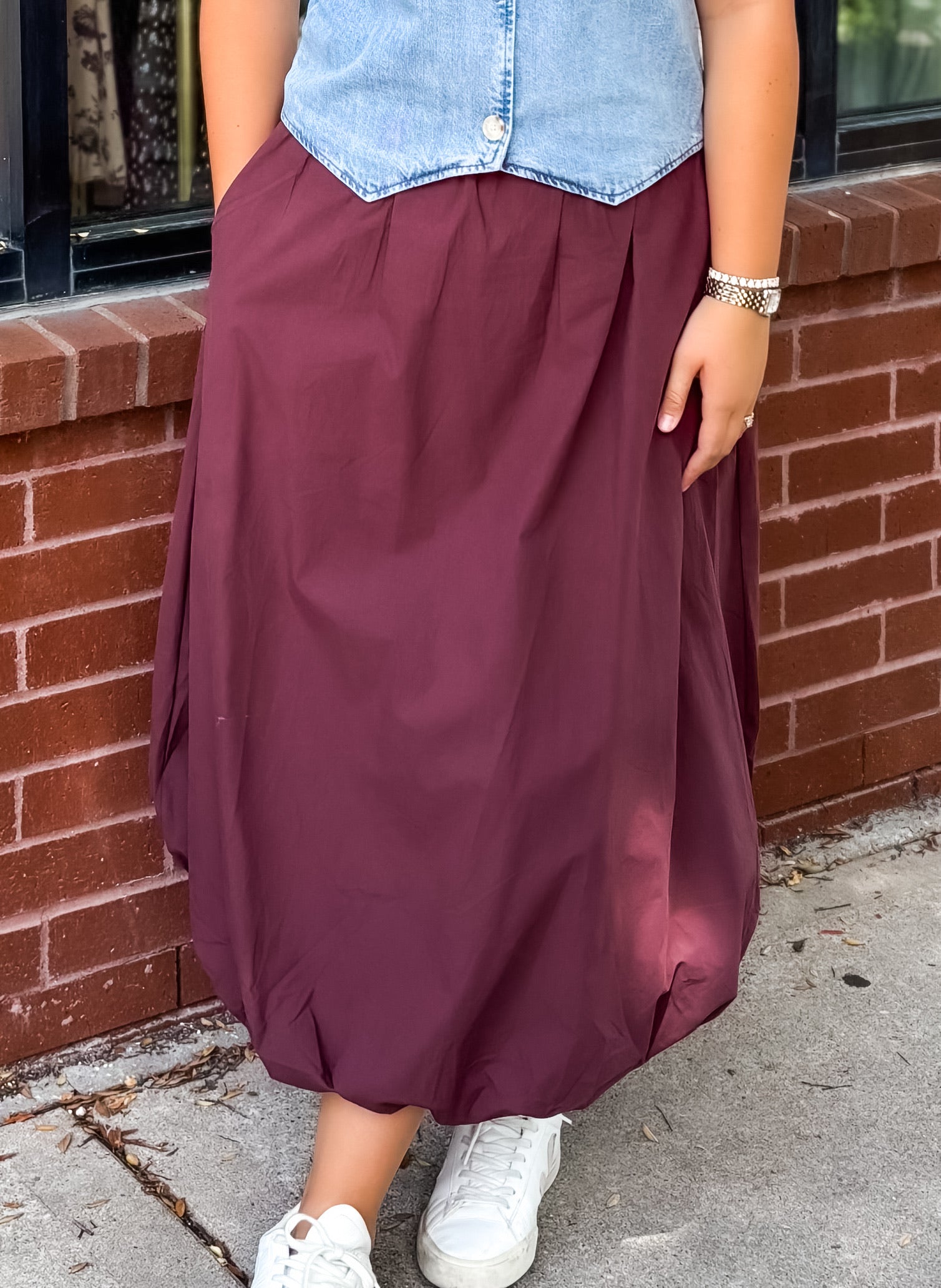 Showcase your fashion sense with our Bubble Midi Skirt in delicious chocolate! This trendy skirt not only looks great, but it also features convenient pockets for carrying your essentials. Upgrade your wardrobe with this must-have piece that combines style and functionality. Perfect for any occasion, get ready to turn heads and make a statement!