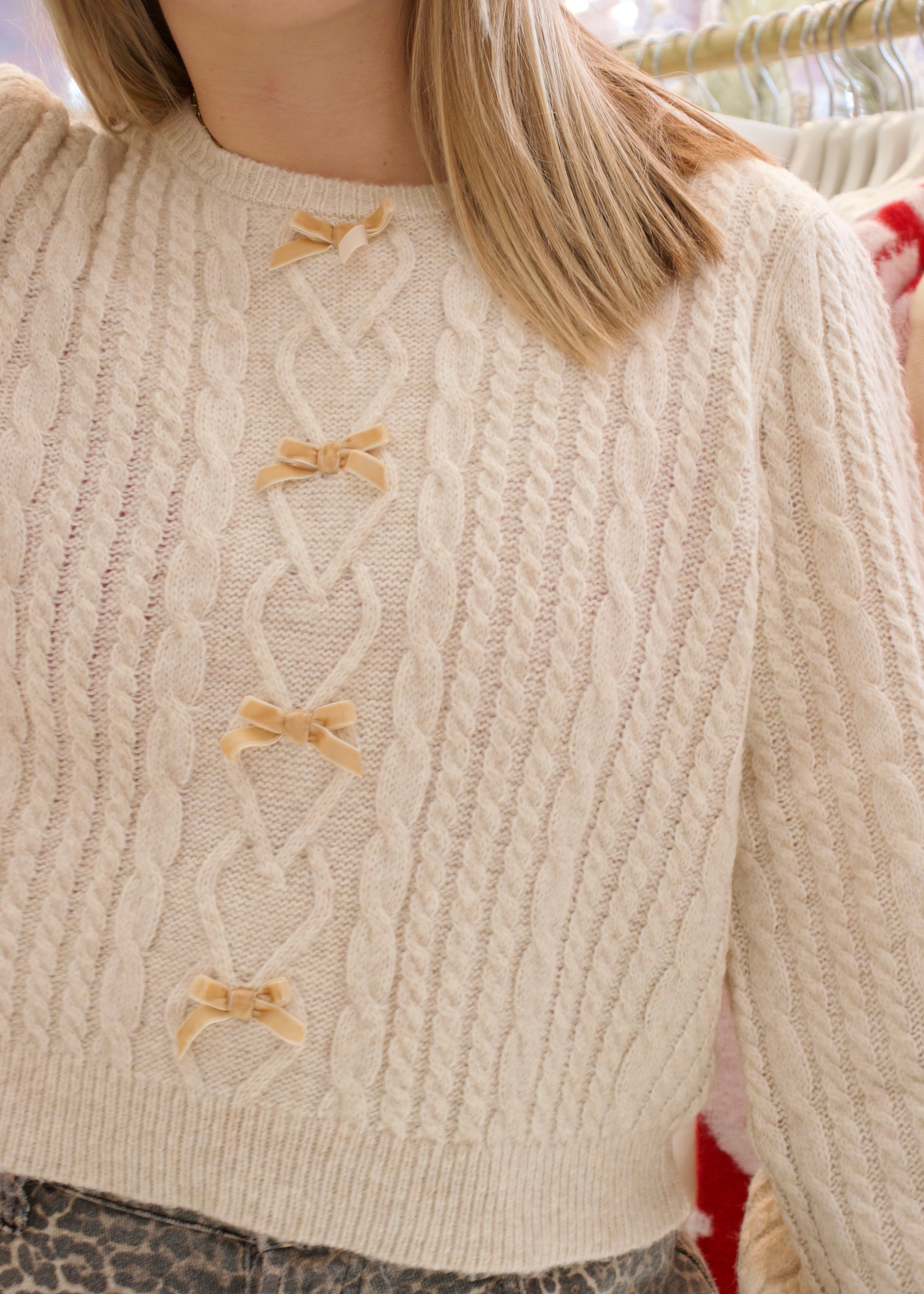 Meet your new favorite sweater! This cream cable knit beauty combines timeless texture with a delightful twist—a luxe velvet bow cascading down the center front. The classic cable pattern pairs perfectly with the soft sheen of the bow for an unexpectedly charming look. Whether you're dressing up or keeping it casual, this sweater brings just the right amount of personality and polish to any outfit!