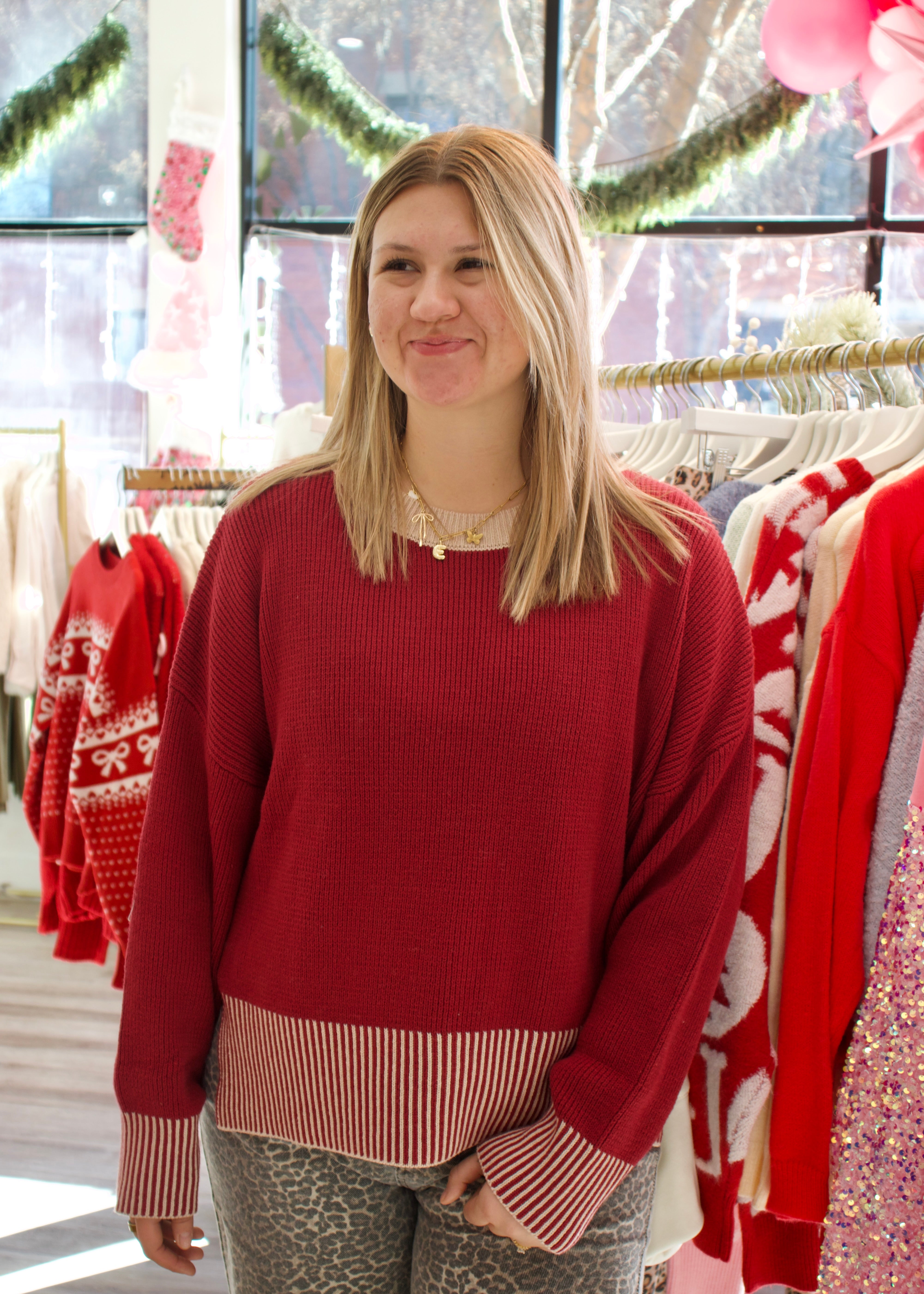 This oxblood sweater is a stylish statement piece with personality to spare. Eye-catching button details run down the back, adding an unexpected twist to a classic silhouette. Striped trim along the cuffs and waistline brings a fun pop of contrast that elevates your everyday look. Soft and versatile, it's the perfect layer for mixing and matching with your wardrobe essentials.