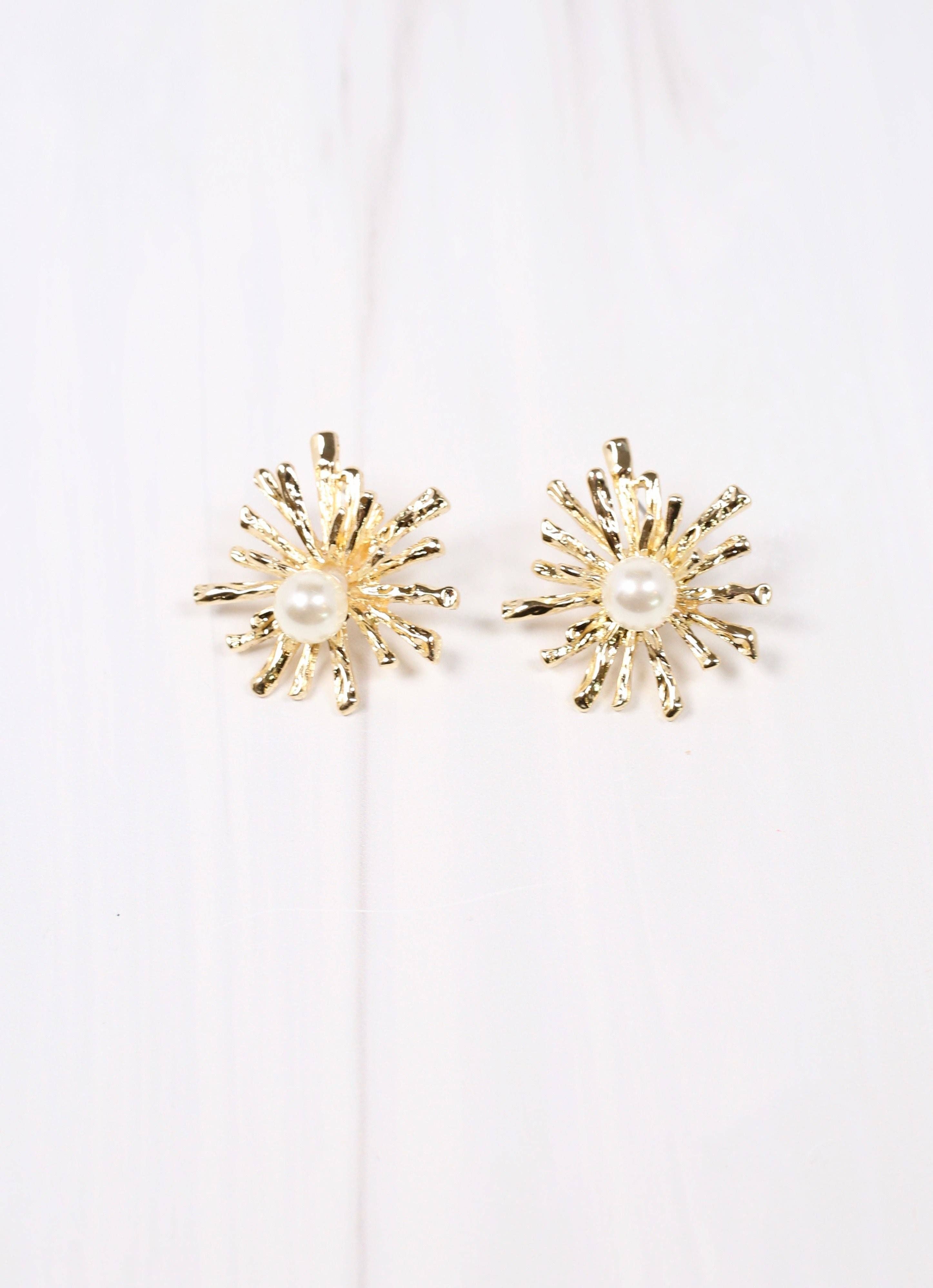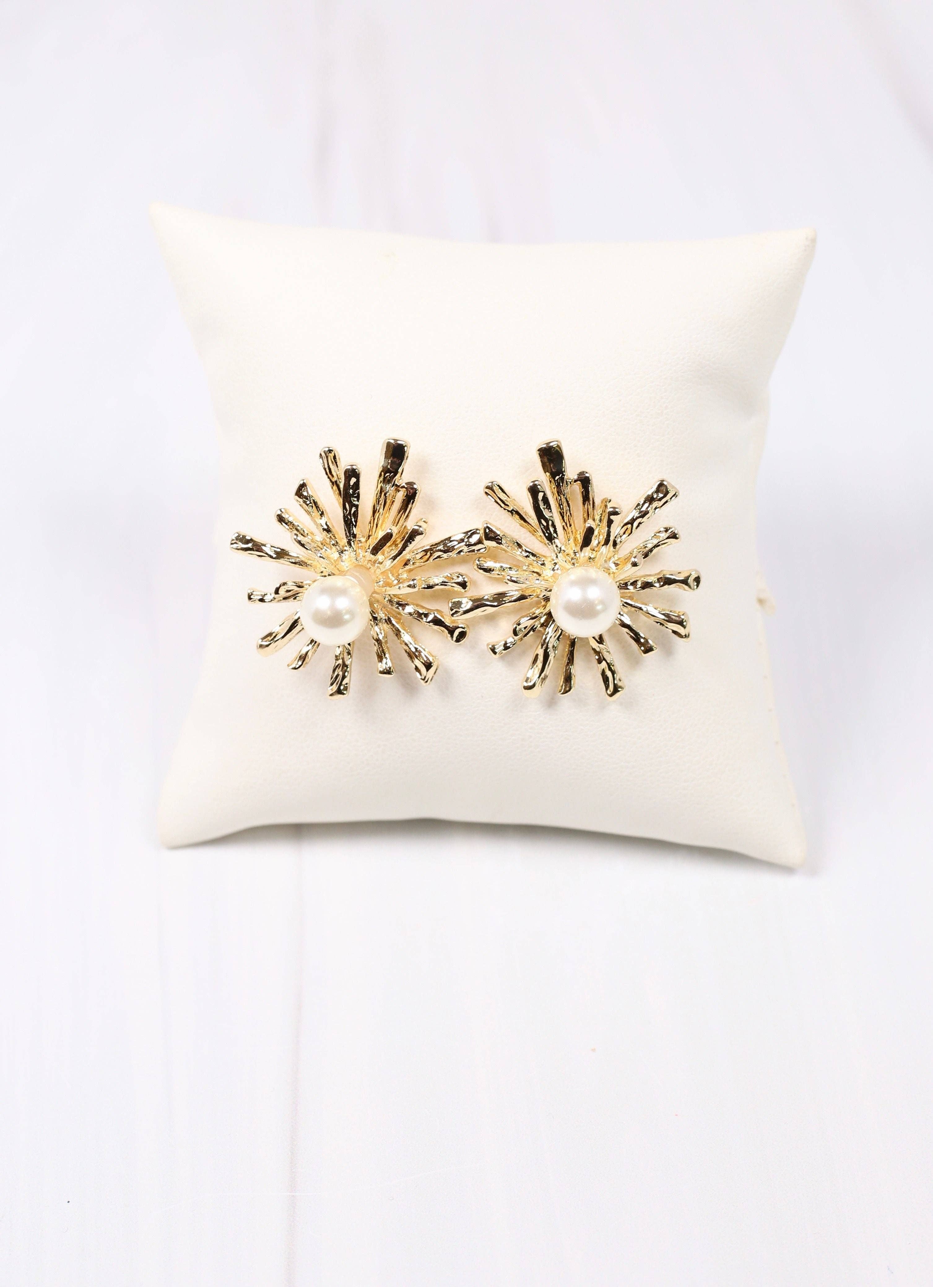 This gorgeous sunburst style earring has a shiny metal finish and an accent middle pearl on a post back.
