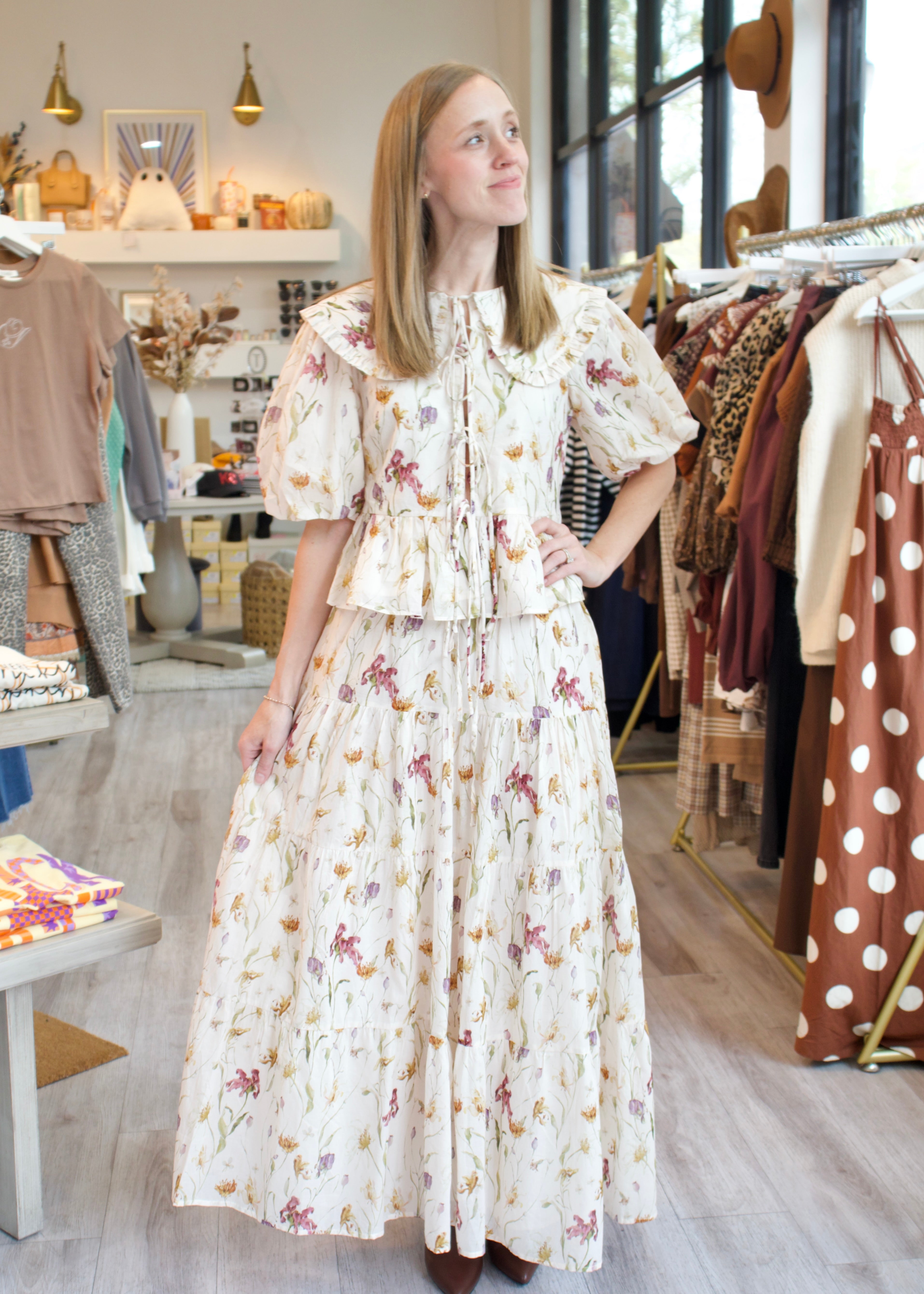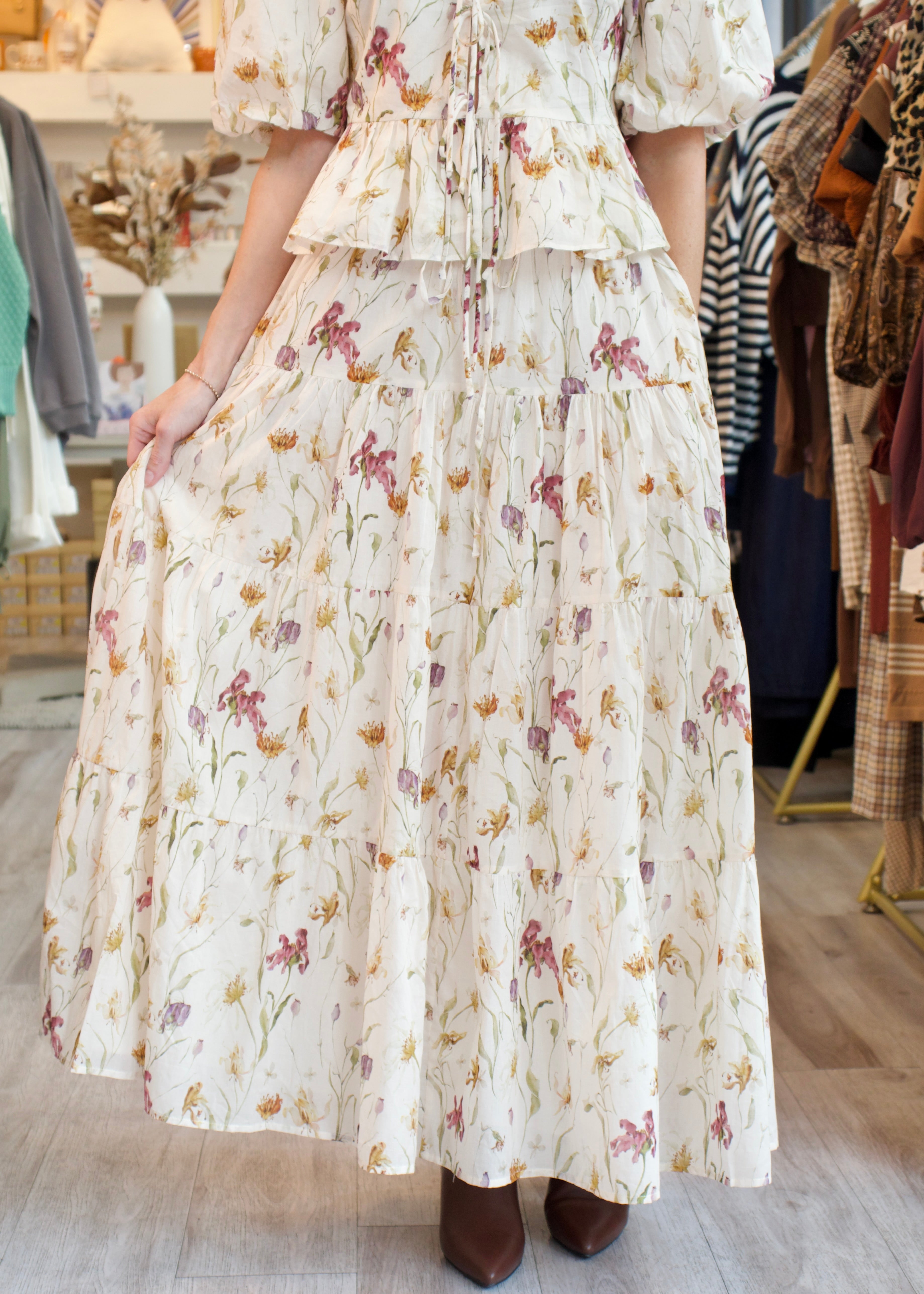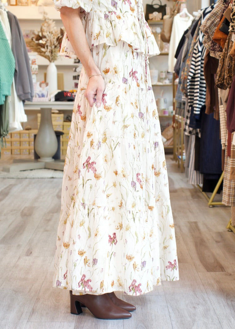 Elevate your wardrobe with this stunning Floral Maxi Skirt in Ivory. Featuring an enchanting floral pattern that captures effortless elegance, this versatile piece transitions seamlessly from casual daytime looks to sophisticated evening ensembles. The flowing maxi silhouette flatters every figure while providing comfortable all-day wear. Perfect for layering or styling solo, this timeless skirt becomes an instant favorite for any occasion. Embrace the romance of botanical prints and the grace of a classic maxi cut.