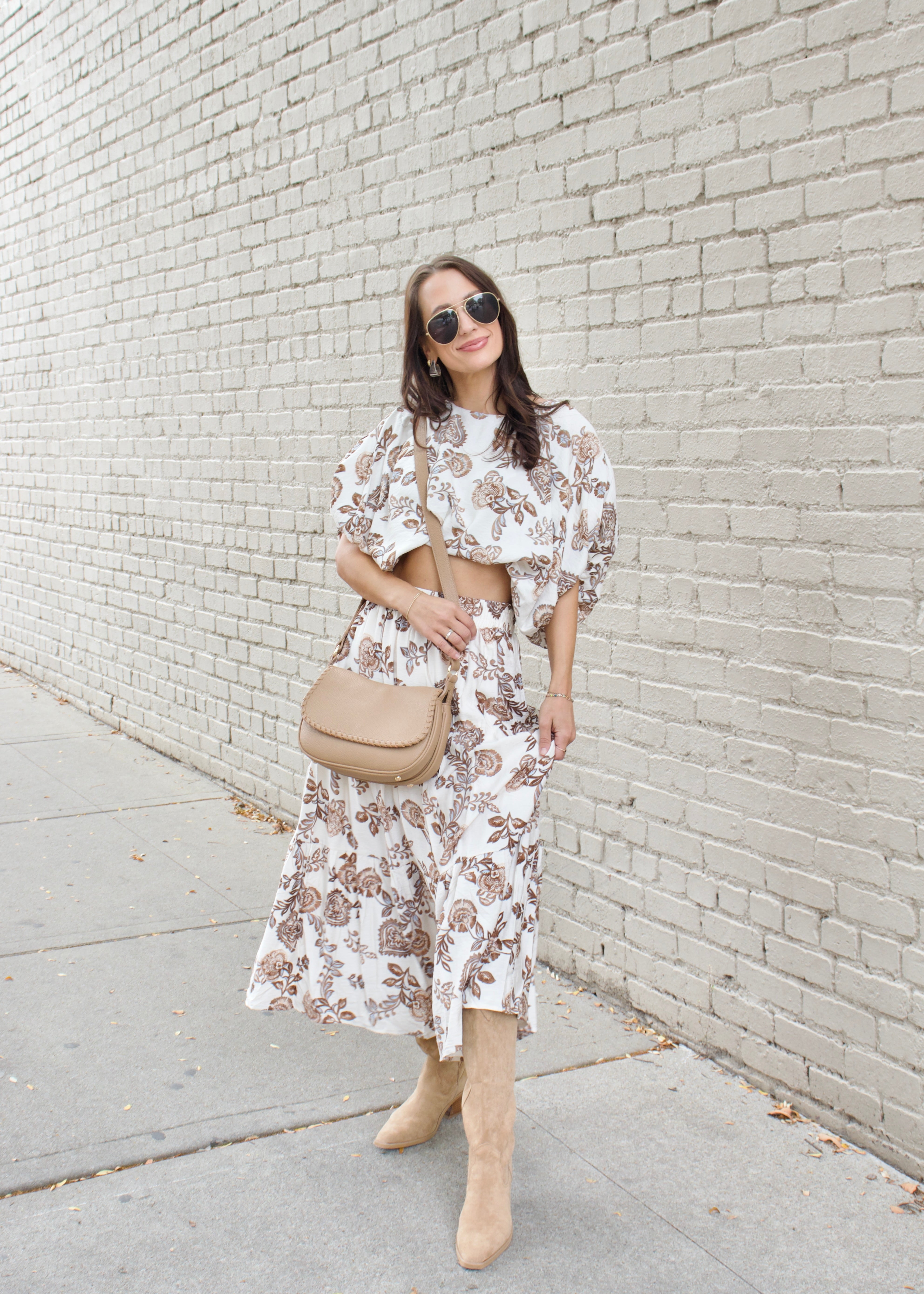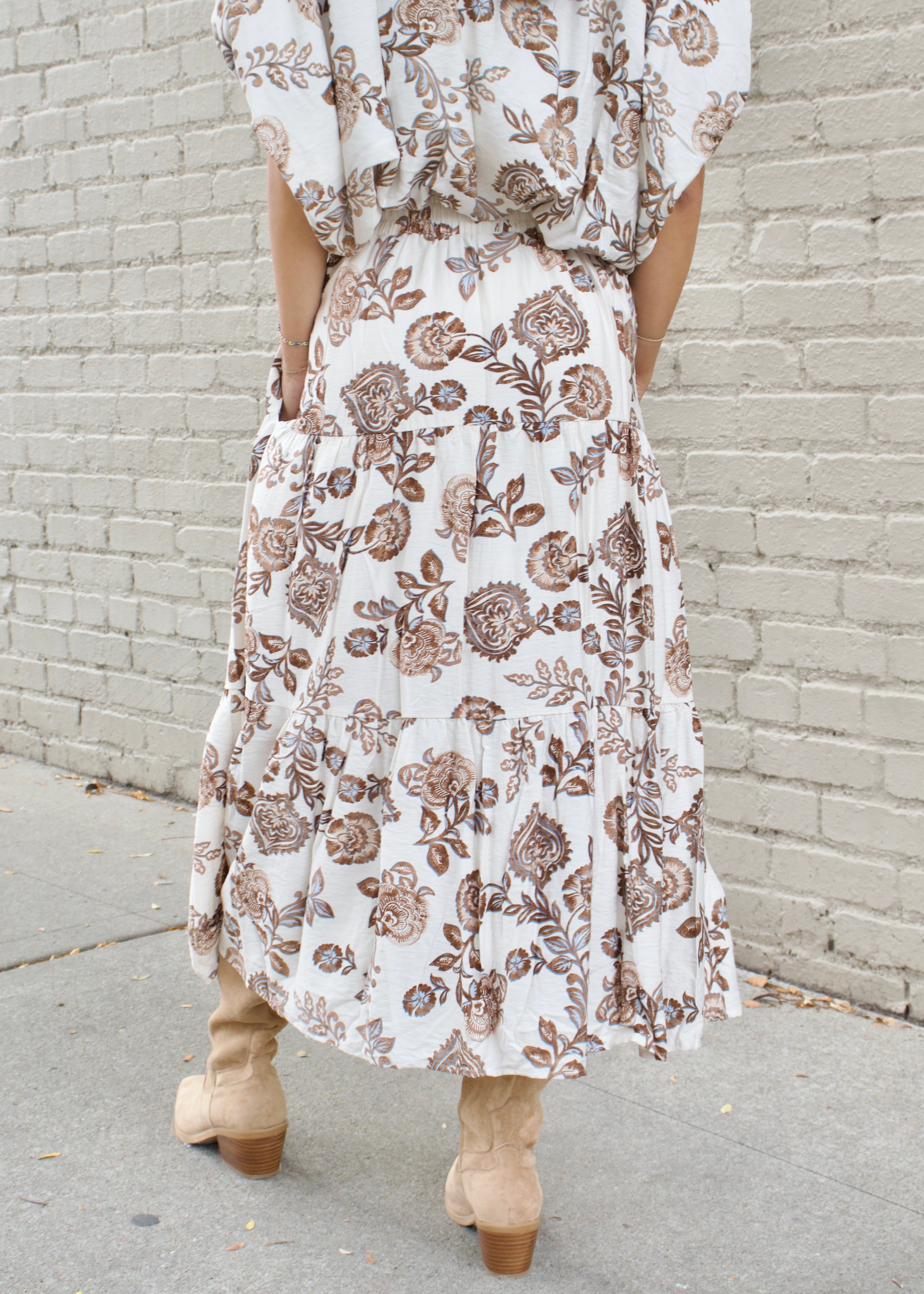 Elevate your wardrobe with this Floral Tiered Midi Skirt in warm brown tones. Designed with practical pockets and a flattering tiered silhouette, it blends comfort and style effortlessly. Pair it with the matching set for a cohesive, polished look that’s perfect for any occasion. Enjoy the versatility and ease of wearing a skirt that moves with you while keeping essentials close at hand.