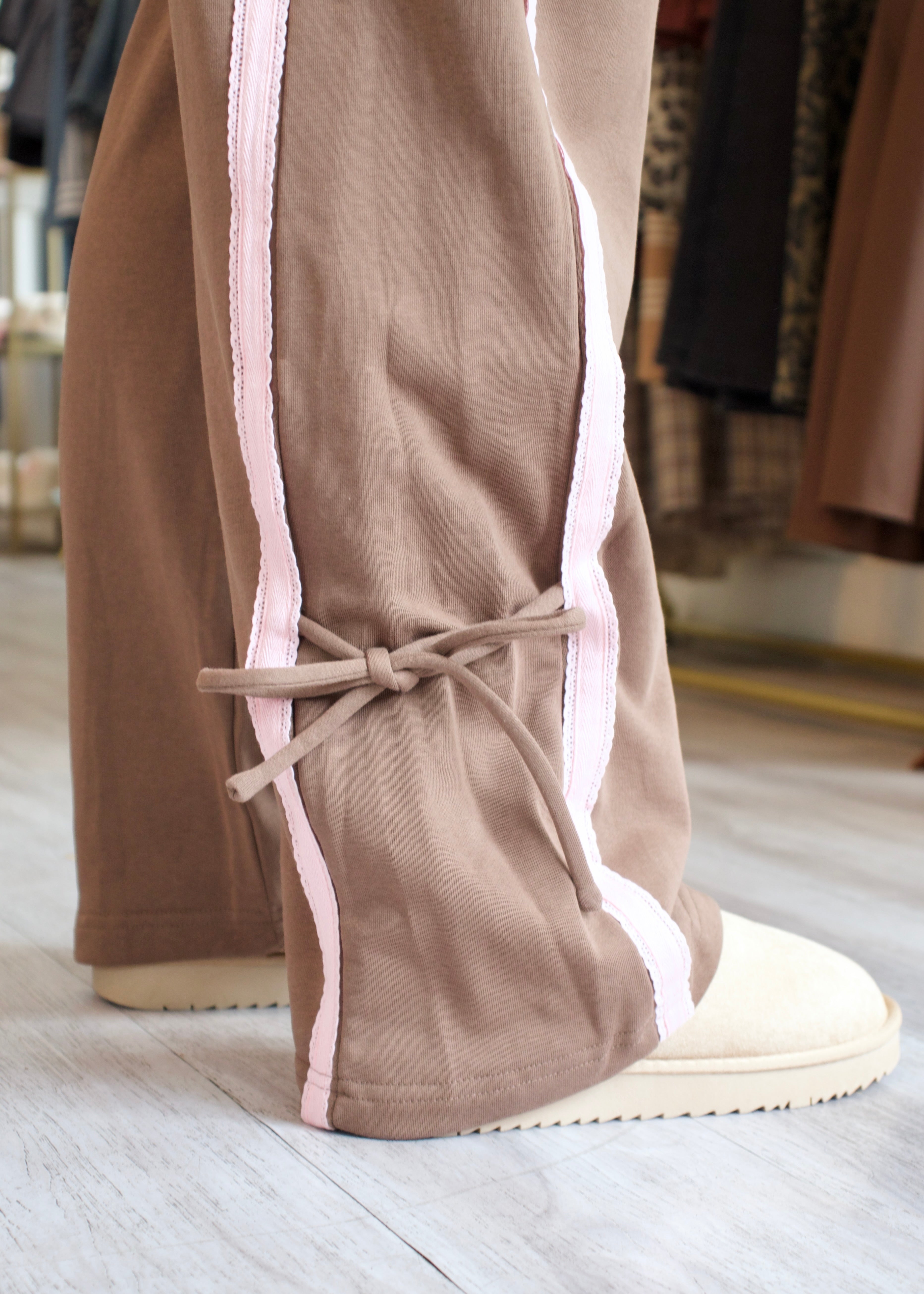 Elevate your casual wardrobe with these Side Scallop Track Pants in a rich brown hue. Featuring delicate lace trim along the sides and a charming bow tie at the waist, they blend cozy comfort with feminine details. Perfect for lounging or stylish errands, these pants offer a flattering fit with a unique scalloped edge that sets them apart from ordinary activewear. Experience effortless style and softness in one must-have piece.