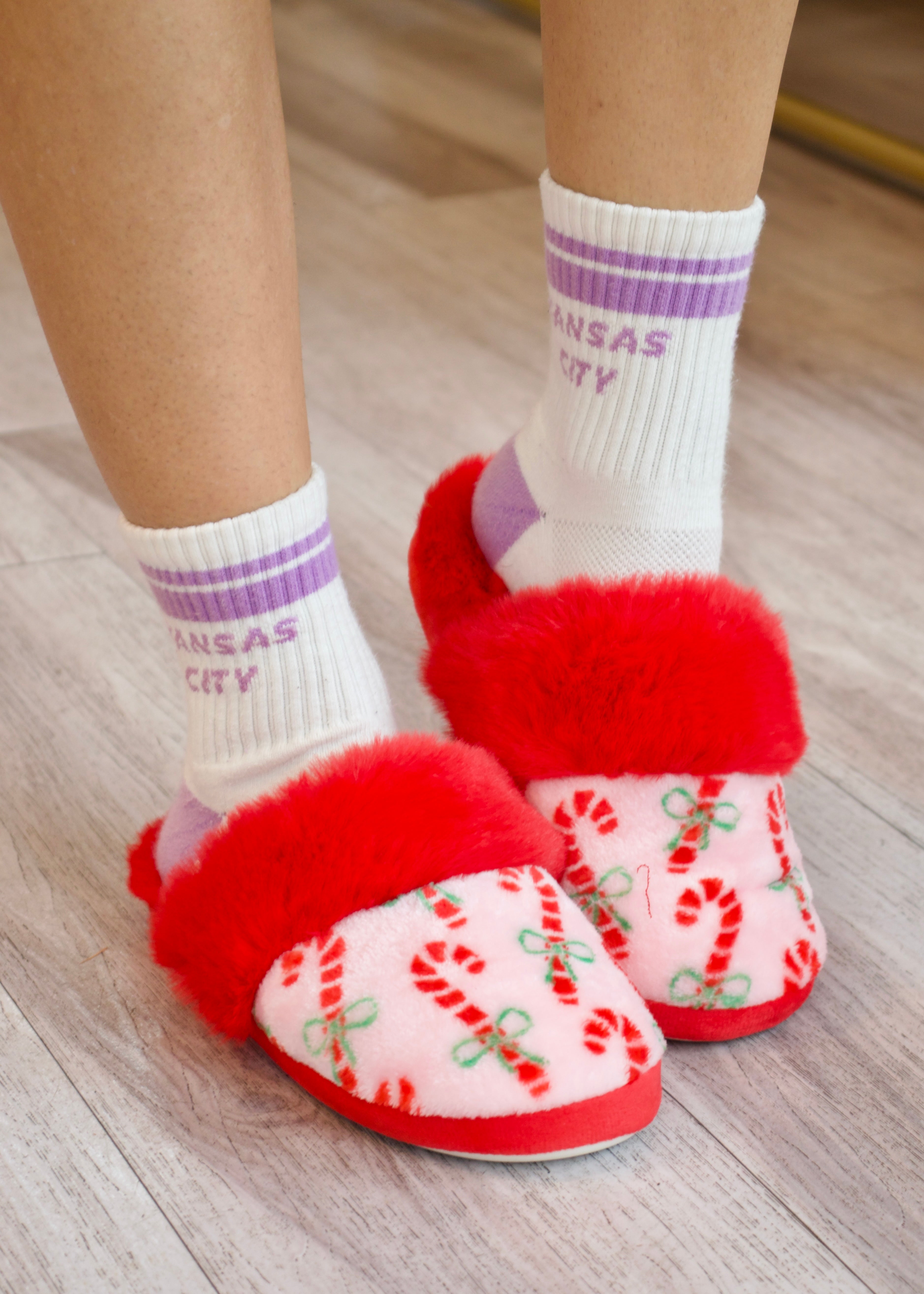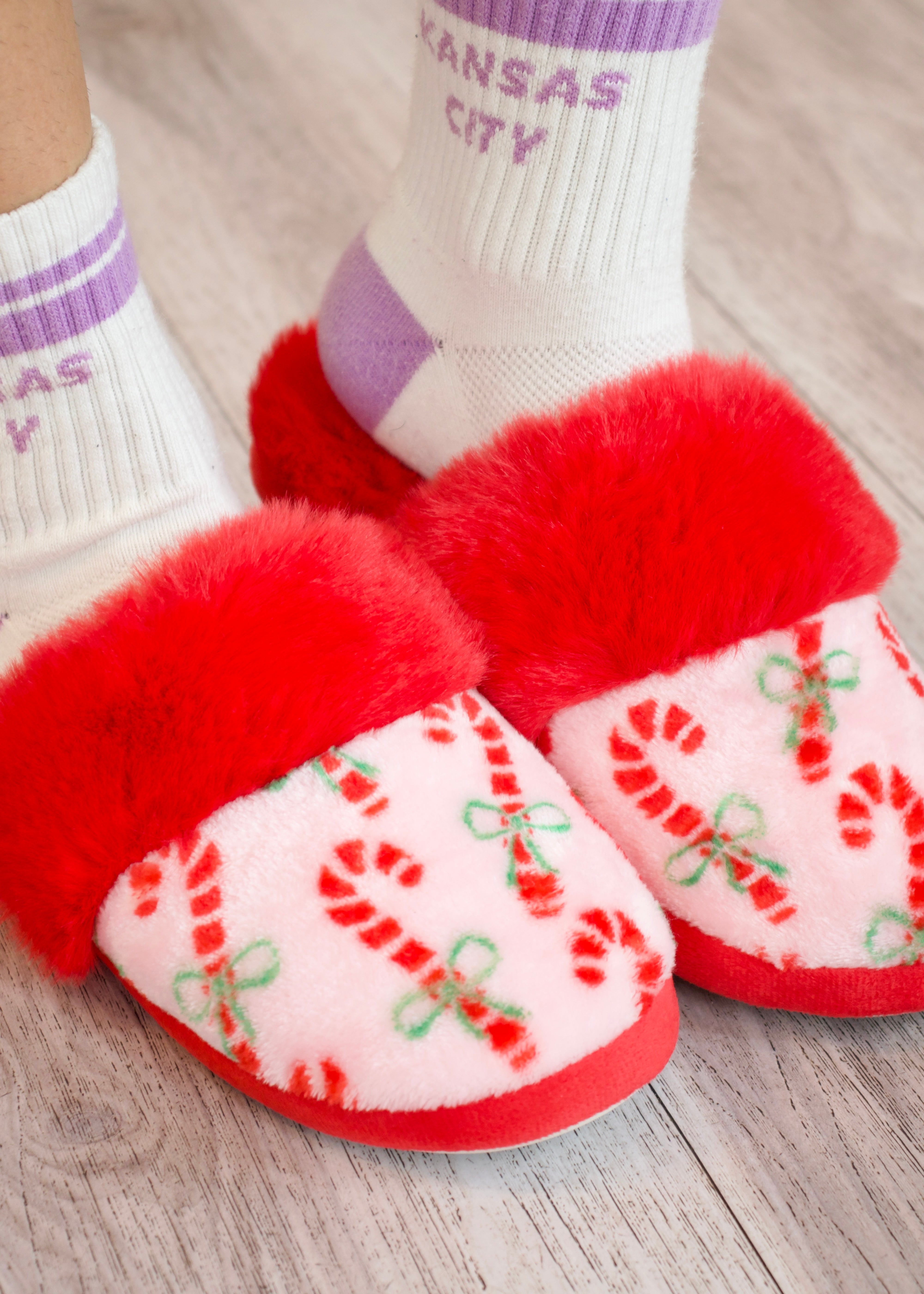 Get ready to sleigh in style! These candy cane slippers bring festive fun straight to your feet with bold red and white stripes and cozy comfort. Perfect for holiday lounging, they're a sweet way to celebrate the season in playful style.
