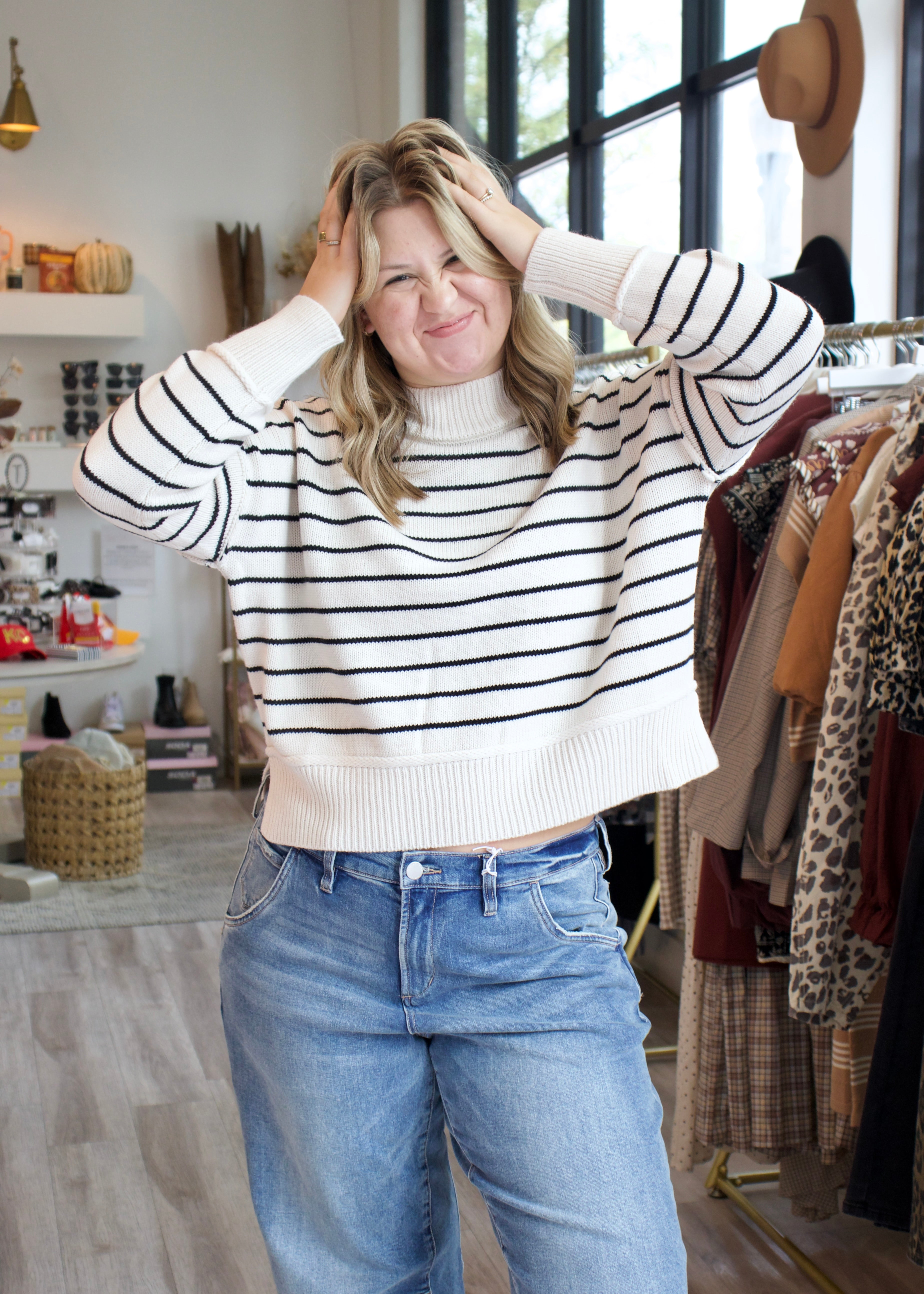 Stay cozy and stylish with this cream mock neck striped sweater. Its soft fabric and classic stripe pattern make it a versatile addition to your wardrobe, perfect for layering or wearing on its own. The mock neck adds a chic touch, keeping you warm without sacrificing comfort. Ideal for casual days or dressing up with your favorite accessories.