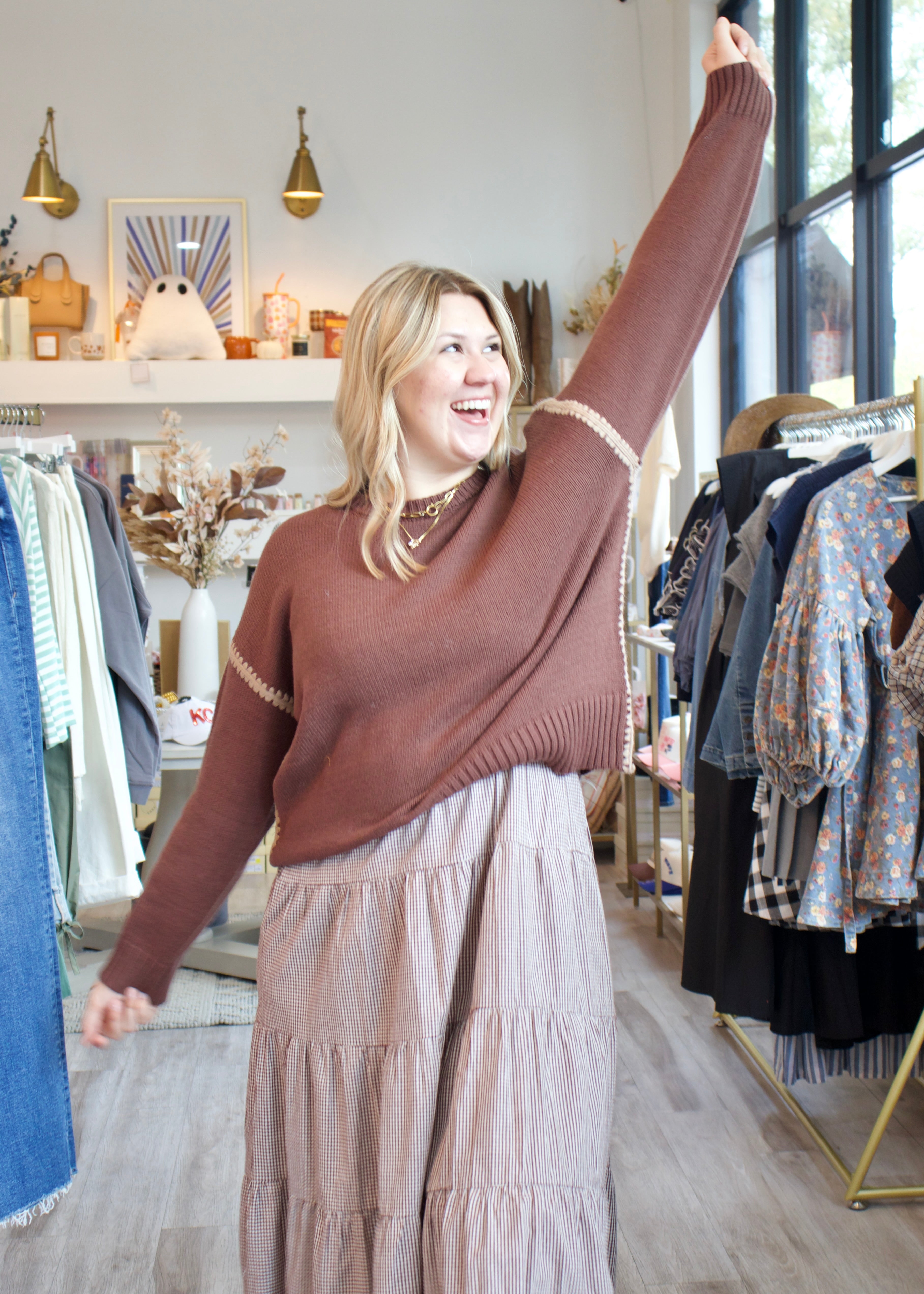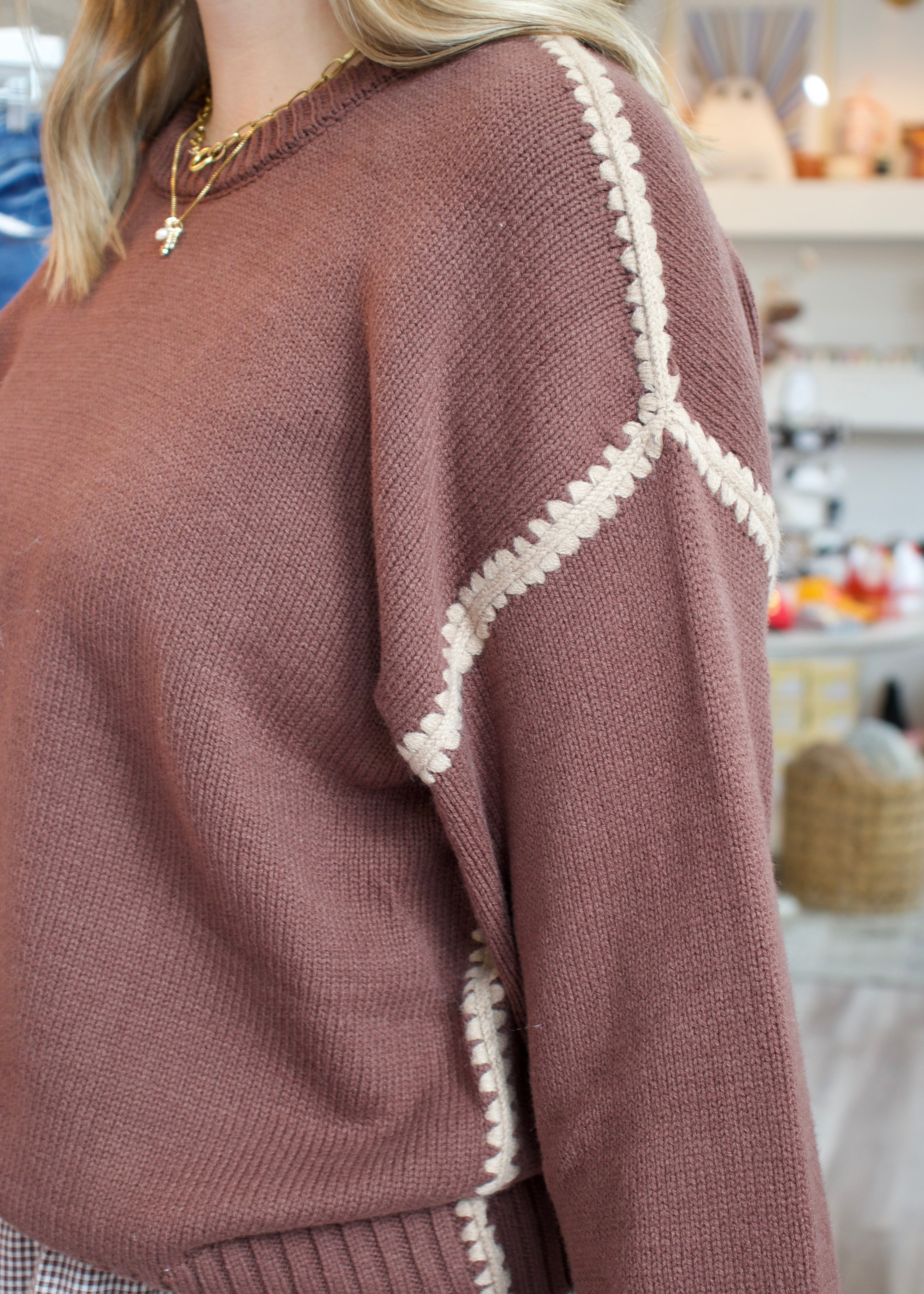 This Stitch Seam Sweater in rich chocolate offers a cozy yet stylish addition to your wardrobe. Crafted with attention to detail, its distinctive stitch seams create a subtle texture that elevates a classic silhouette. Perfect for layering or wearing on its own, this sweater delivers warmth and comfort without sacrificing sophistication. Embrace effortless style and all-day ease with this versatile piece.