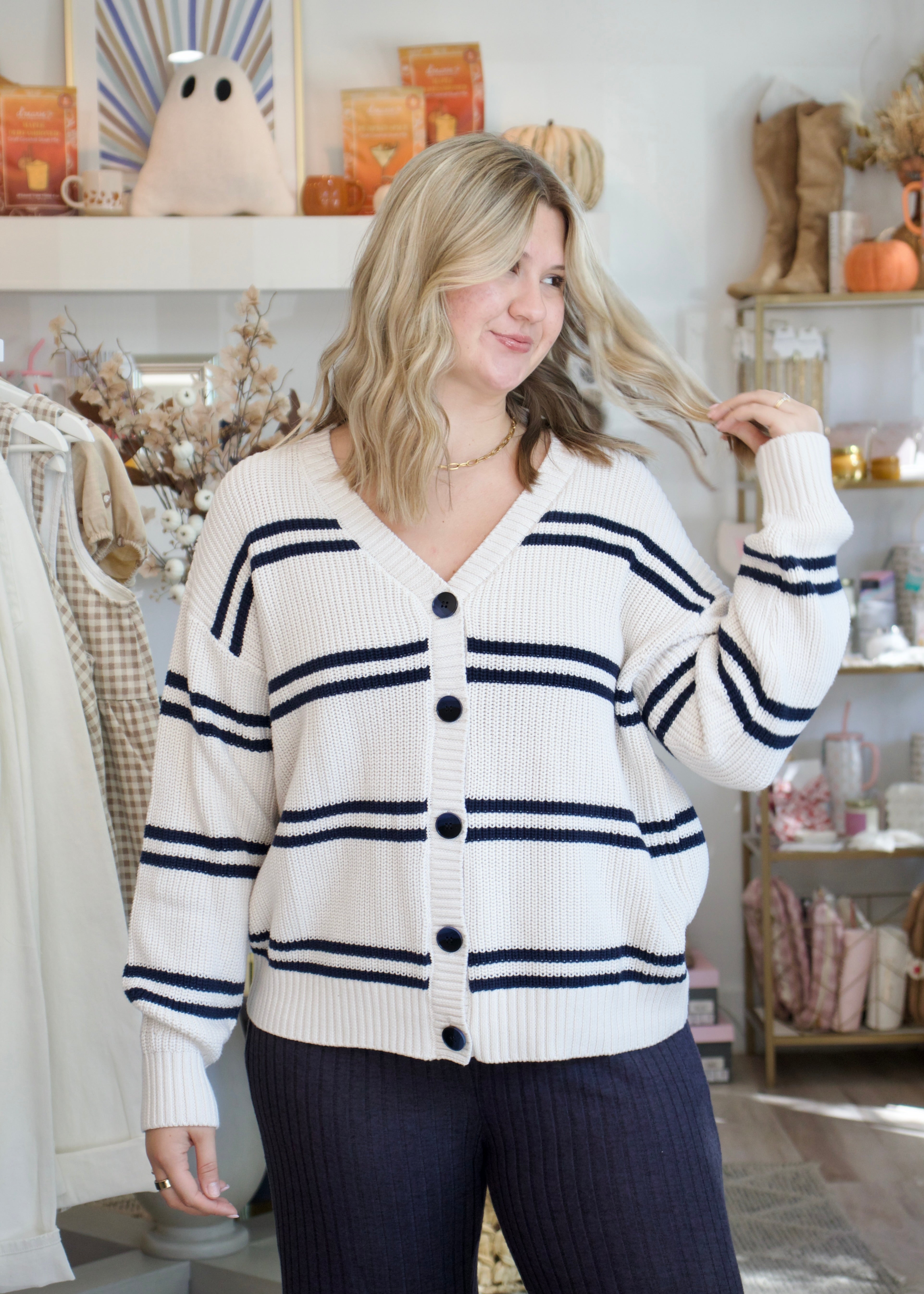 Experience effortless style with the Boyfriend Striped Cardigan by ZSupply. This cozy cardigan features timeless stripes and a front button closure, making it a versatile layering piece. Designed with a relaxed fit, it offers comfort and a casual-chic look perfect for any occasion.
