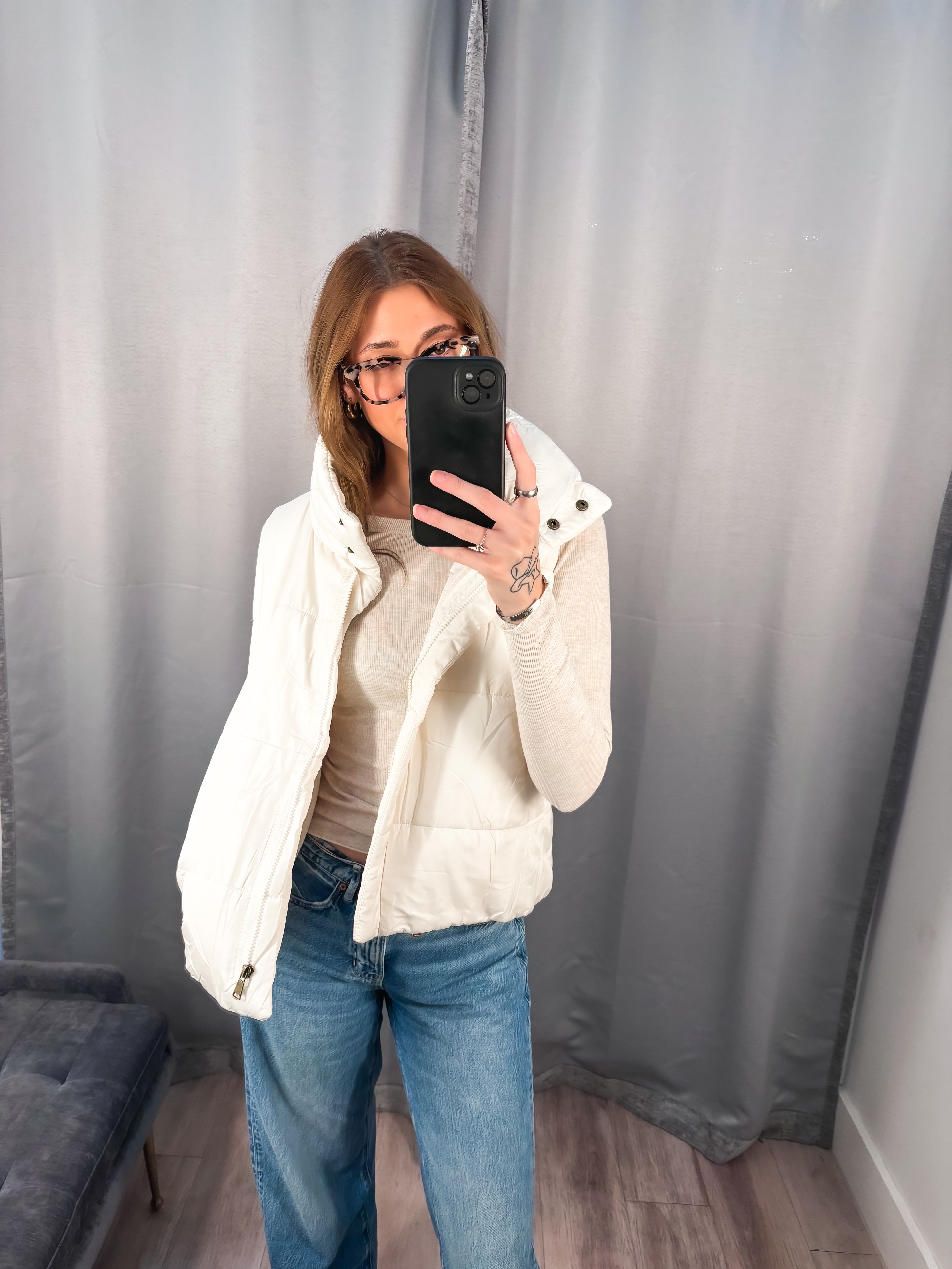 Stay stylish and warm with our BP Puffer Vest in a light off-white color. Perfect for those colder days, this vest will keep you cozy while adding a touch of sophistication to any outfit. Don't sacrifice fashion for warmth - get the best of both with our stylish and practical vest!