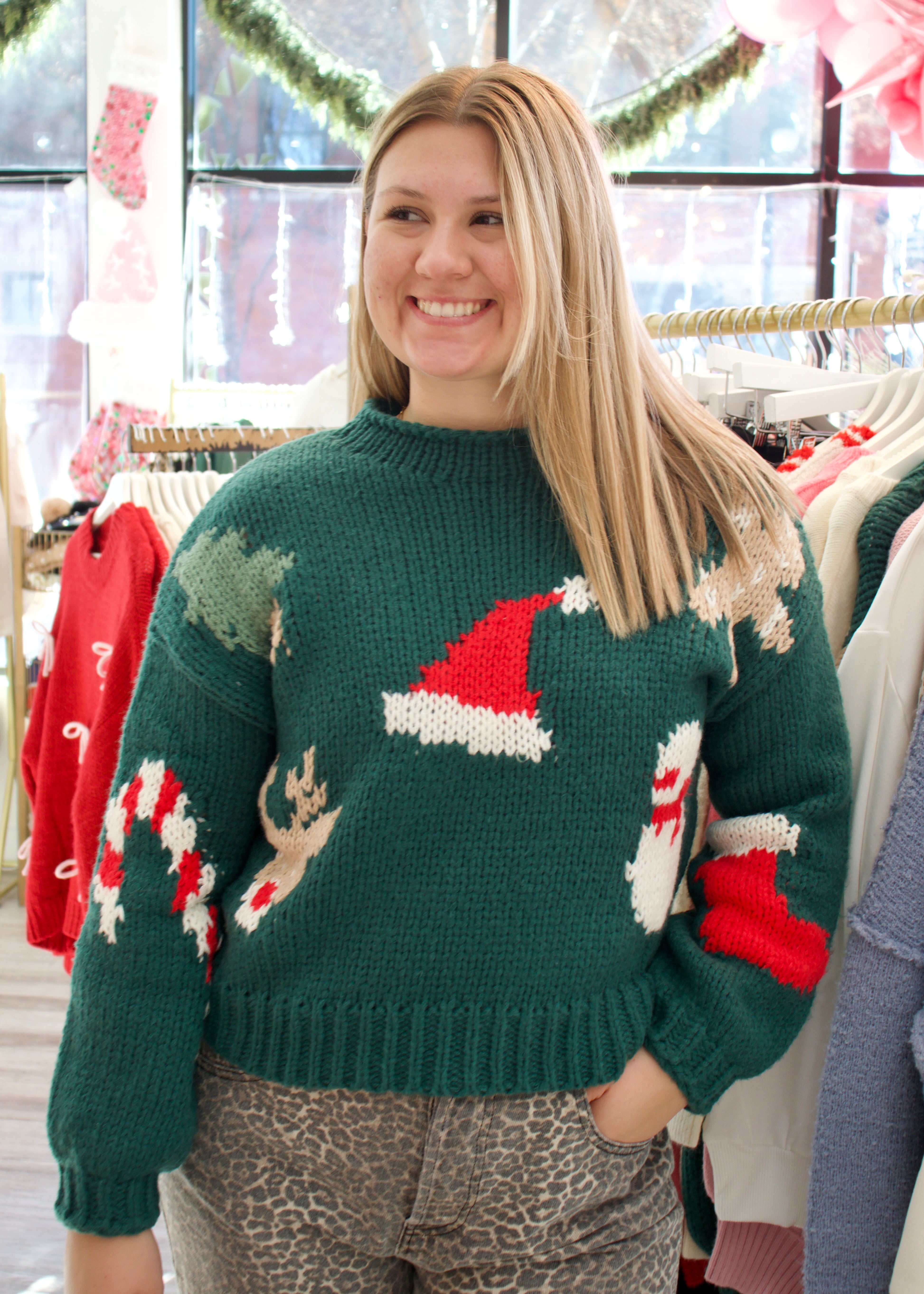 Deck the halls in style with this hunter green knit sweater featuring festive holiday graphics stitched right into the design. Soft, warm, and bursting with seasonal charm, it's the perfect excuse to celebrate in comfort. Whether you're gathering with loved ones or just spreading holiday cheer around town, this cozy knit keeps you feeling merry and bright. A sweater that says "yes, I'm ready for the season"—without trying too hard.