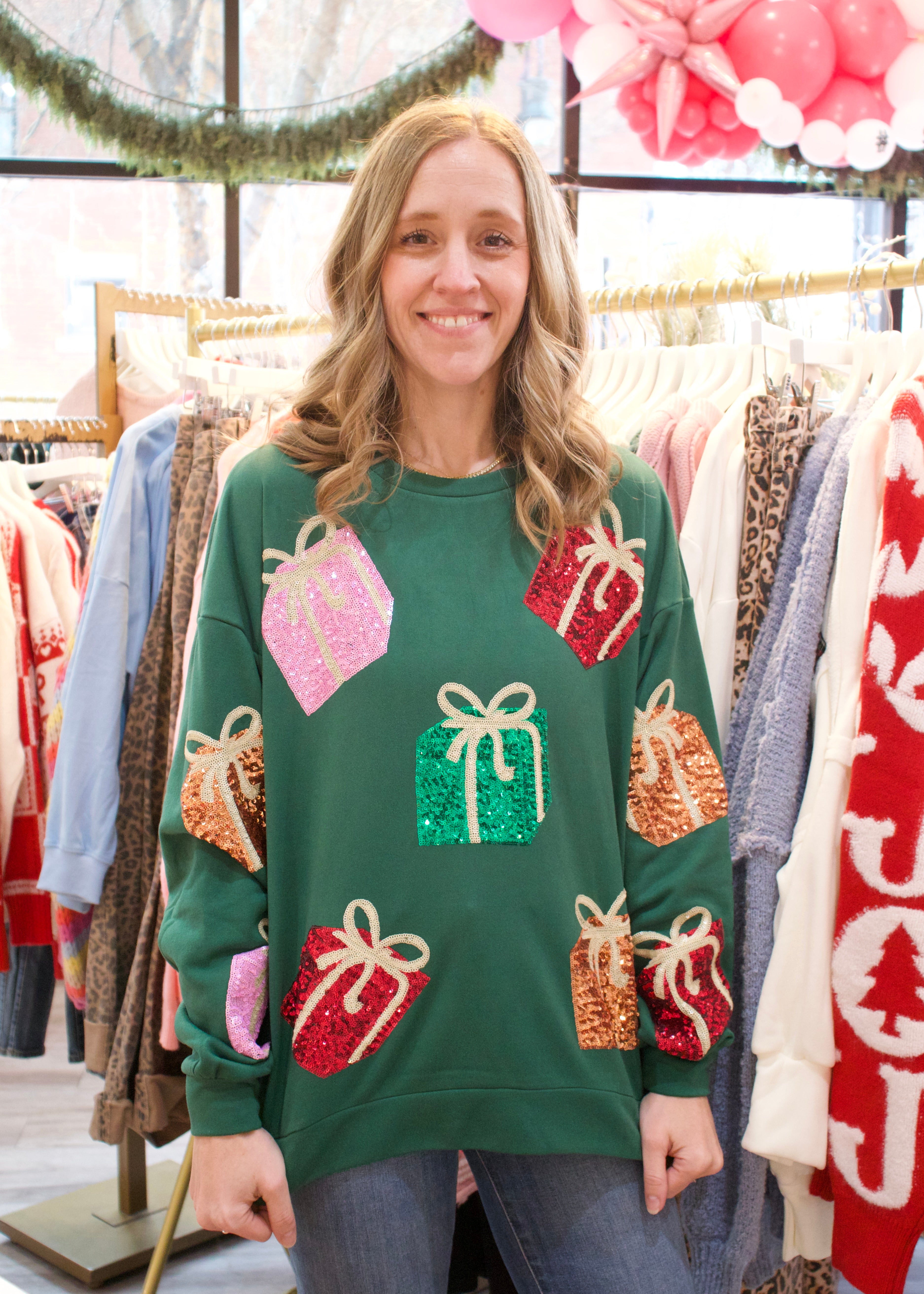 Unwrap the ultimate cozy gift with our Gift Box Pullover! This green sweatshirt features sequin presents, bringing holiday cheer to your wardrobe. Stay warm and stylish this season.