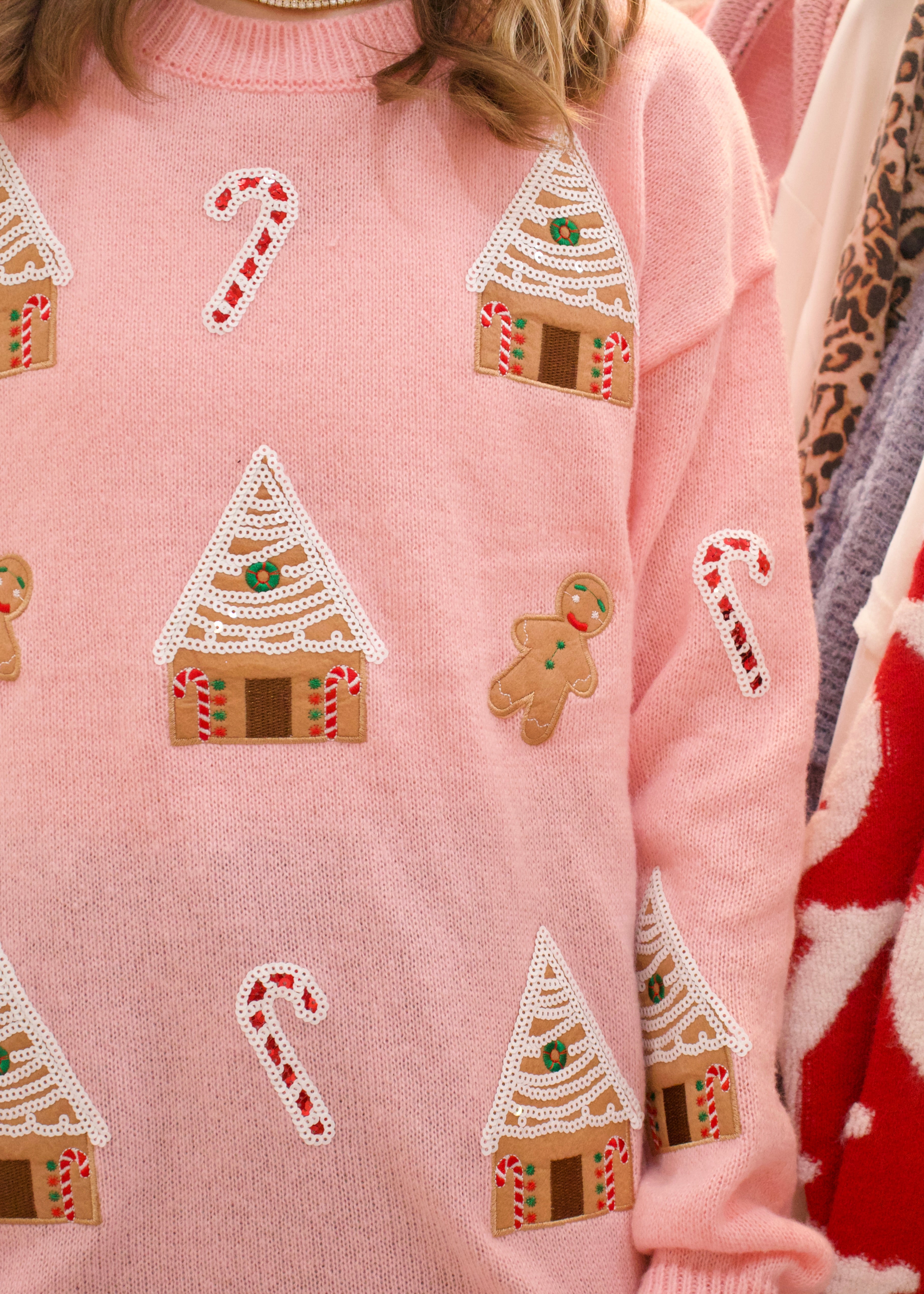 This playful pink sweater is adorned with sequin patches of everyone's favorite holiday treats: gingerbread cookies, houses, and candy canes. Stay warm and stylish with this quirky and unique sweater - perfect for spreading holiday cheer!