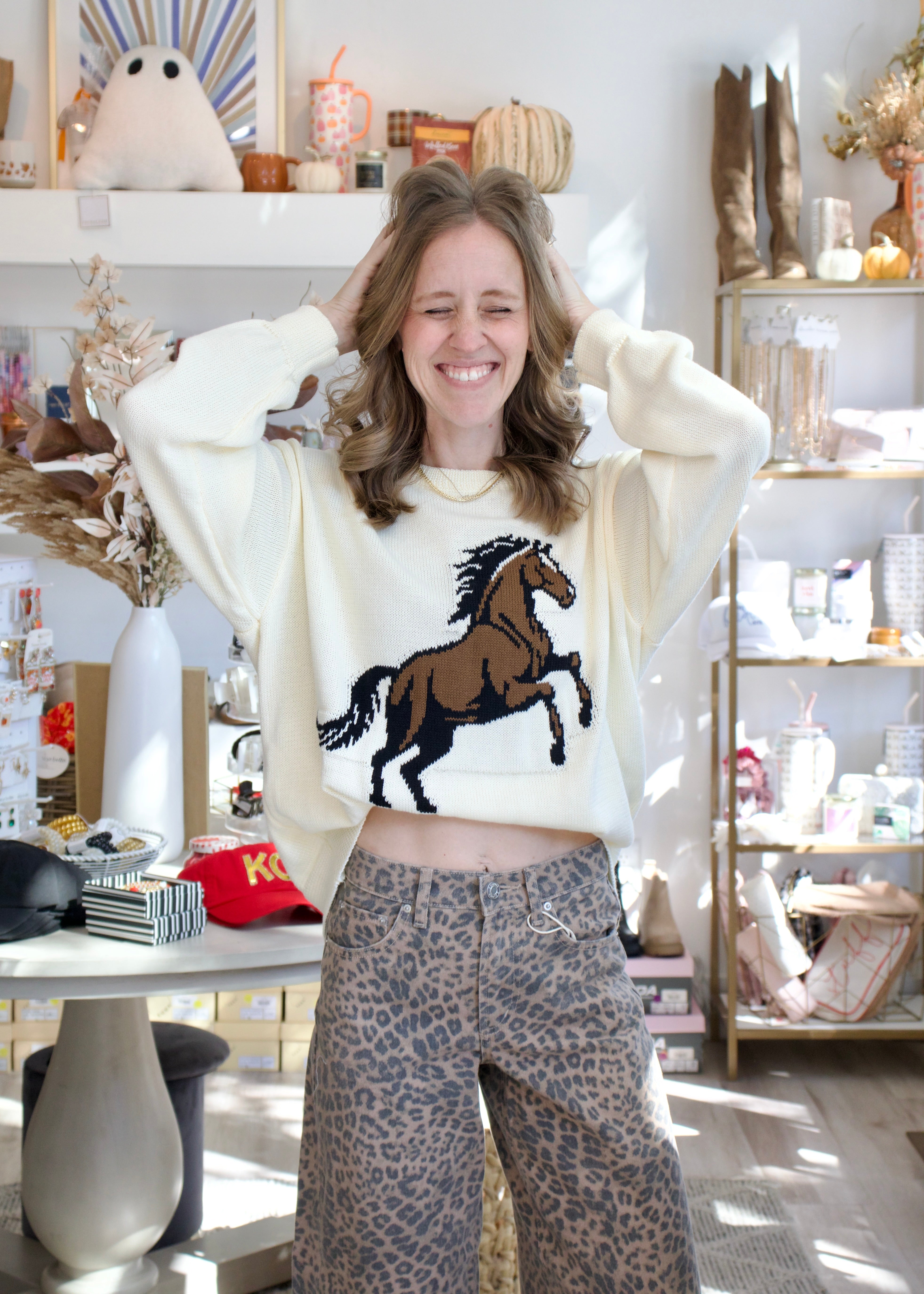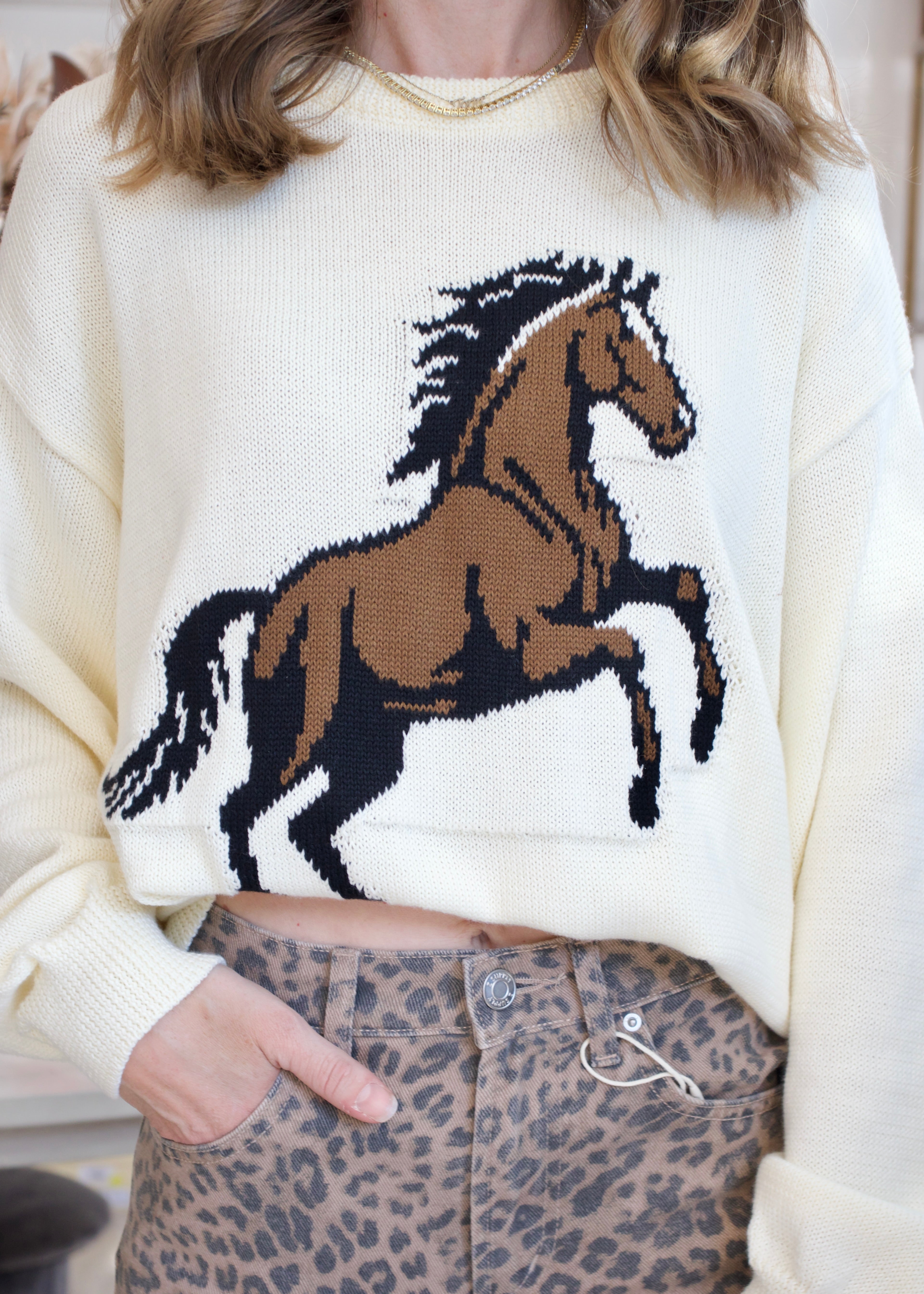 Stay cozy and stylish with our Horse Knit Sweater, featuring a charming horse design that adds a touch of equestrian elegance to your wardrobe. Crafted for warmth and comfort, this sweater is perfect for crisp days, whether you're out riding or enjoying casual outings. Its soft knit fabric ensures a comfortable fit, making it an ideal choice for layering or standalone wear. Embrace timeless style and practicality with this unique piece that speaks to your love for horses and fashion.