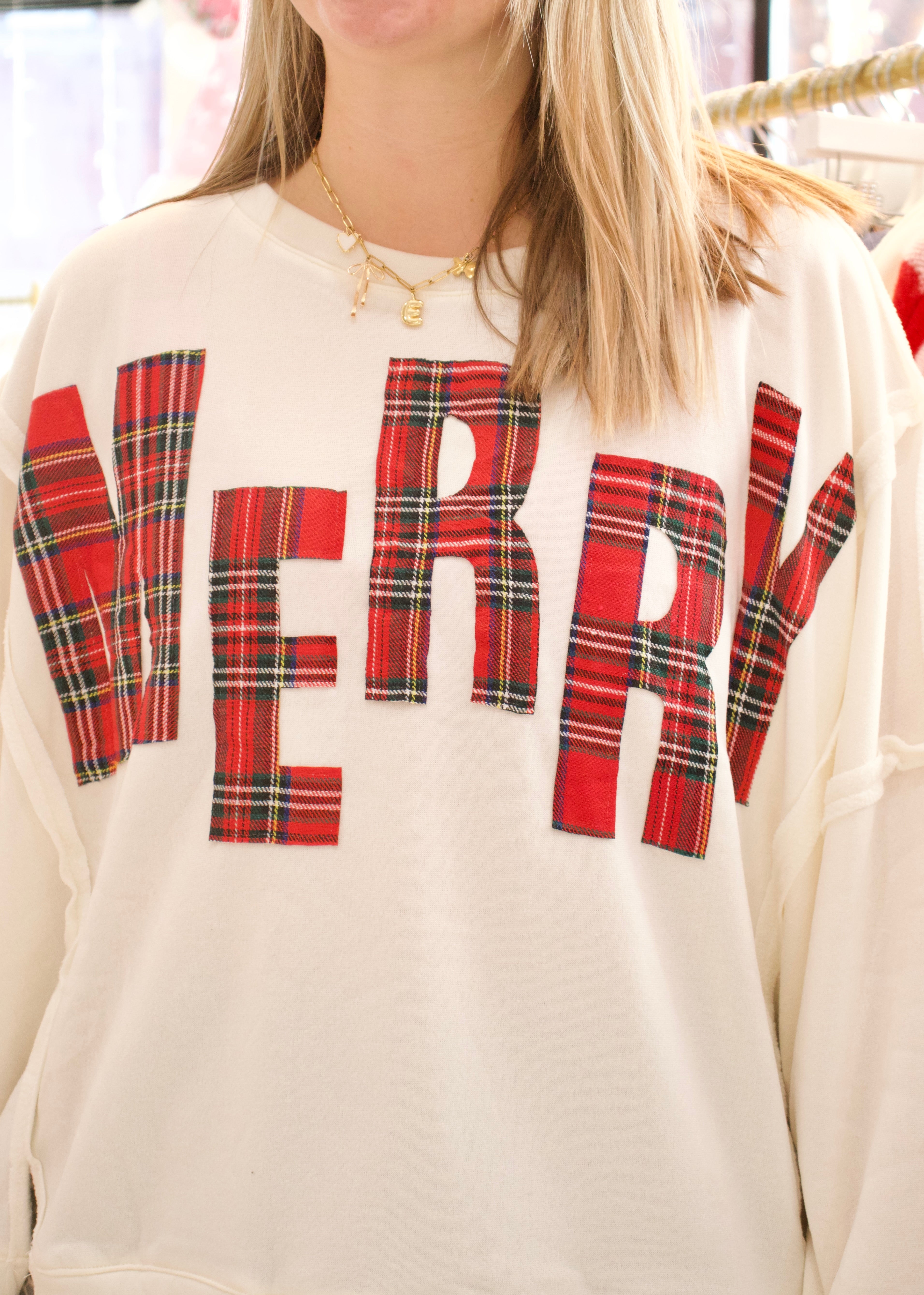 Get cozy and festive in this oversized white sweatshirt featuring bold "MERRY" lettering in cheerful plaid. Soft, spacious, and bursting with holiday spirit, this fleece piece is your new favorite for everything from lazy mornings to festive gatherings. The playful plaid lettering adds visual interest while the relaxed fit keeps you feeling comfortable and free. Simple, joyful, and perfectly on-brand for the season—this sweatshirt says it all.