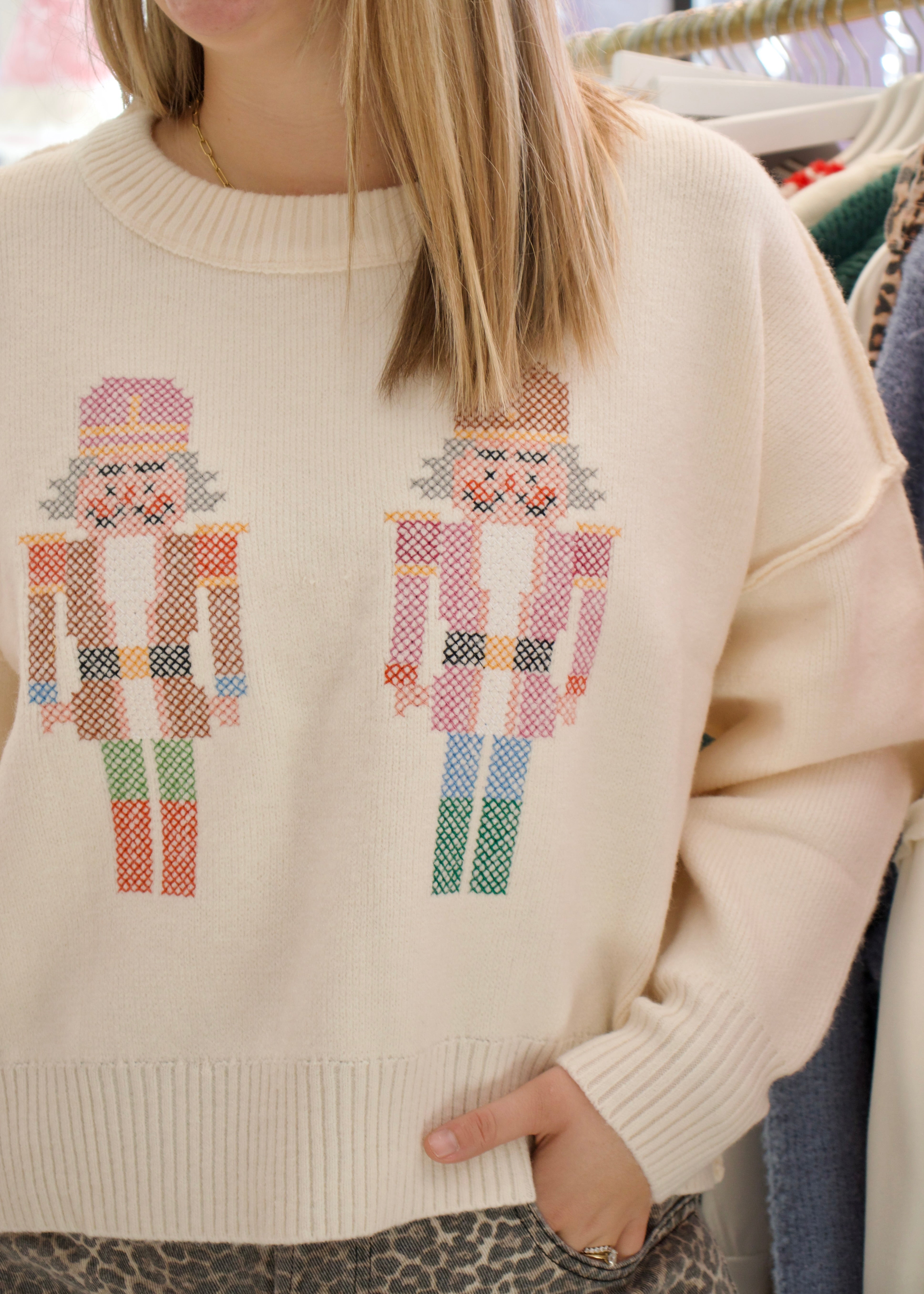 Embrace the magic of the season in this cream holiday sweater featuring beautifully embroidered nutcrackers. Soft, inviting, and brimming with festive spirit, this piece brings understated elegance to your holiday celebrations. The delicate nutcracker embroidery adds just the right amount of seasonal charm without overwhelming your look. Perfect for creating cozy memories, whether you're gathered around the tree or out spreading holiday cheer. A sweater that feels like a warm hug wrapped in holiday tradition.