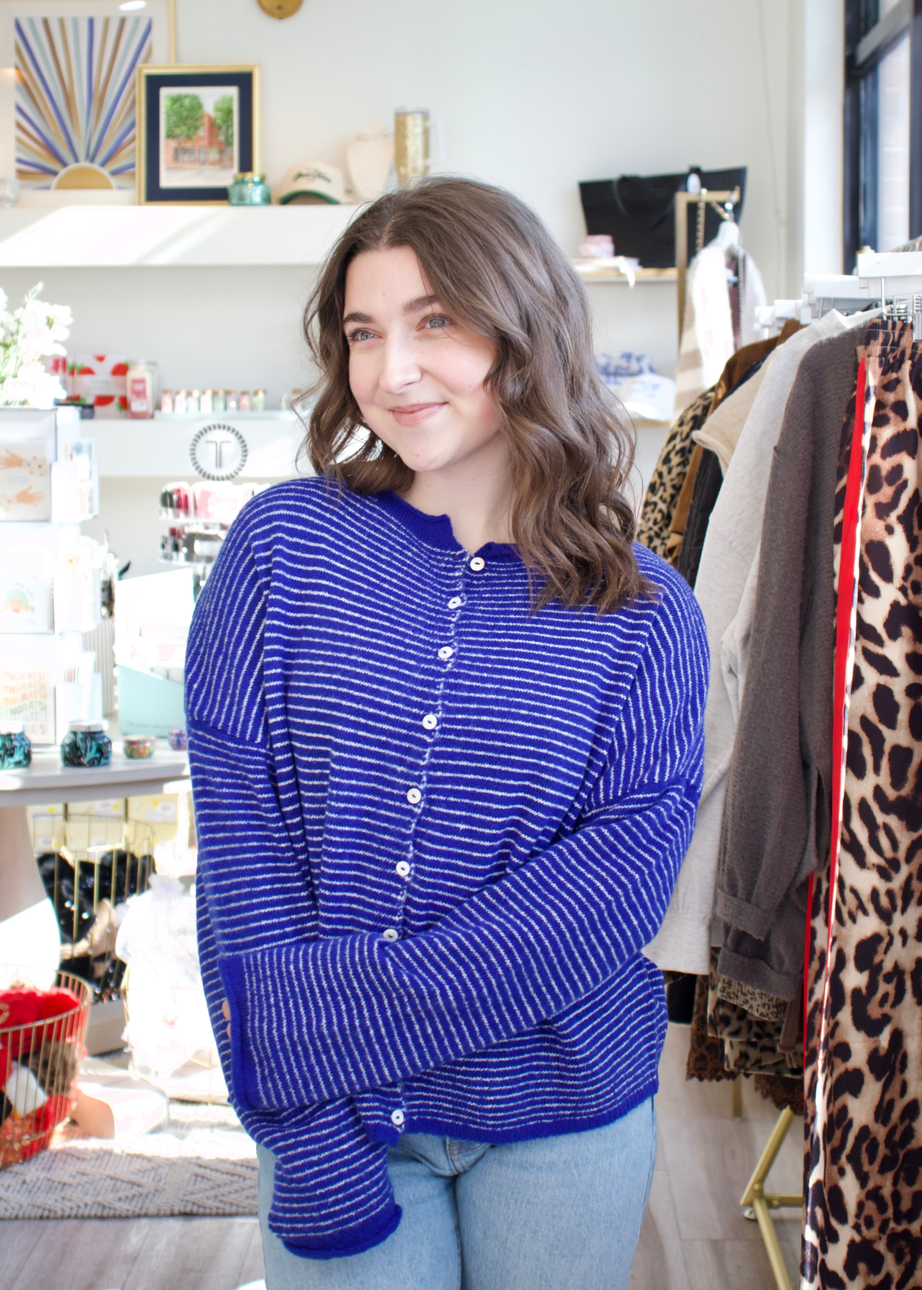Slip into effortless style with the Pin Stripe Piper Cardigan in royal! This oversized beauty features classic pin stripes that add visual interest while the relaxed fit keeps you cozy all day long. Perfect for layering over your favorite tee or dress, it's the go-to piece for casual Fridays and weekend hangouts. Soft, comfortable, and undeniably chic—your new wardrobe staple awaits!