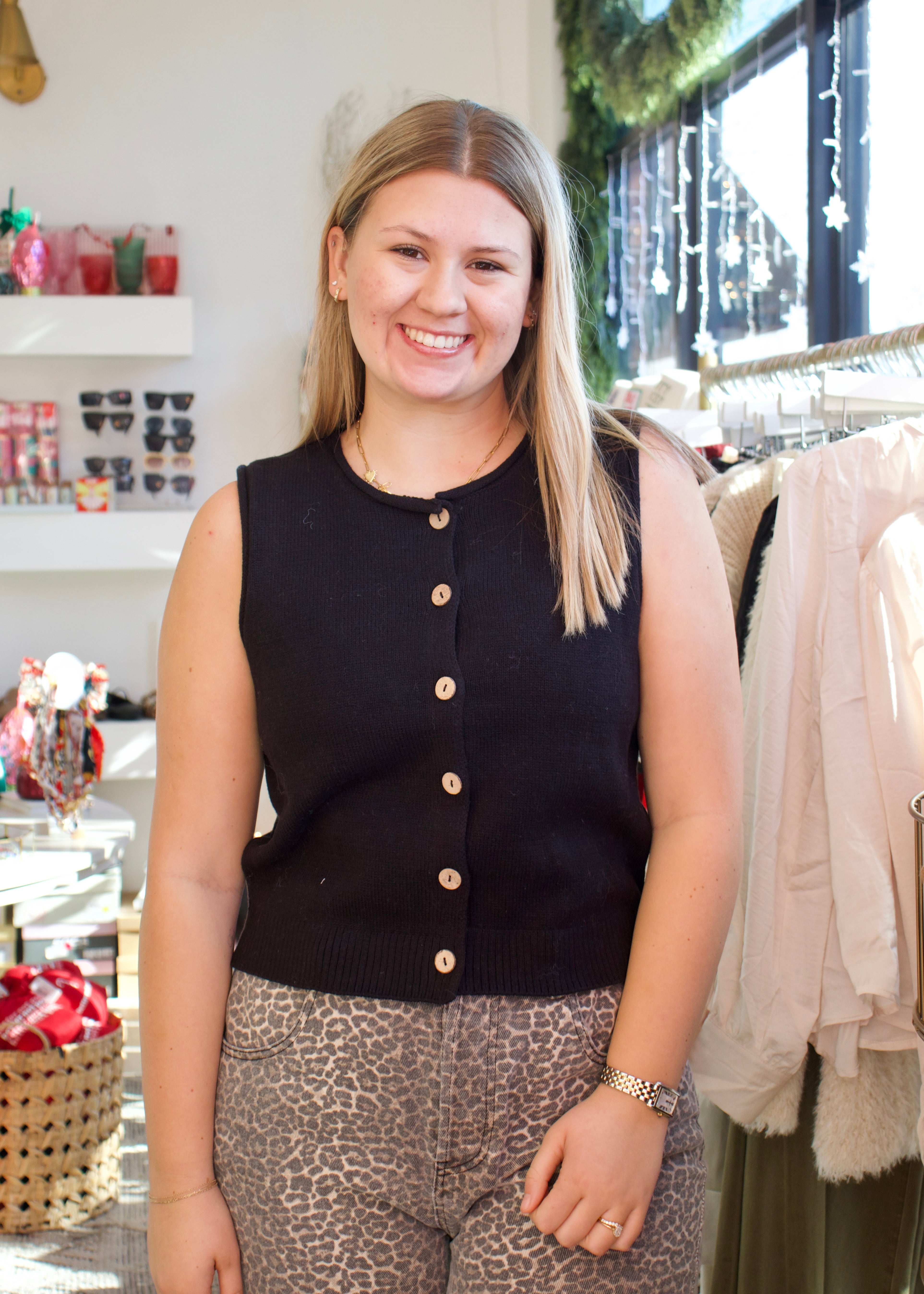 Layer up with effortless style in this raw knit cardigan vest. The sleek black design pairs perfectly with everything in your closet, while charming button details add just the right touch of personality. Lightweight enough for layering but substantial enough to stand alone, this versatile piece transitions seamlessly from casual weekends to polished weekday looks. A wardrobe essential that works as hard as you do.